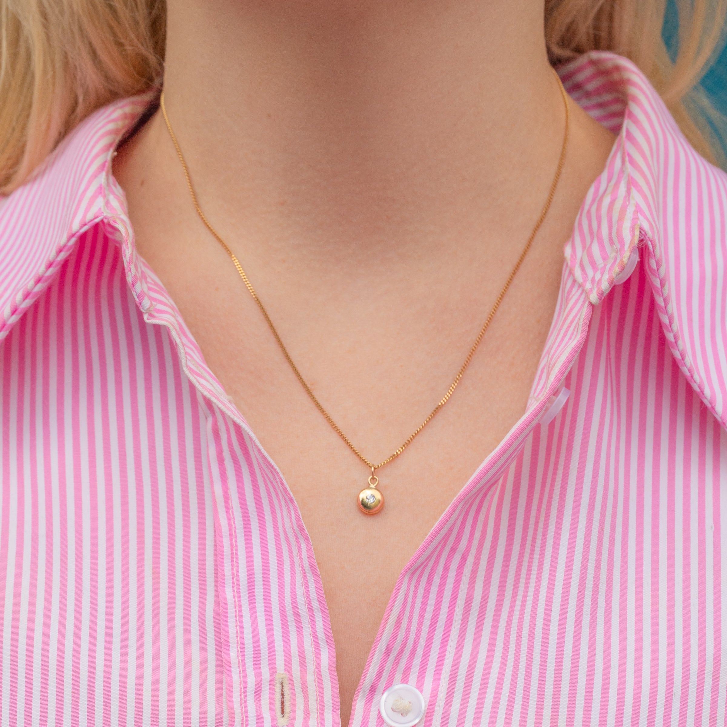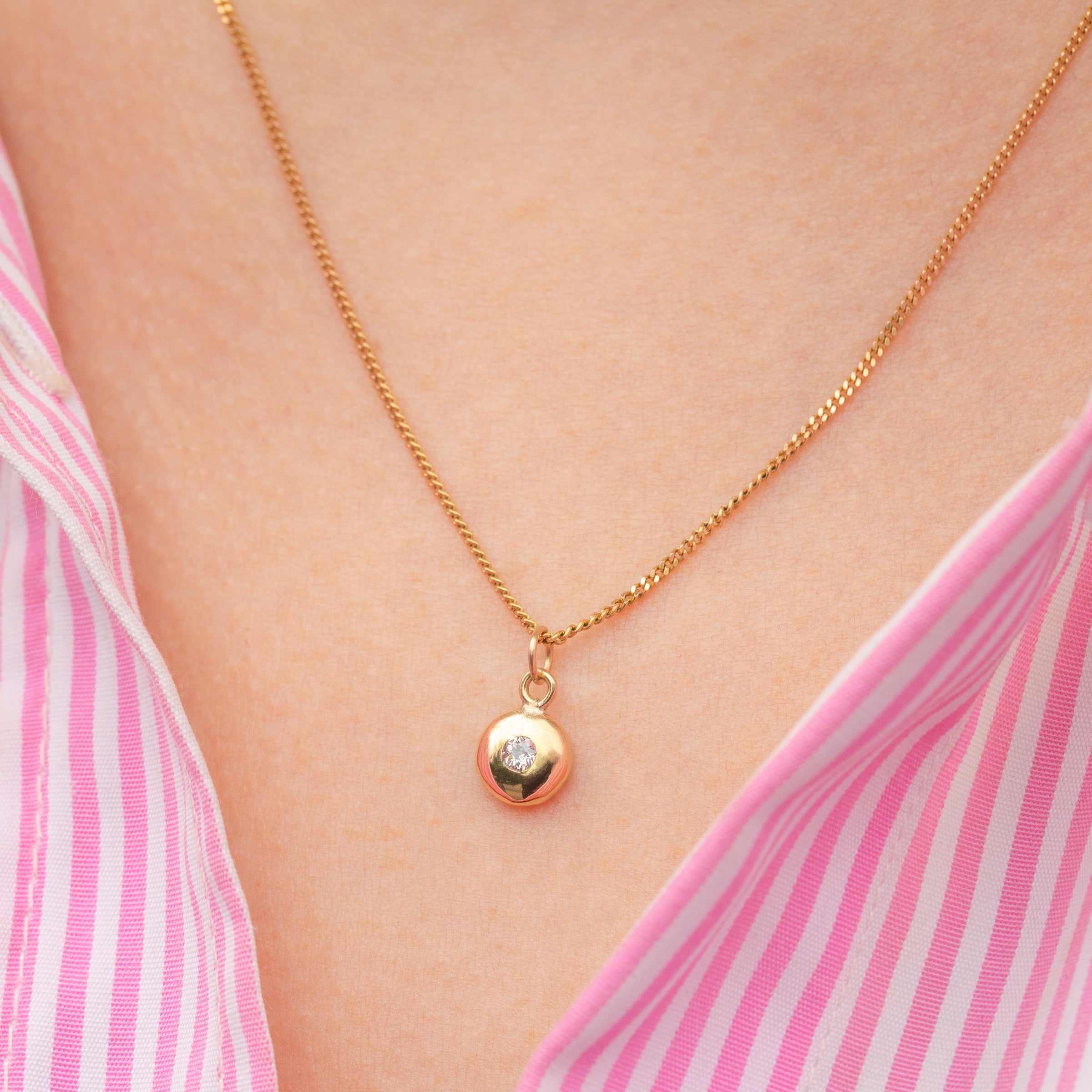 VERY GOOD-EXCELLENT. This antique 18ct Gold puffy Diamond set charm is in wonderful condition. The Diamond sits securely within it's setting, with no damage to note. The Gold has a buttery saturation throughout and has maintained a lovely domed form. There are a couple of light surface marks to the back of the charm but nothing that is of concern. With a jump-ring, you can wear with the utmost confidence!