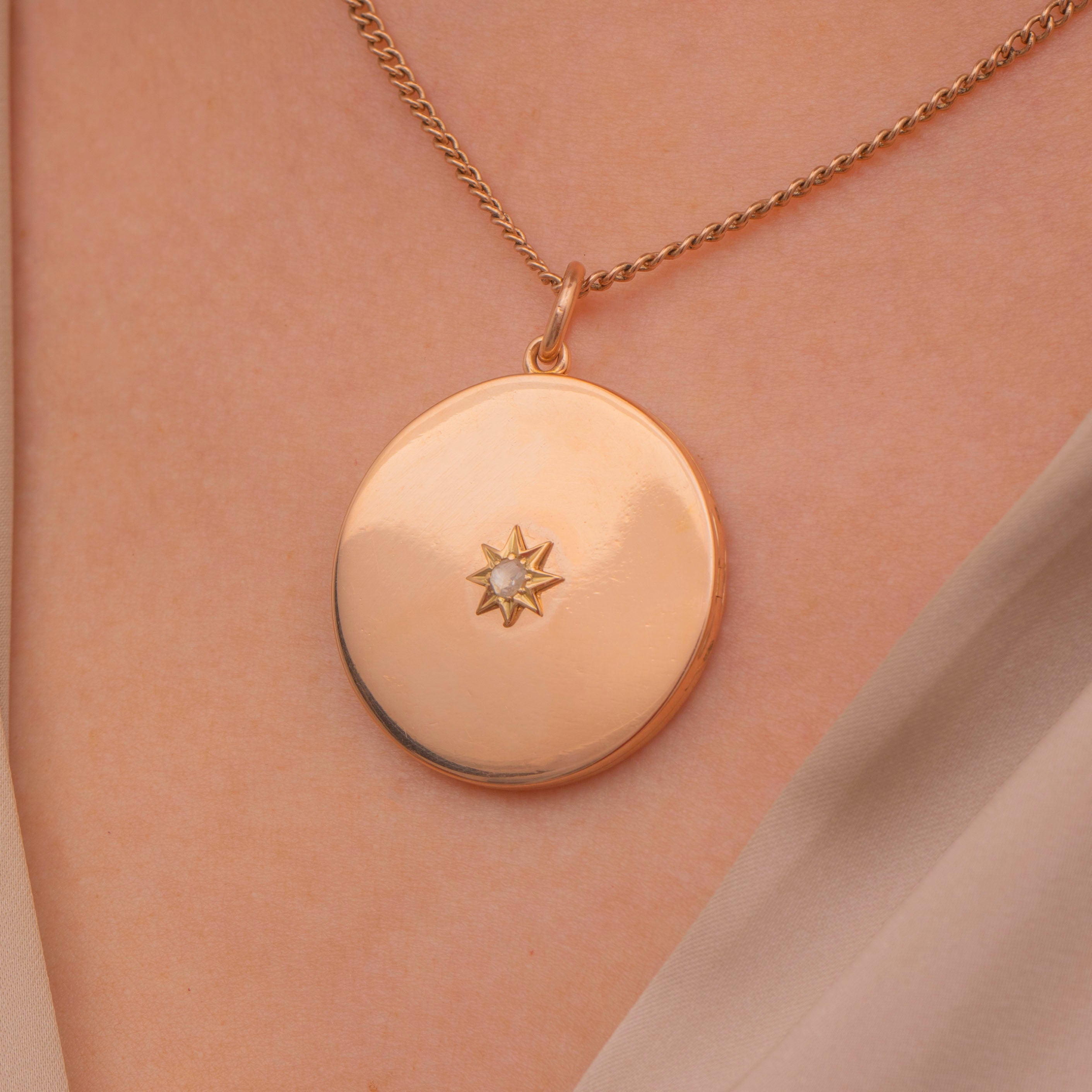 Crafted from sumptuous 15ct Gold, this large celestial locket features a twinkling rose-cut Diamond flush set within a bold star. With space to fit a large photo inside, you can keep your treasured loved ones close to your heart!