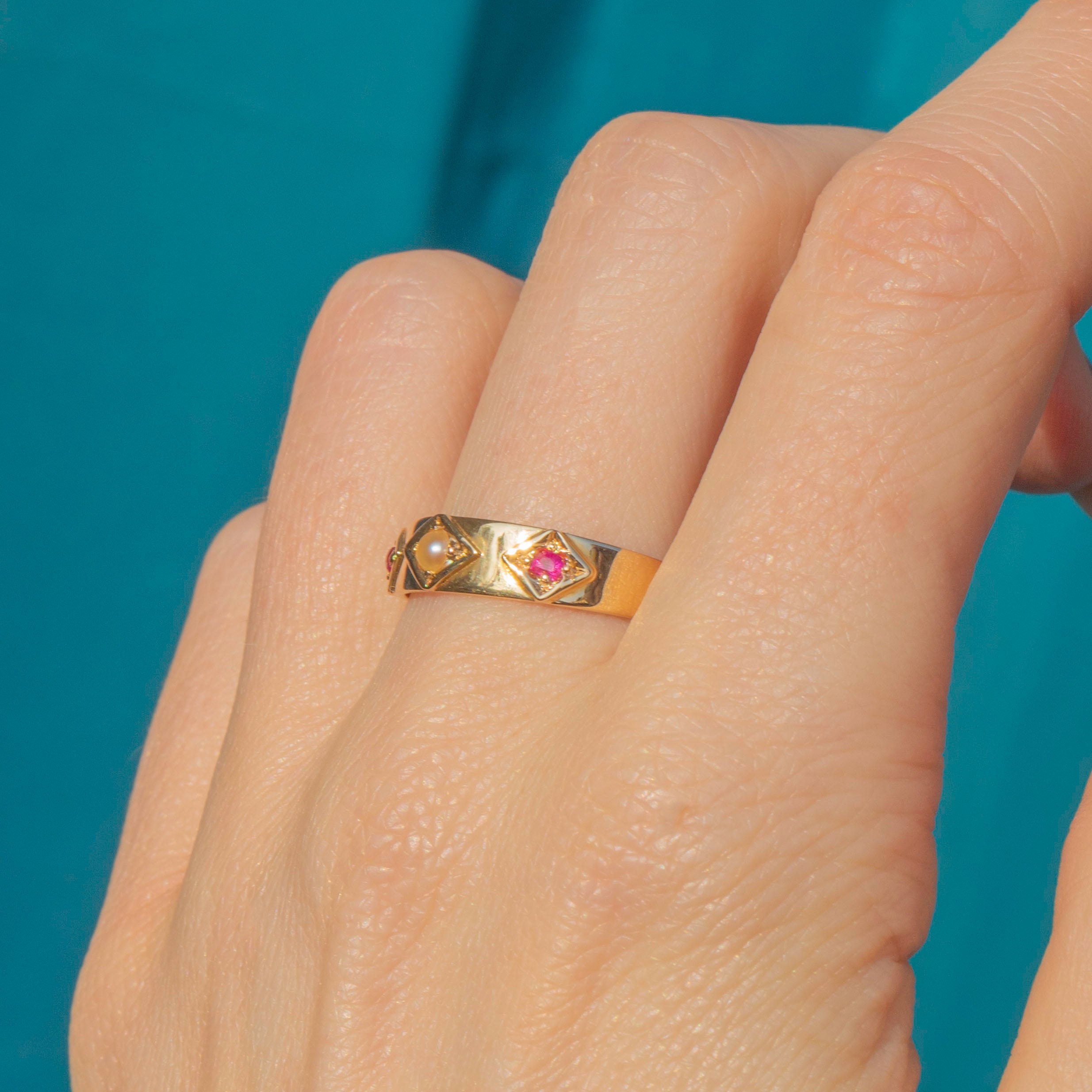 Add Victorian allure to your ring stack with this delightful antique 15ct Gold Ruby Pearl gypsy ring! Her saturated 15ct Gold band displays a gorgeous trio of gemstones, with an iridescent Pearl in the centre, flanked by two juicy pink-red Rubies.