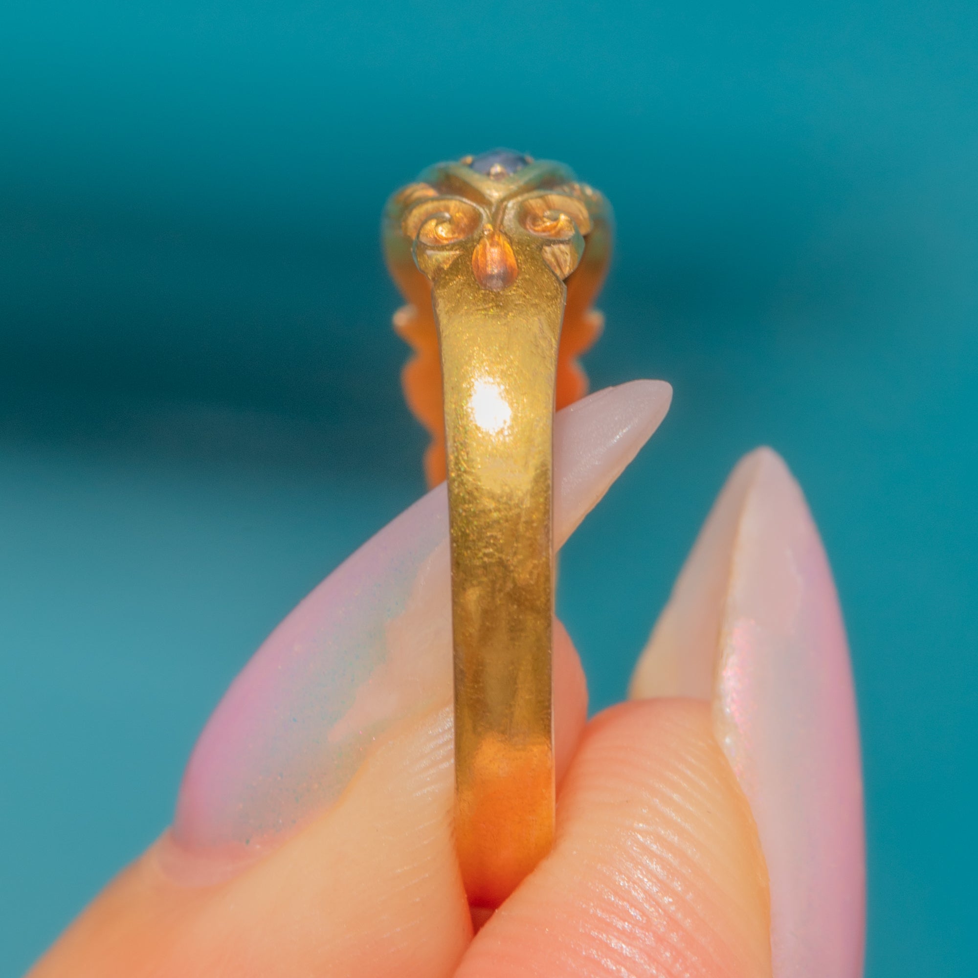In her centre sits a scintillating Diamond flanked by Sapphires, each gemstone gleaming with a gorgeous radiance as they catch the light. These Victorian gemstones sit within bold settings, giving this antique ring a decadent charm.