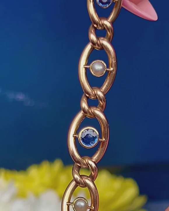 Antique 15ct Gold Sapphire Pearl Curb Link Bracelet