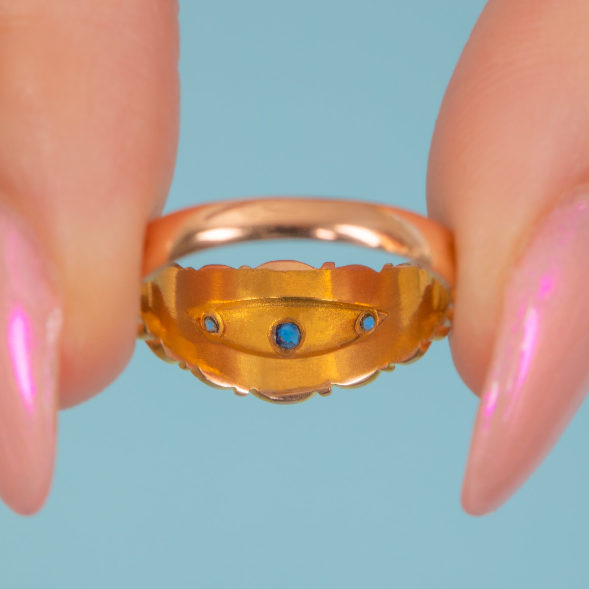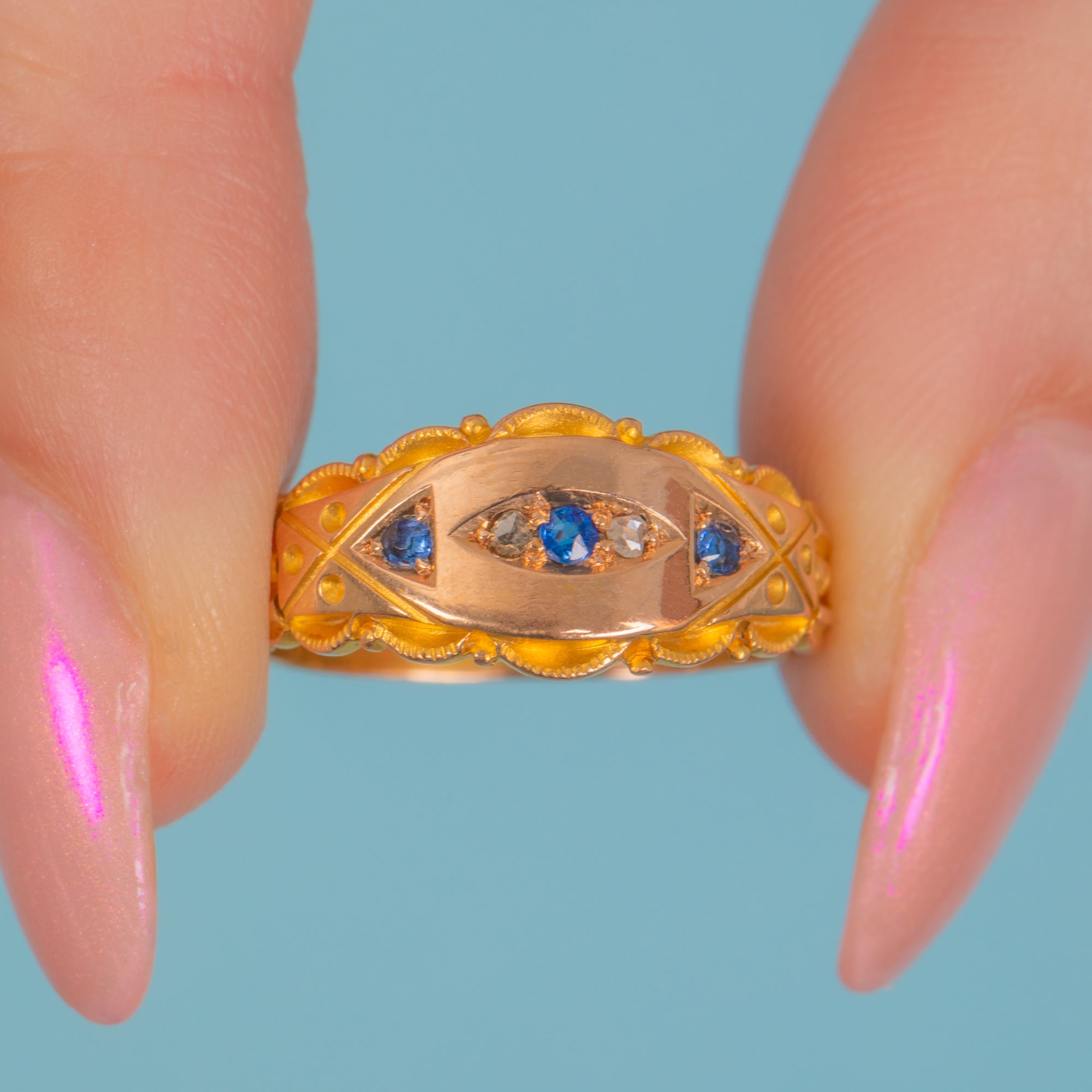 Our hearts have been captured by this stunning antique 15ct Gold Sapphire rose-cut Diamond gypsy ring! This Edwardian beauty hosts one of our favourite gemstone combinations, Sapphire and Diamond, in a classic and timeless gypsy ring style.