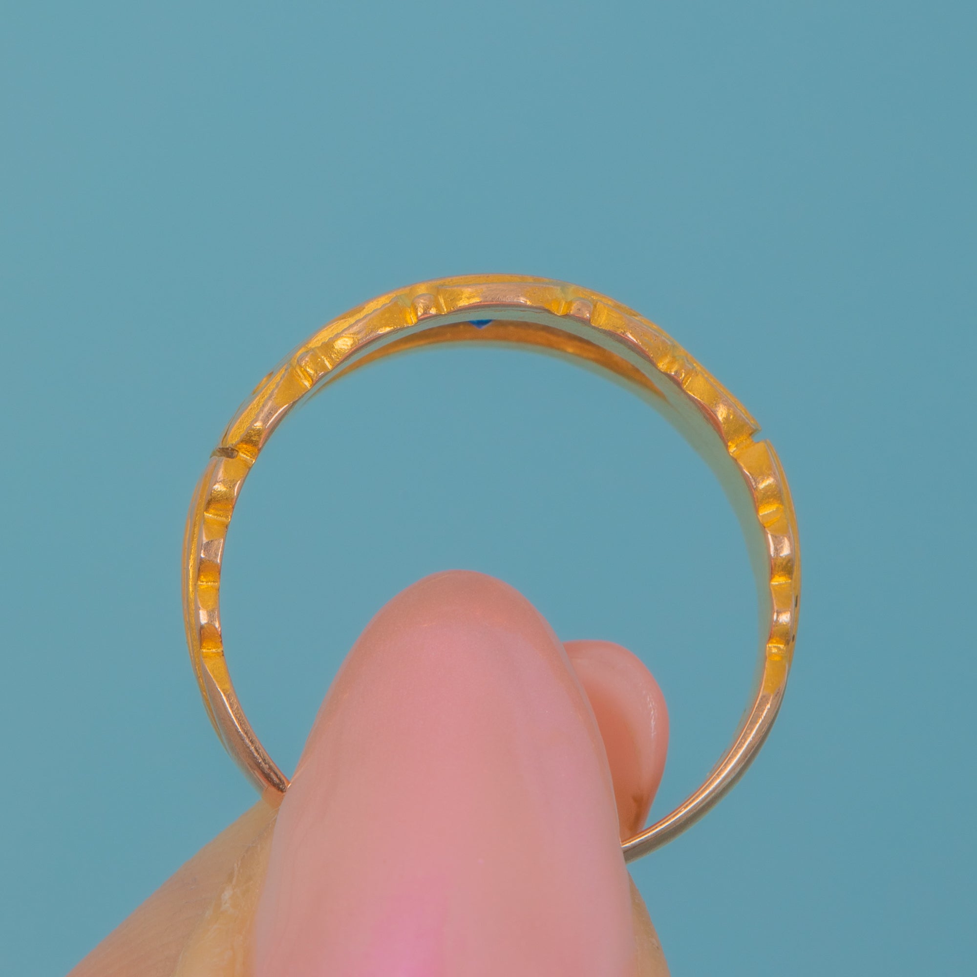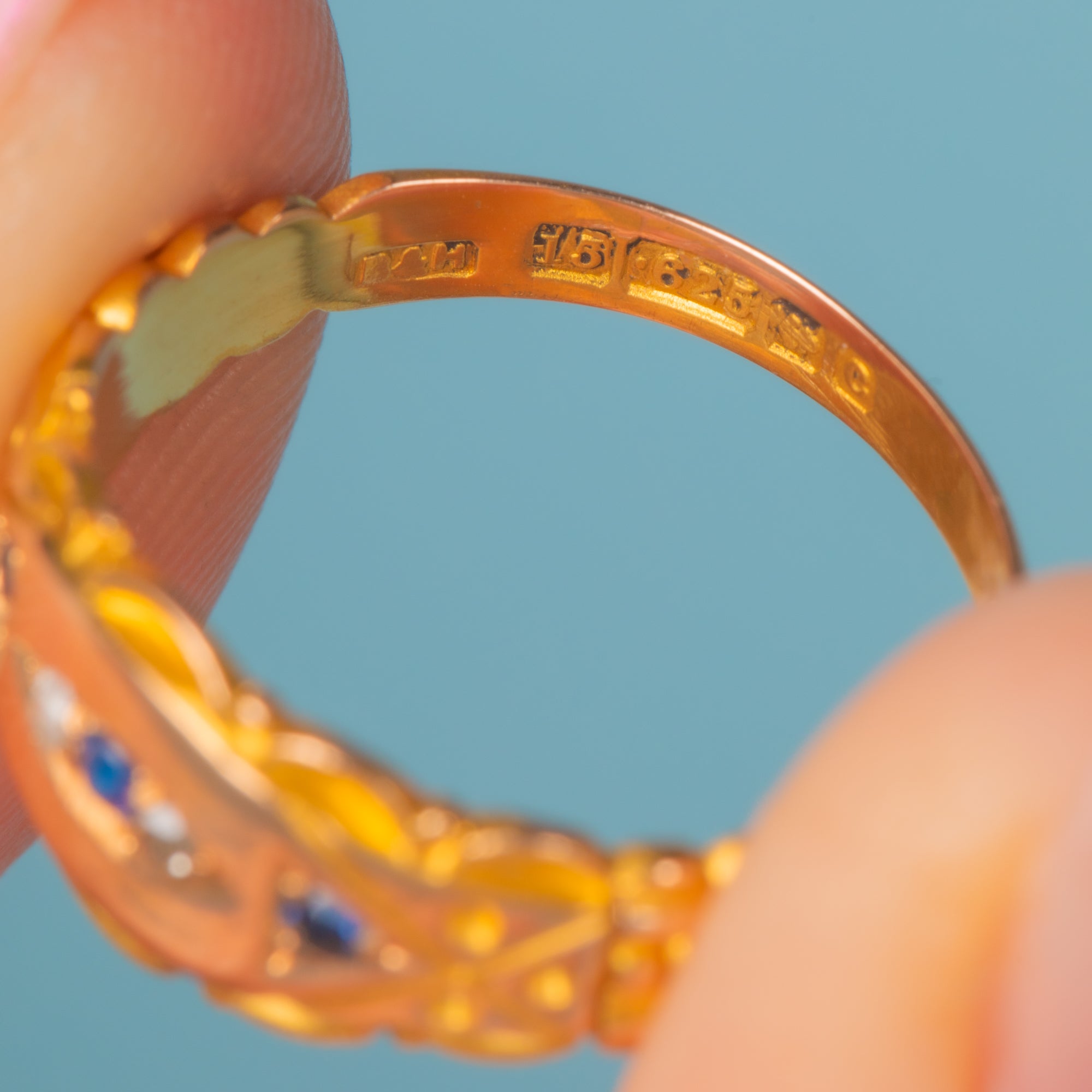 EXCELLENT. This antique 15ct Gold Sapphire Diamond gypsy ring is in excellent condition. This piece has a lovely selection of antique gemstones and is fully hallmarked to the year 1902. The ring has only minor surface wear which is only noticeable under a jeweller's loupe. The gemstones are all held securely in their flush settings and the band has retained its shape remarkably well over the past century.