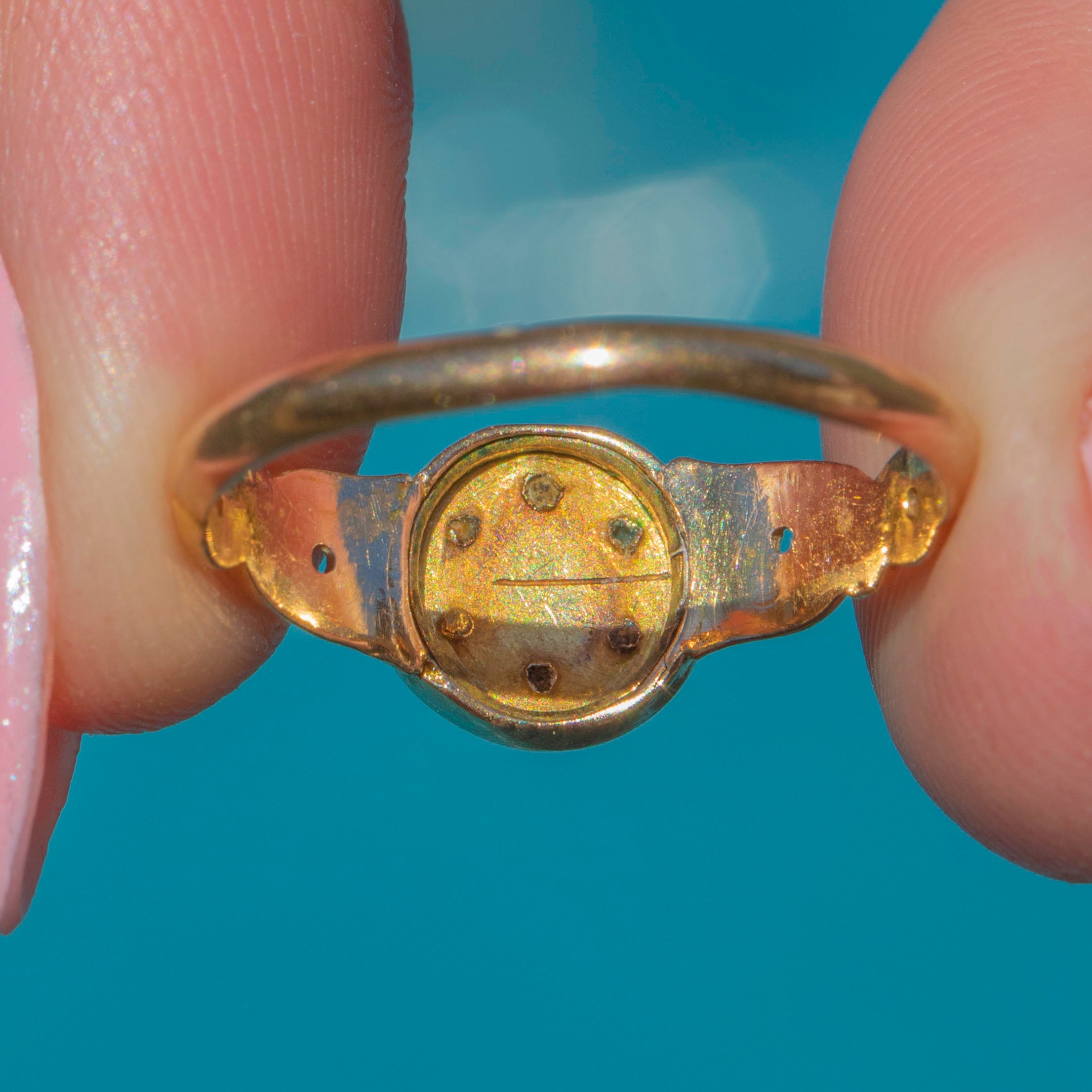 We adore her naturally differing Turquoise hues which emulate a sweet forget-me-not flower, encased within buttery antique 15ct Gold. Bring a pop of colour to your outfit with this striking Victorian ring adorning your finger!