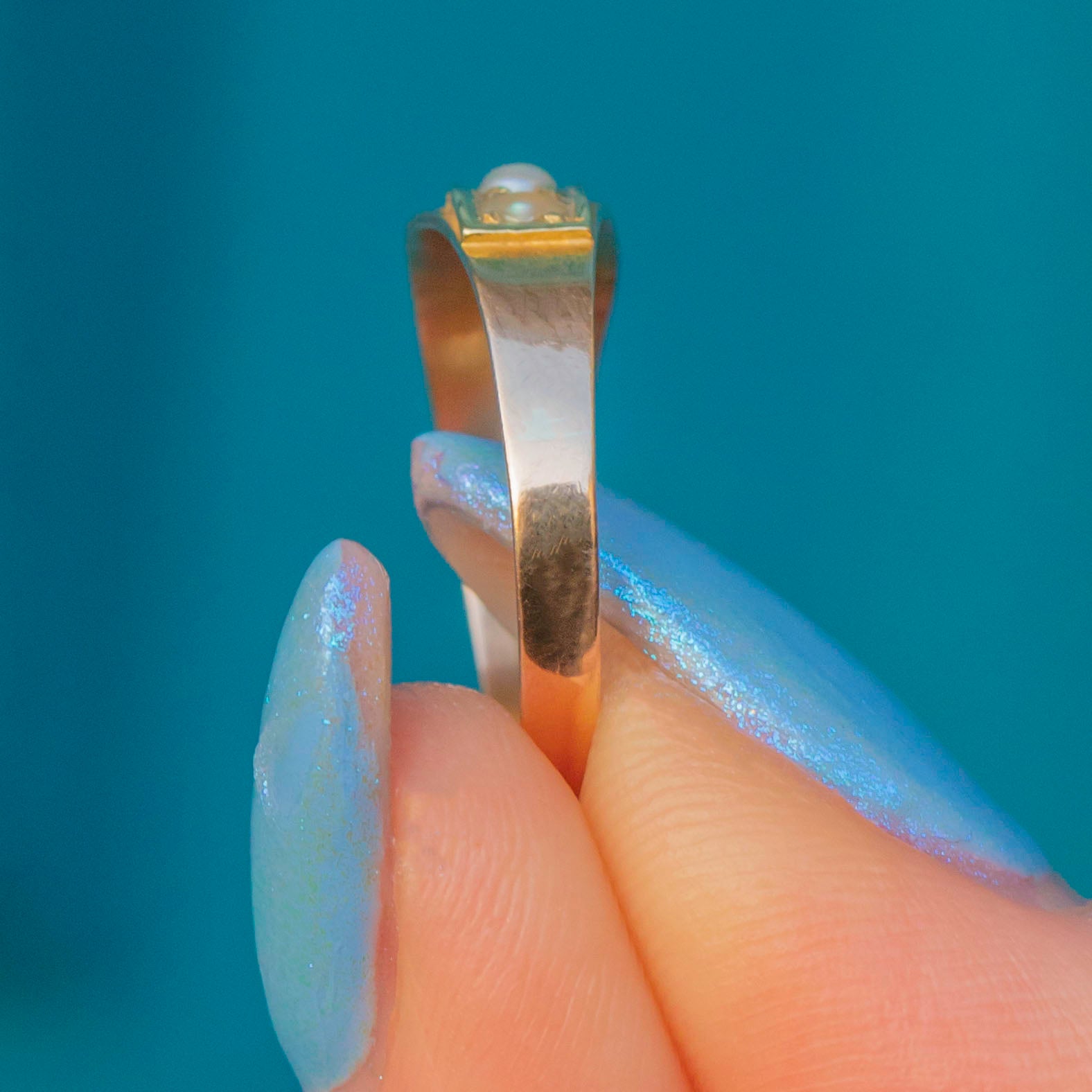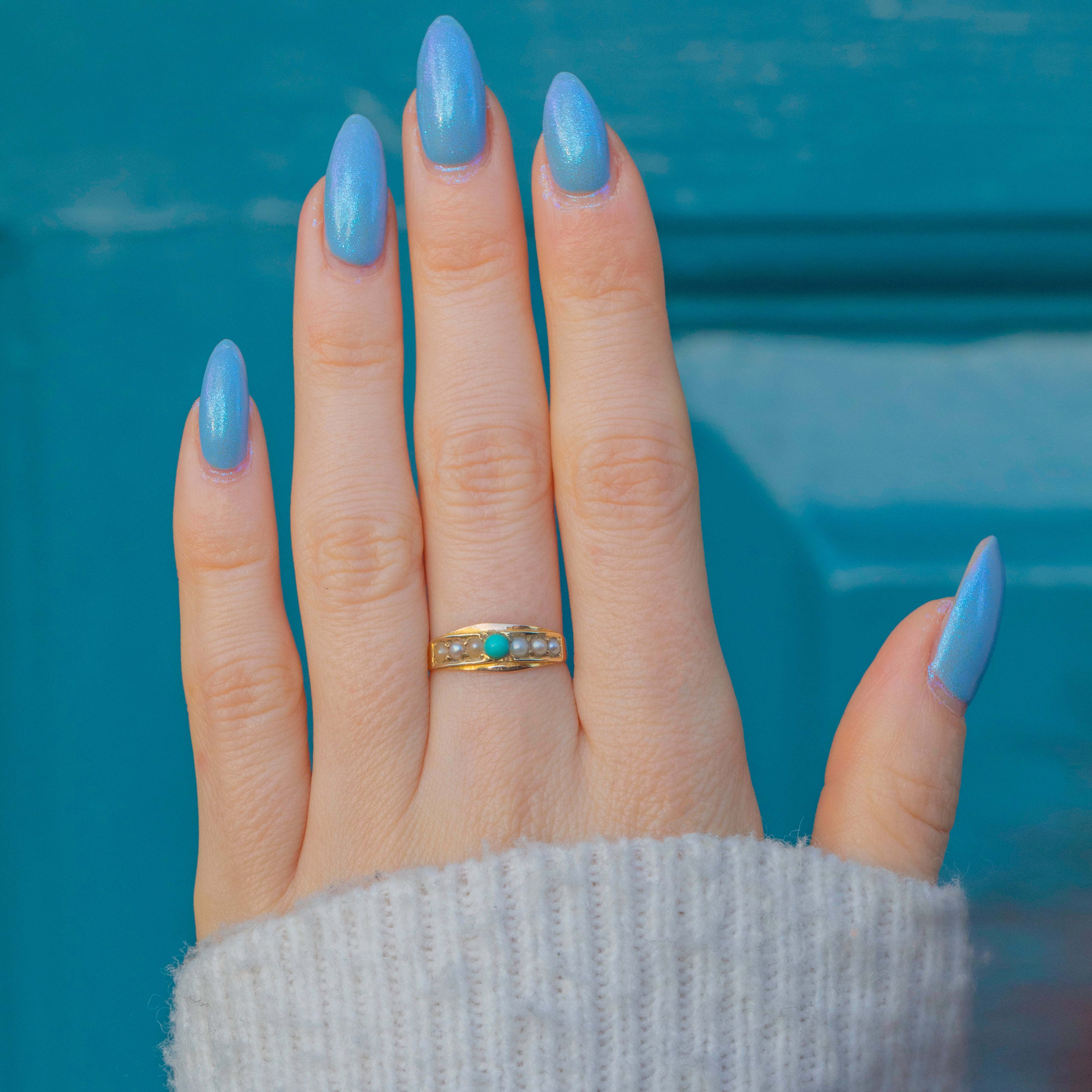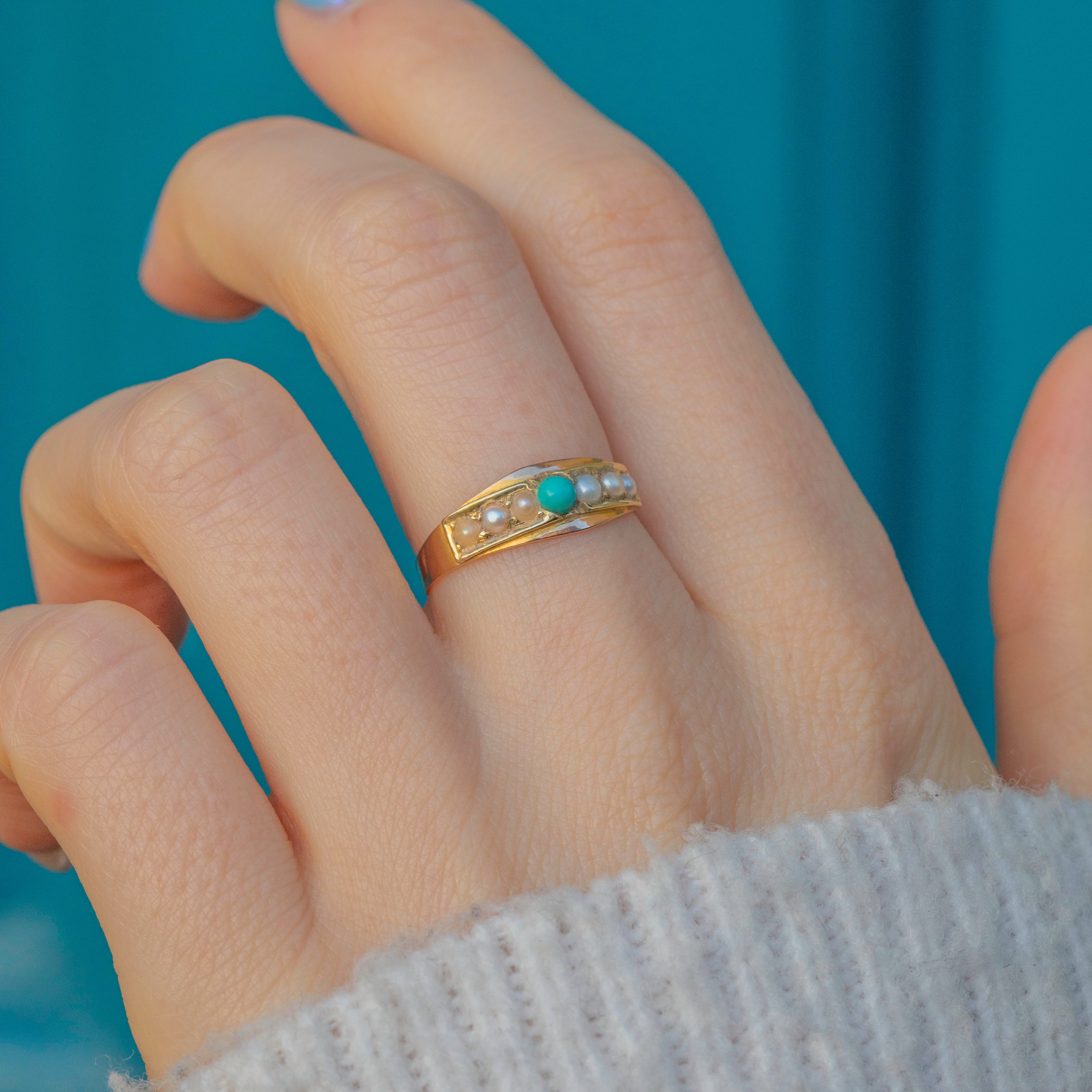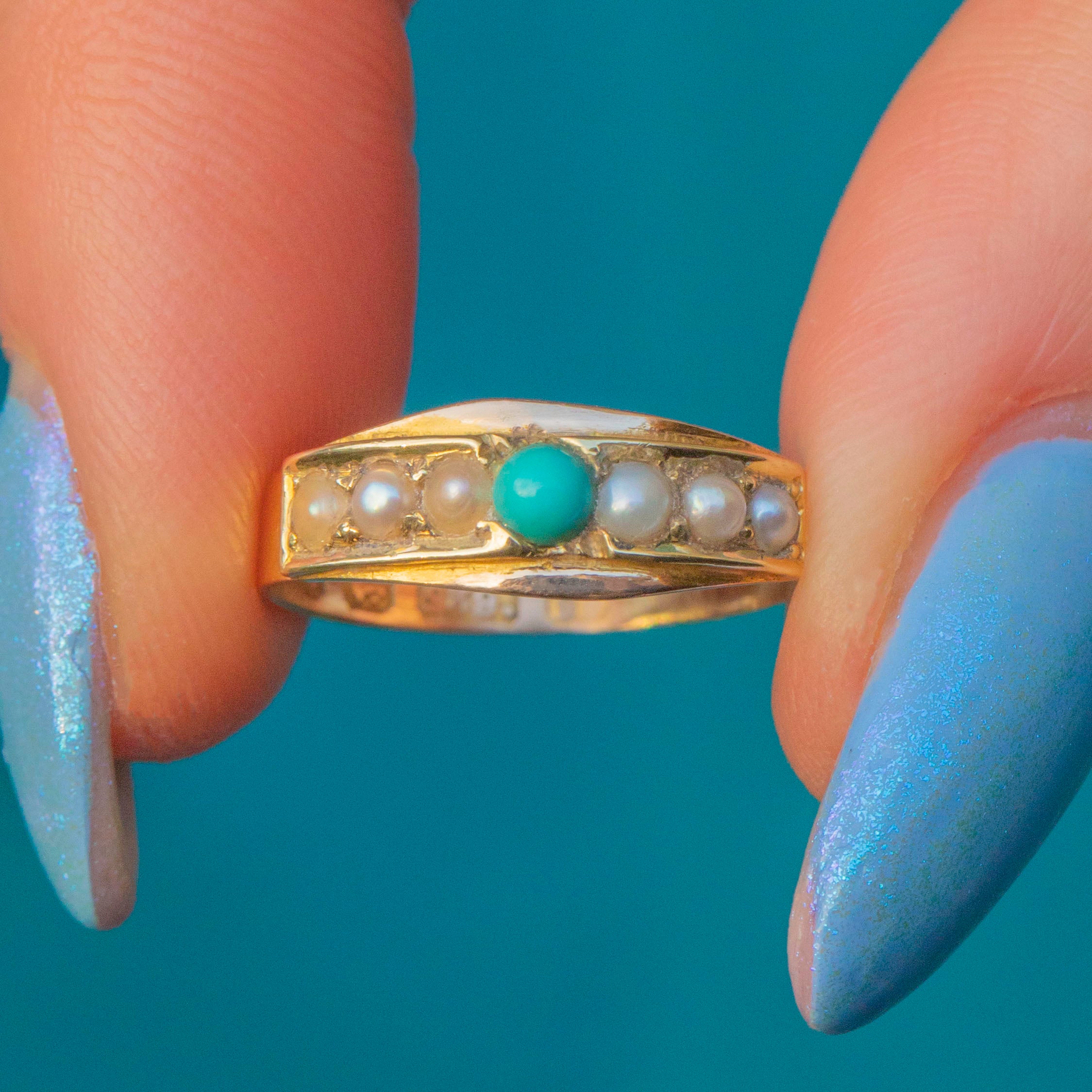 VERY GOOD-EXCELLENT. This Victorian 15ct Gold Turquoise Pearl stacking ring is in lovely condition overall. The stones are securely set and the Turquoise retains its vibrant duck egg blue hue, while the Pearls display a lovely crisp white tone. There is only gentle wear to the Pearls, which does not detract from the beauty or wearability of this stunning antique piece. Due to the nature of Pearls, we would recommend avoiding wet and humid conditions while wearing this piece, which will ensure that you can enjoy it for many more years to come!