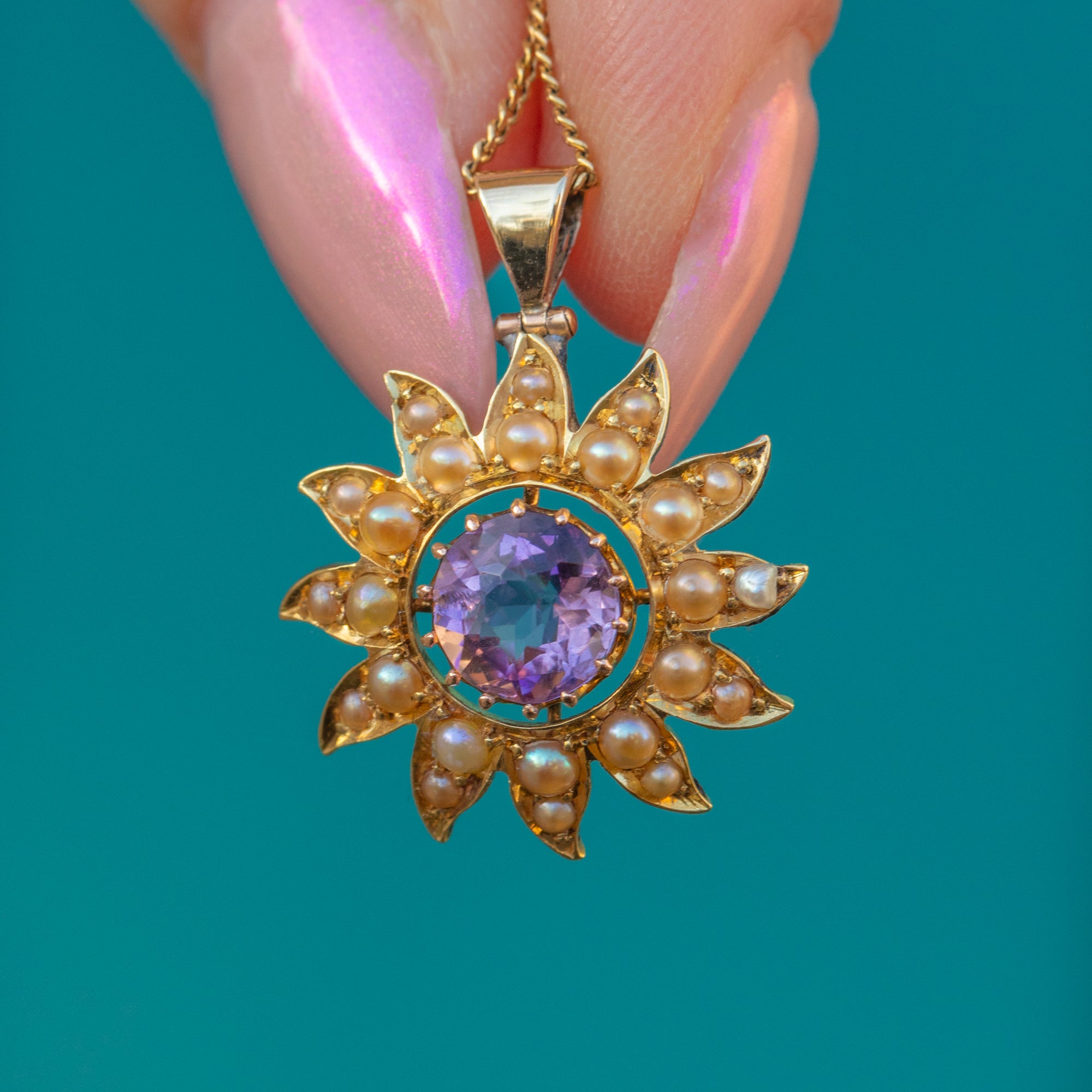 Antique 18ct Gold Amethyst Pearl Flower Pendant, 0.90ct