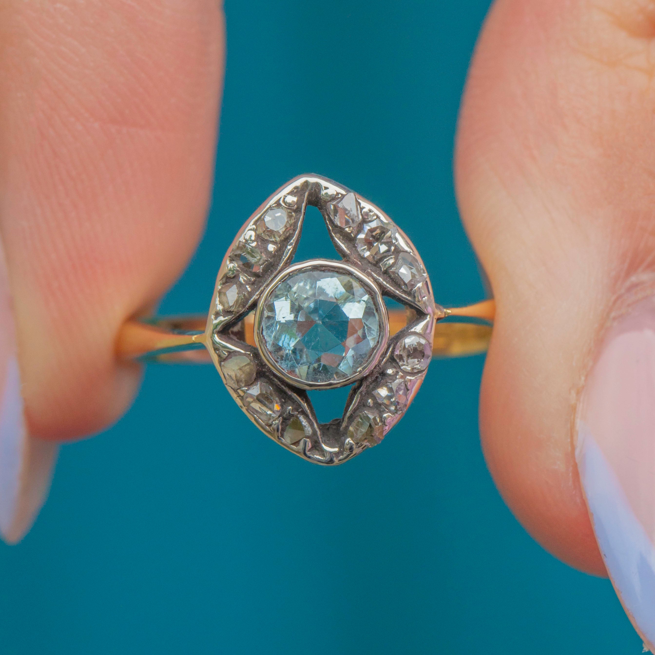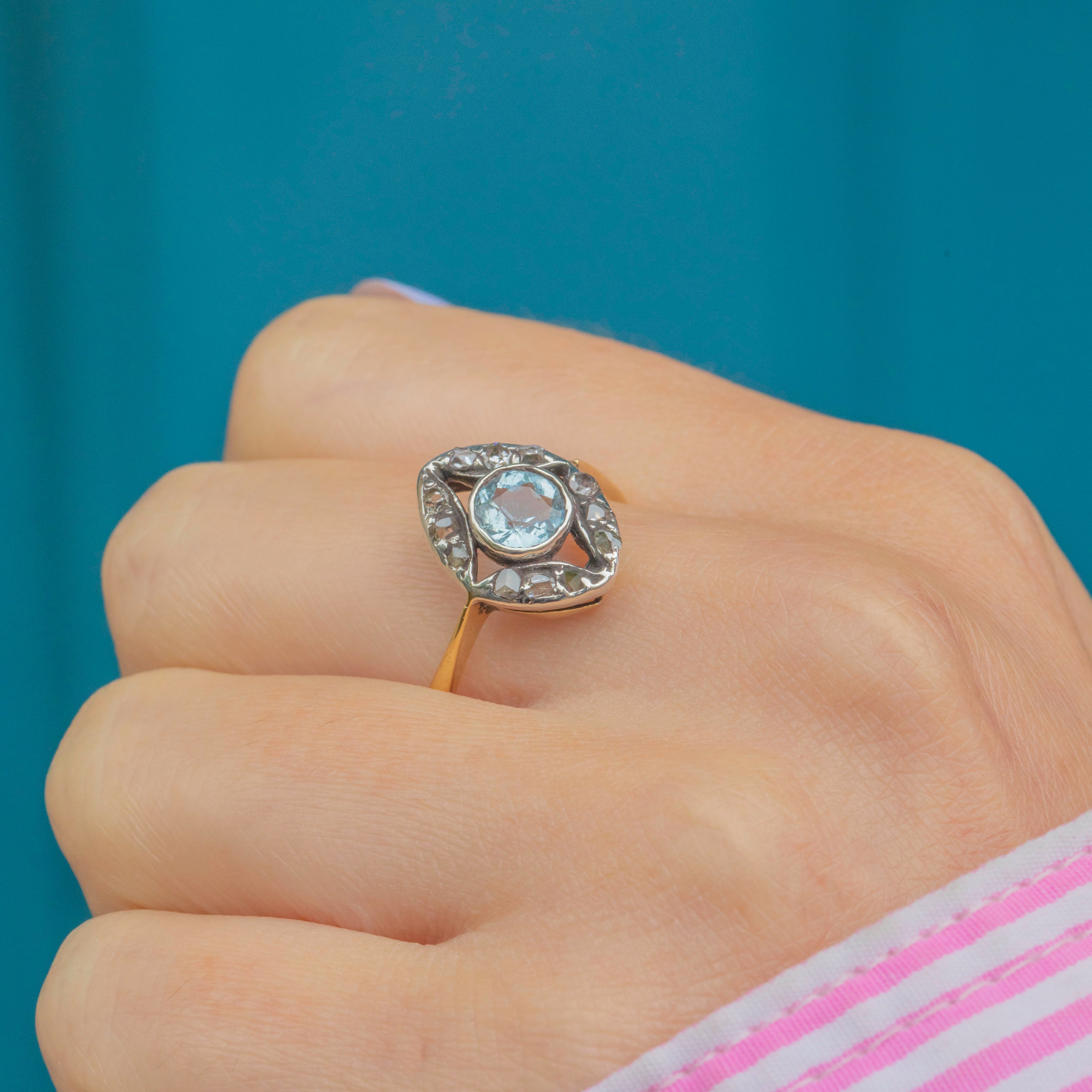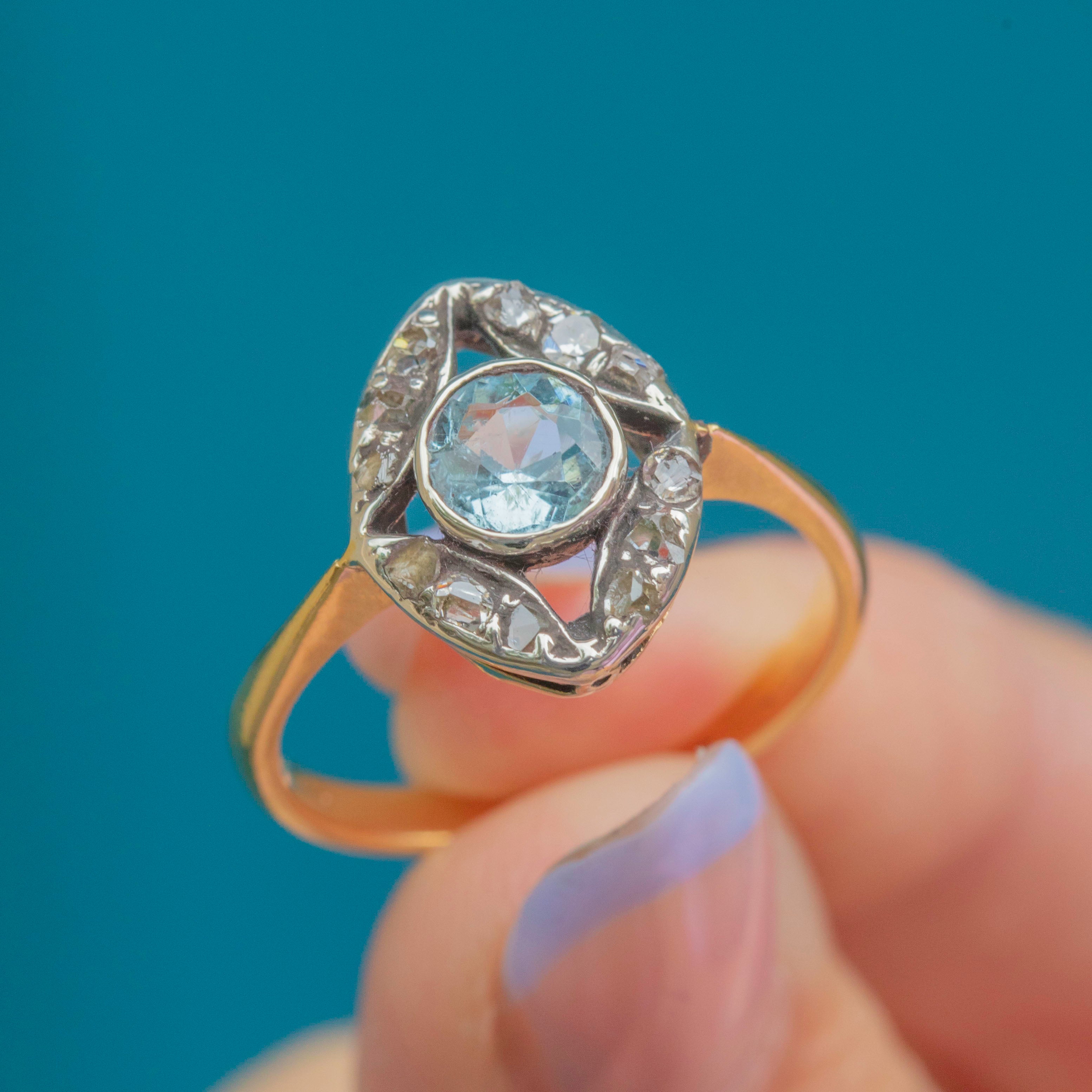 This antique 18ct Gold Aquamarine Diamond cluster ring is exquisite! Dating back to the Victorian era, this eye-catching ring boasts a striking icy-blue 0.35ct Aquamarine at her centre, frmaed by a rose-cut Diamonds that twinkle softly in their Silver settings.