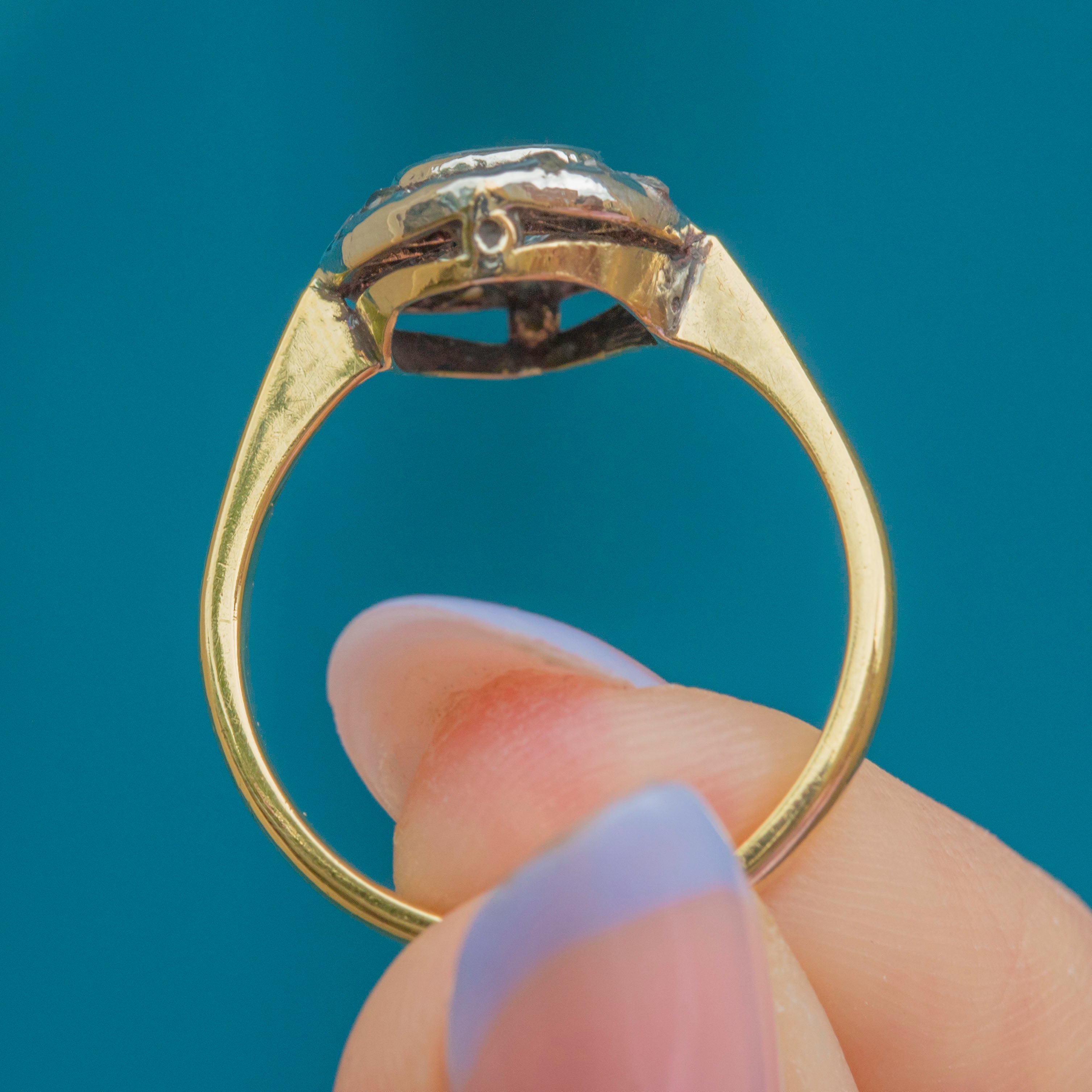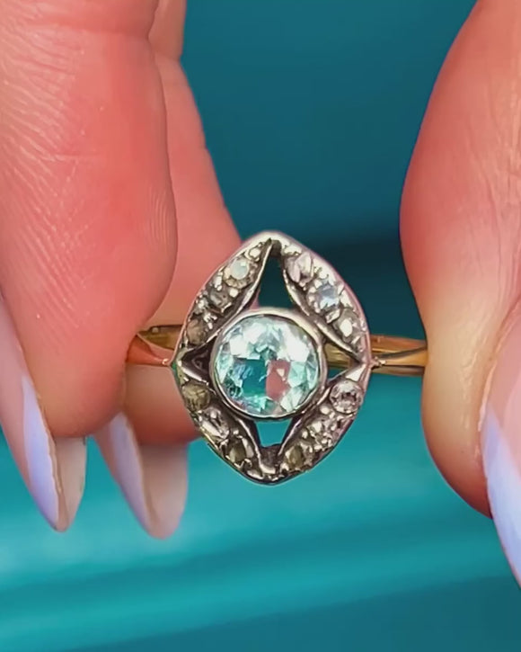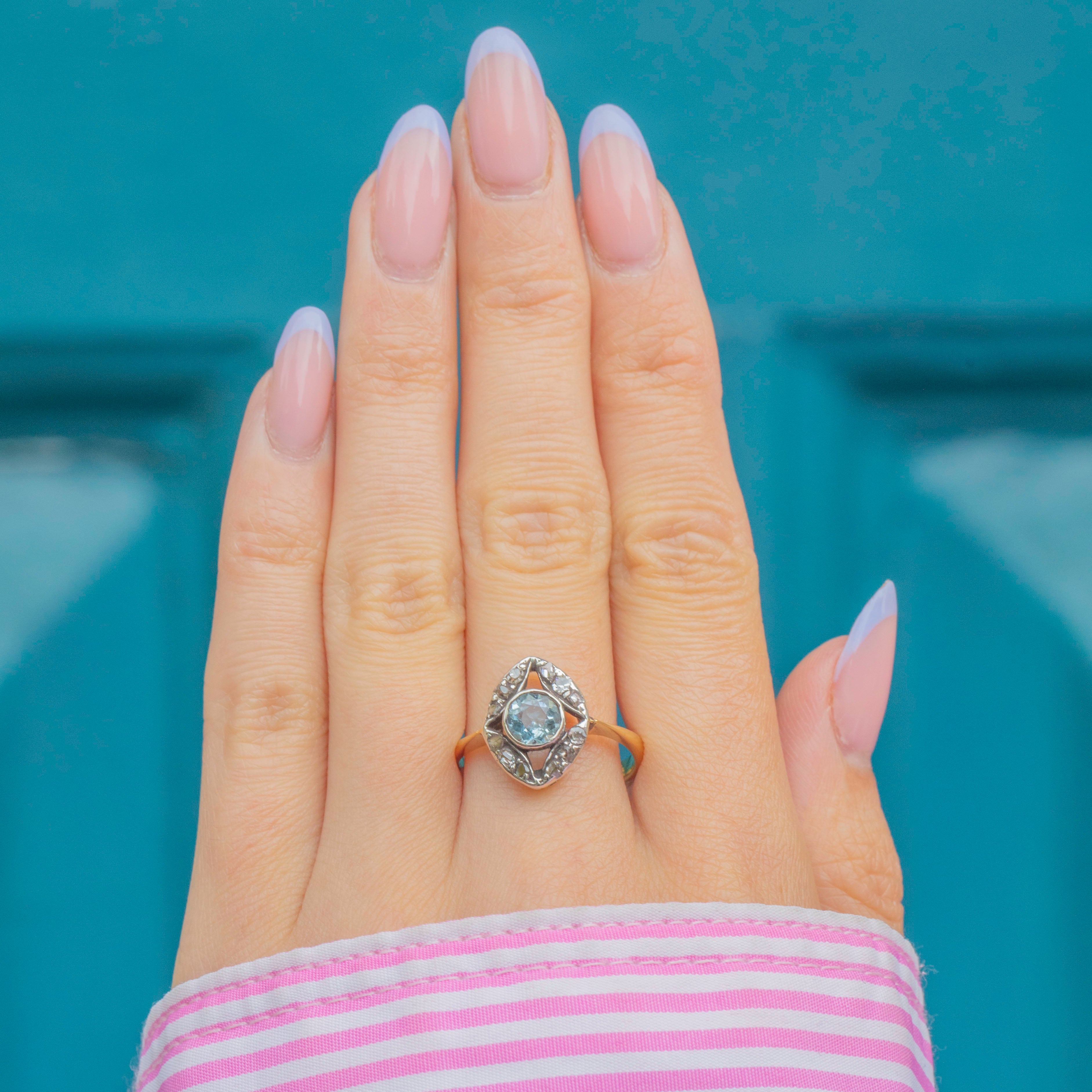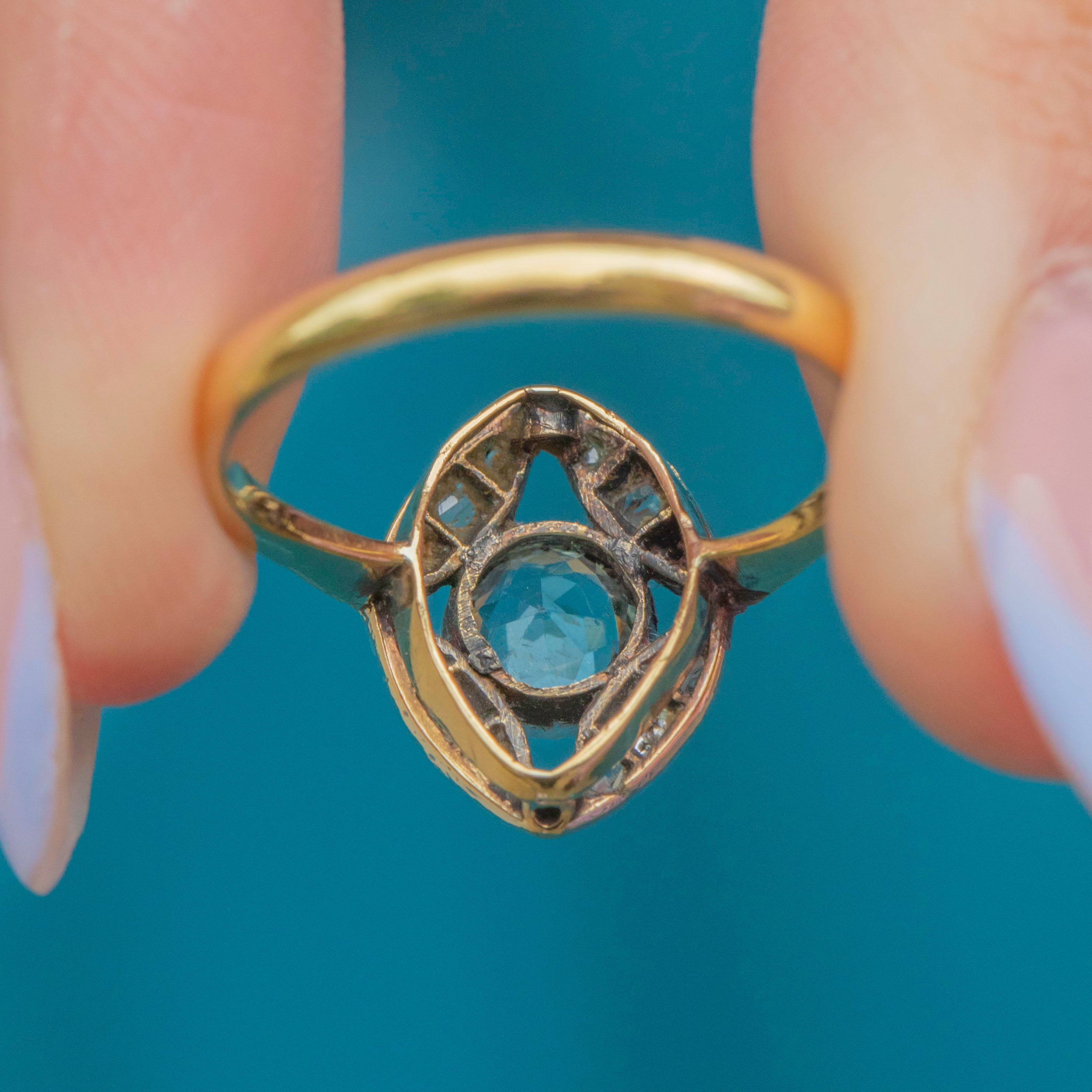 This antique 18ct Gold Aquamarine Diamond cluster ring is exquisite! Dating back to the Victorian era, this eye-catching ring boasts a striking icy-blue 0.35ct Aquamarine at her centre, frmaed by a rose-cut Diamonds that twinkle softly in their Silver settings.
