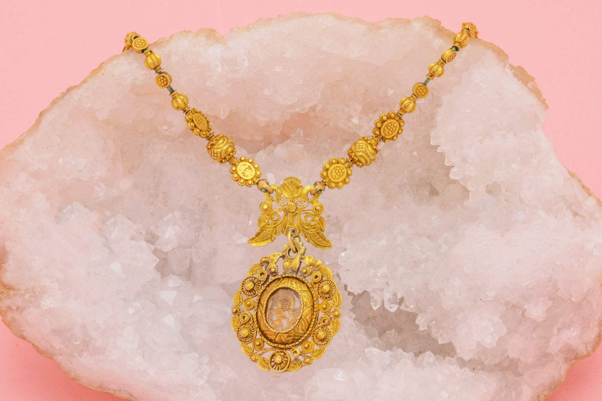 This tremendous piece has an intriguing past and displays a beautiful collection of Tambourine beads, which would have been hand strung by a Filipino artisan during the early part of the 19th century. Alfajor necklaces were heavily inspired by Spanish designs which were imported during this time, and each little bead is referred to as 'granada' or pomegranate- when you look up close at the details you can see why! The piece has also drawn inspiration from nature, with the cannetille detailing forming a wreath-like detail around a central rose that rests behind glass, as well as an intricately designed butterfly.