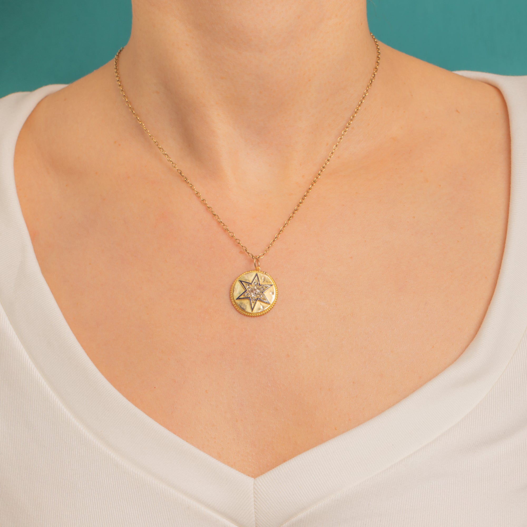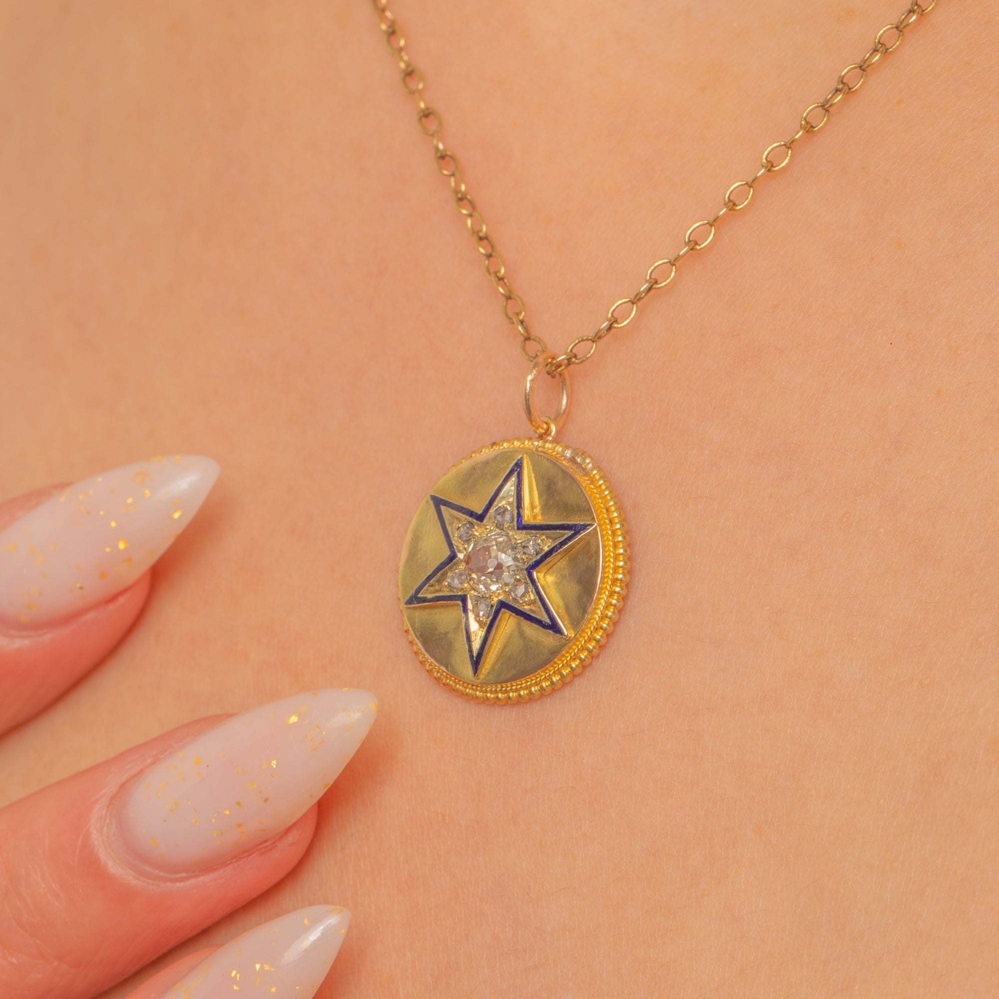 A luminous Victorian 18ct Gold disc pendant, its celestial starburst traced in rich Blue Enamel and framed by a refined beaded rim. At the heart glows a 3.5mm old mine cut Diamond of approximately 0.17ct, with glinting rose-cut Diamonds forming the radiant “arms” of the star.