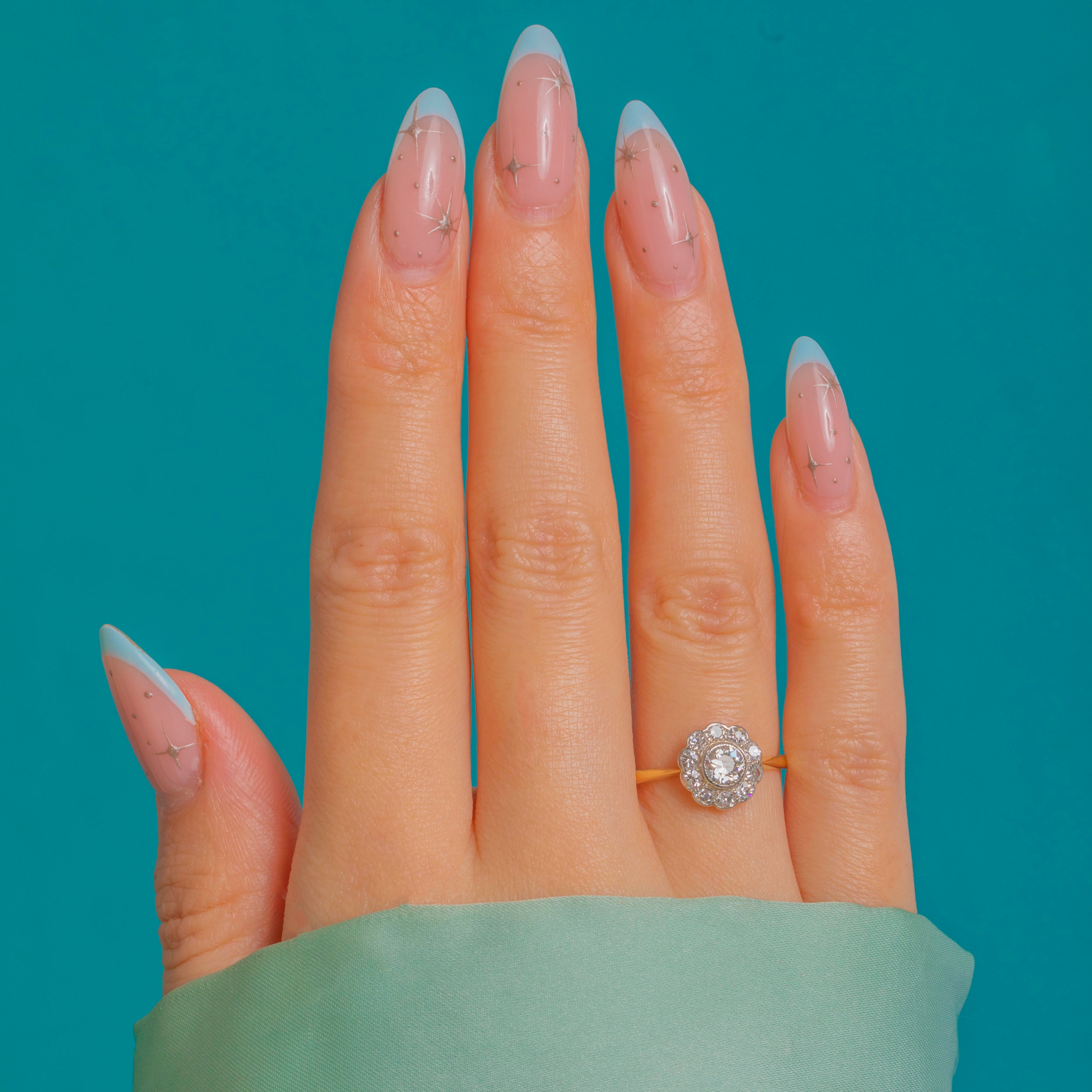 A quintessential Edwardian daisy cluster, this delicate two-tone ring marries a slim 18ct Gold shank with a refined Platinum milgrained head. At its heart sits a bright round 0.25ct Diamond framed by a halo of well-matched round Diamonds, their bead-set sparkle accented by a scalloped outline and crisp milgrain for that unmistakable early 20th-century finesse.