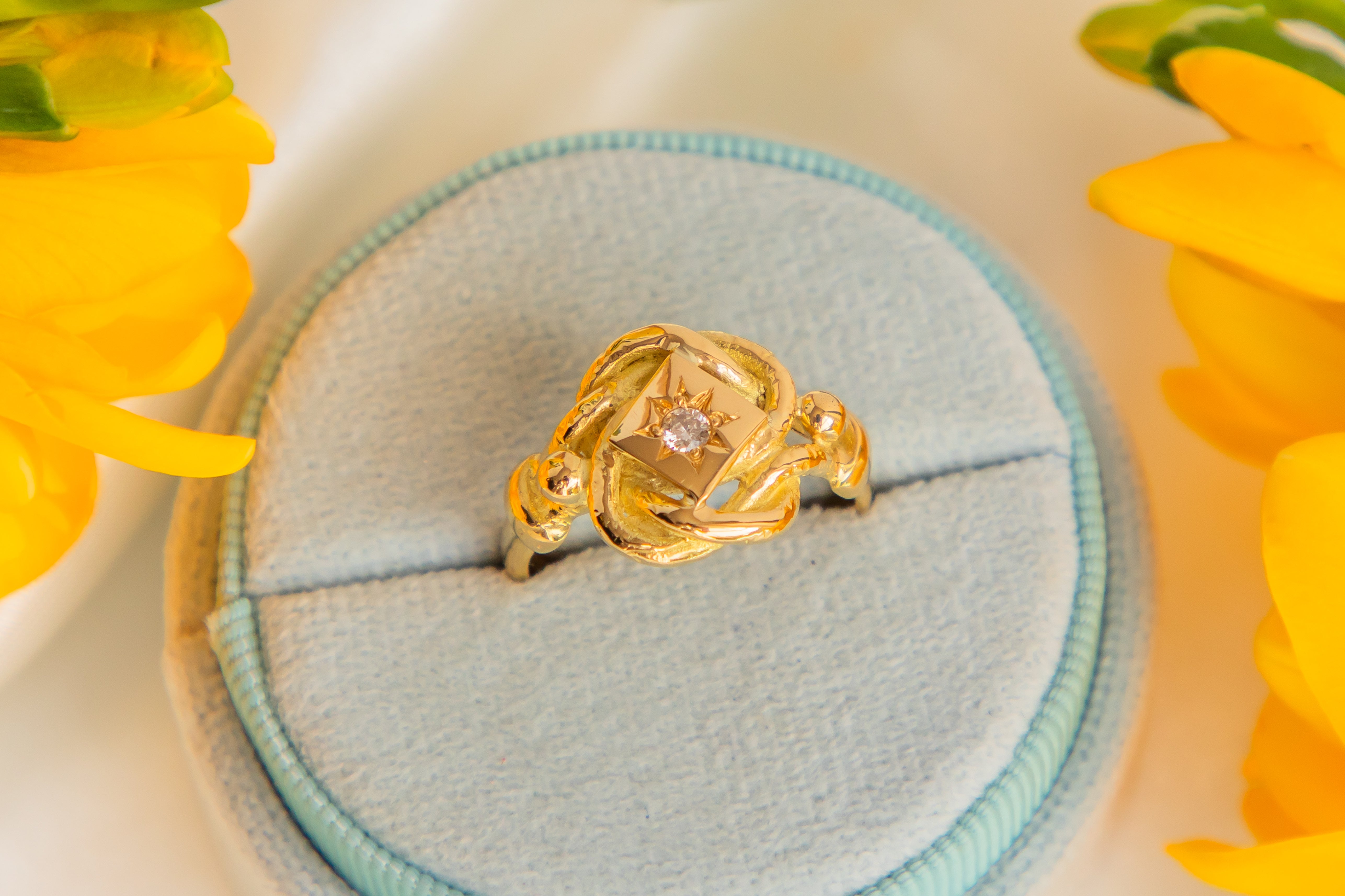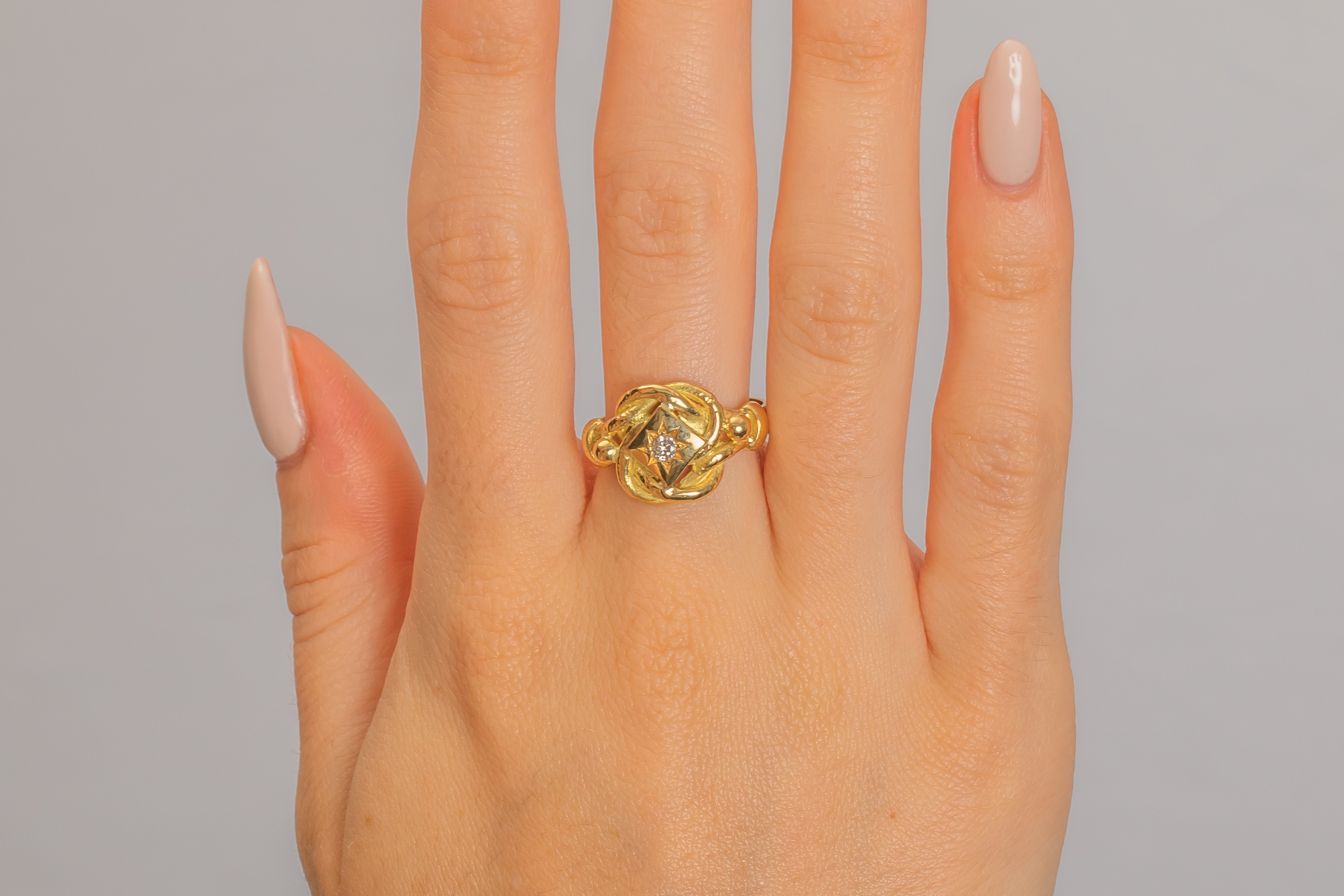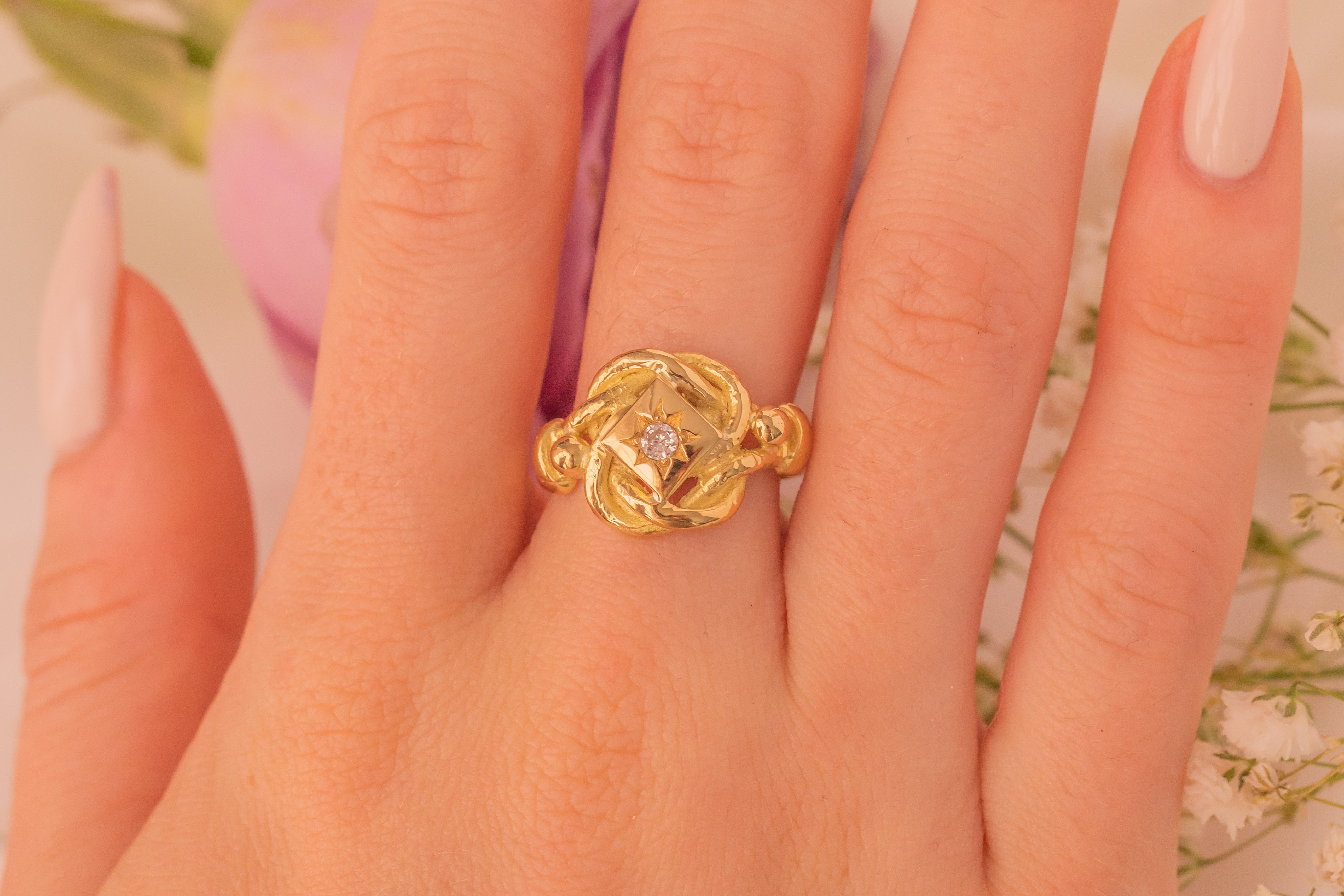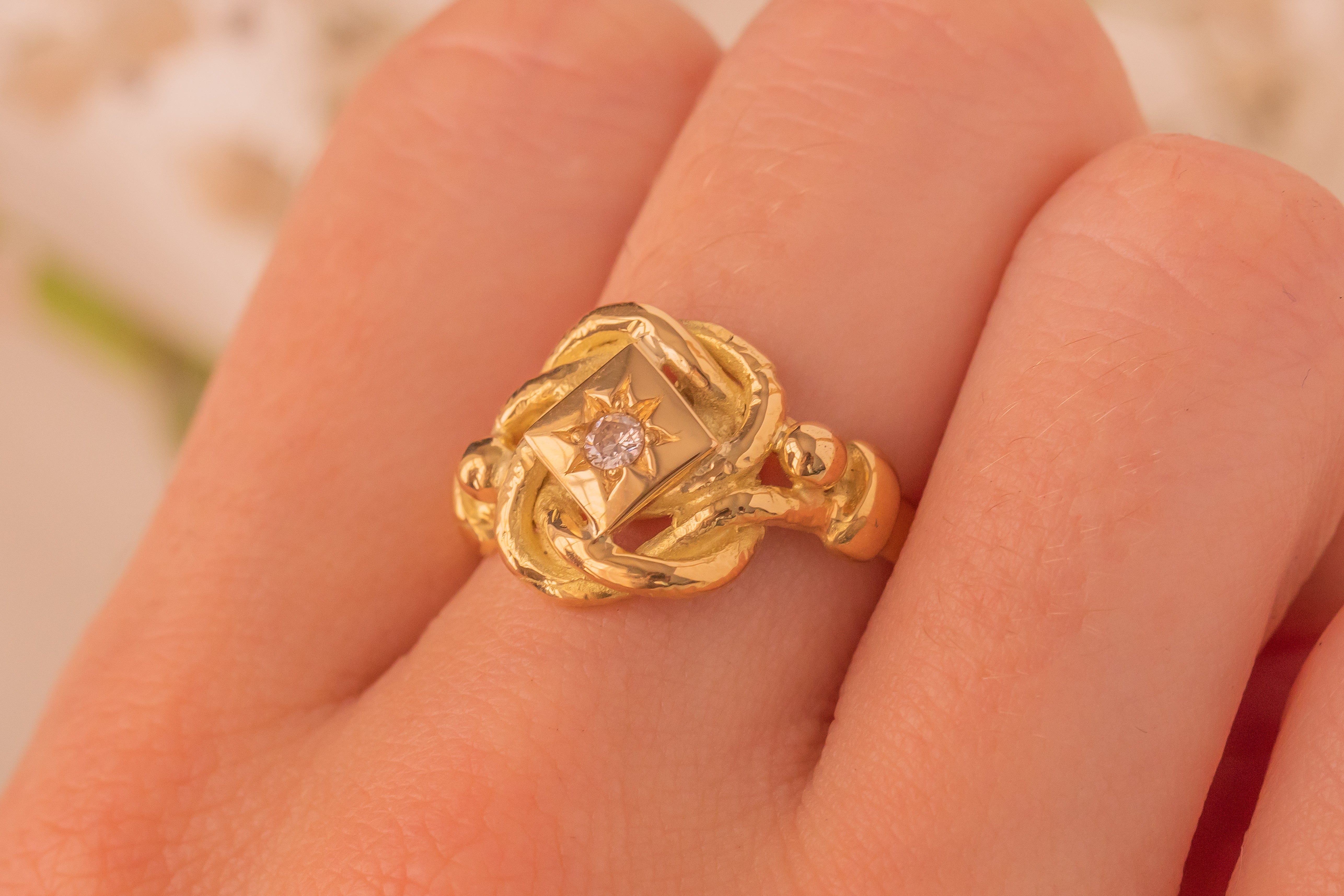 This heavy antique 18ct Gold Diamond lover's knot ring is simply stunning! With a generous weight of 7.4g and a twinkling 0.10ct Diamond nestled within a star setting, this chunky ring carries a sweet sentiment that makes her the perfect gift!