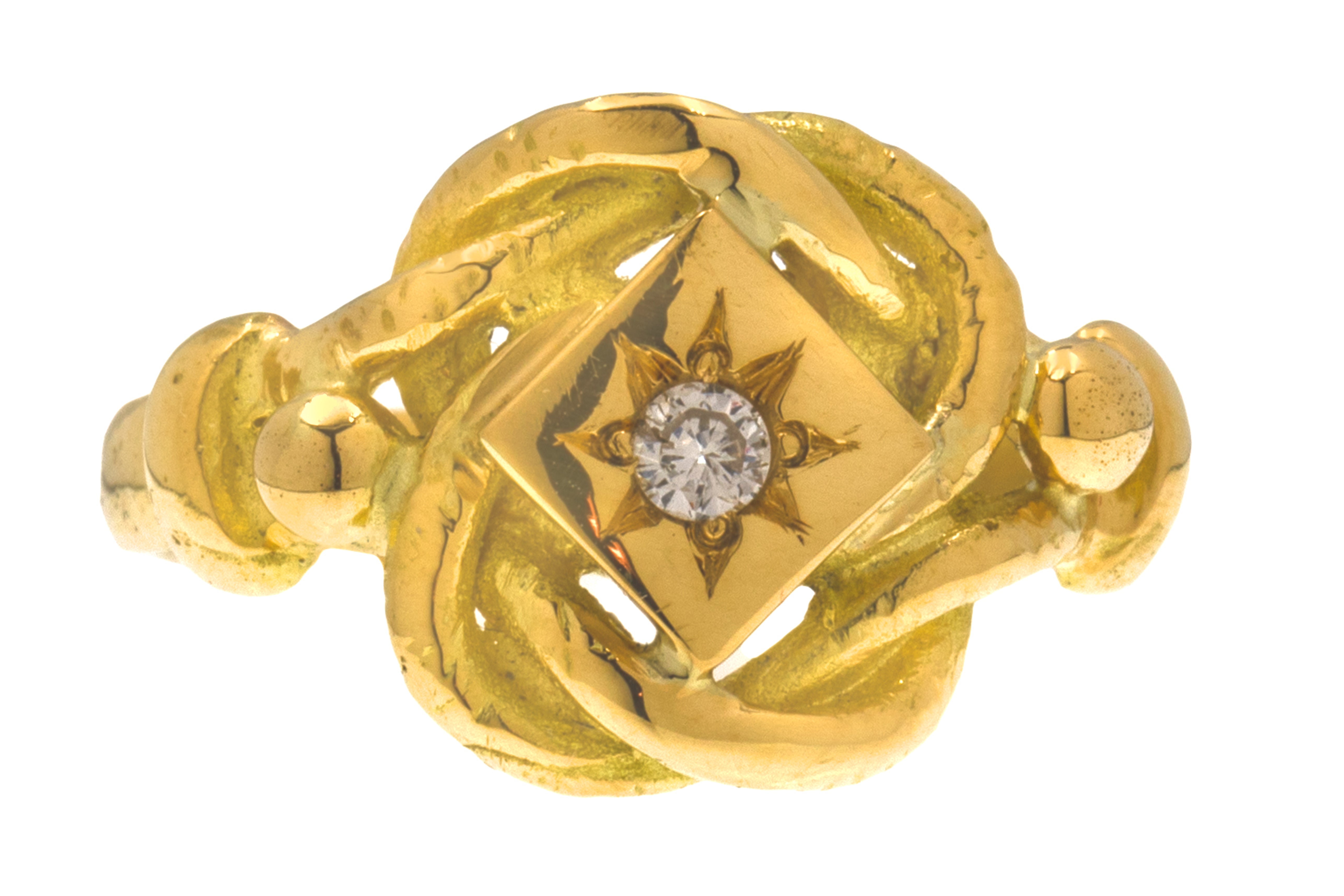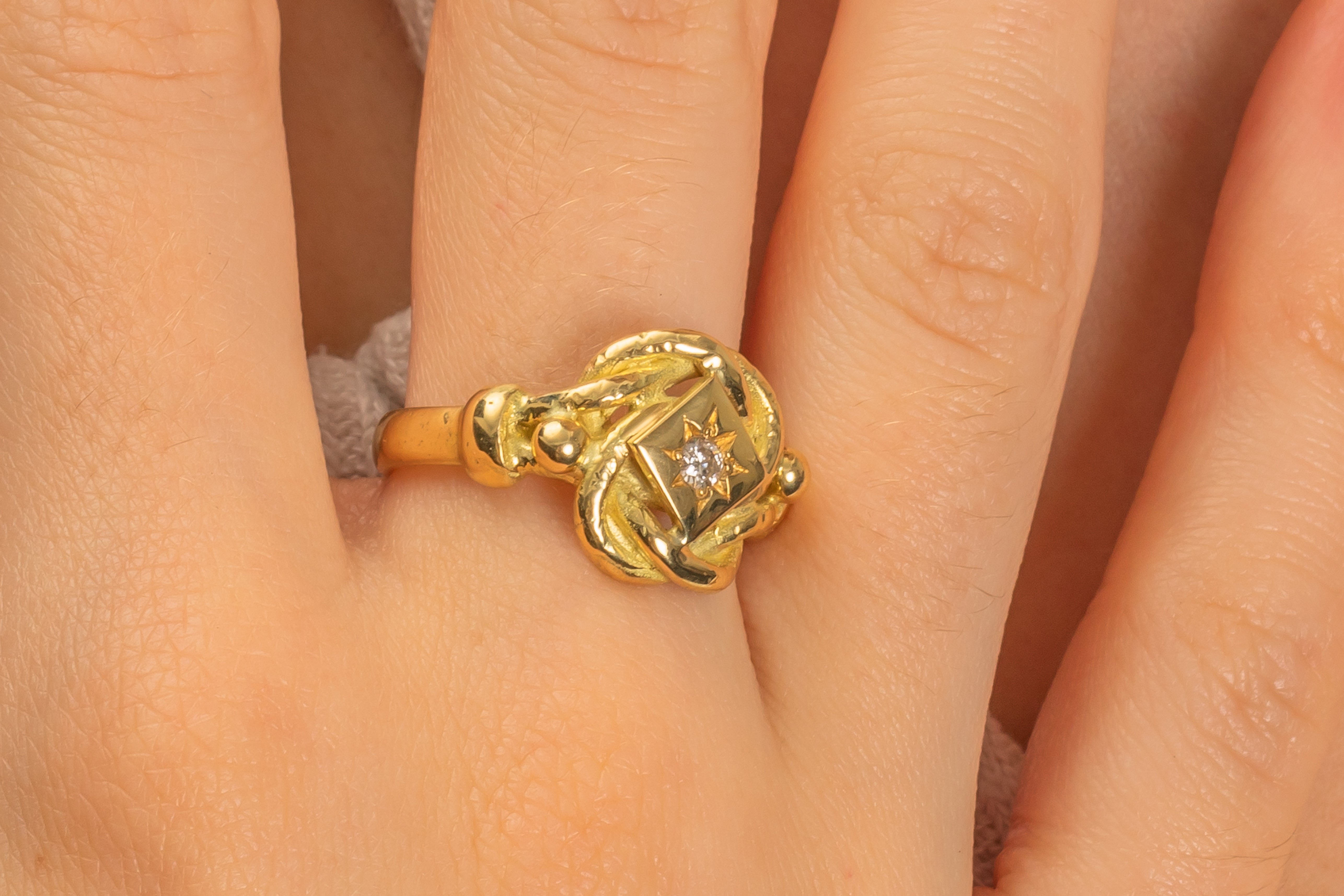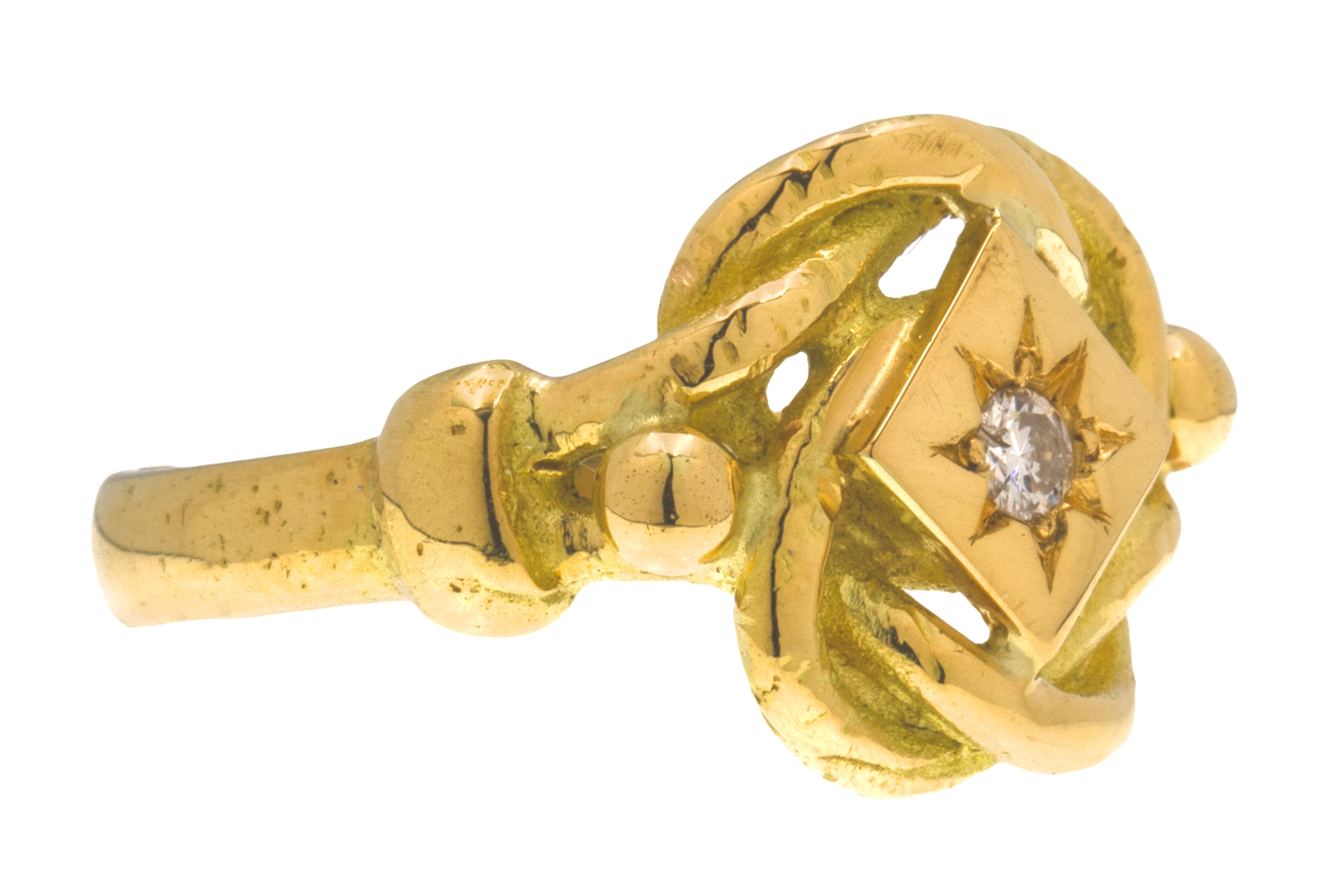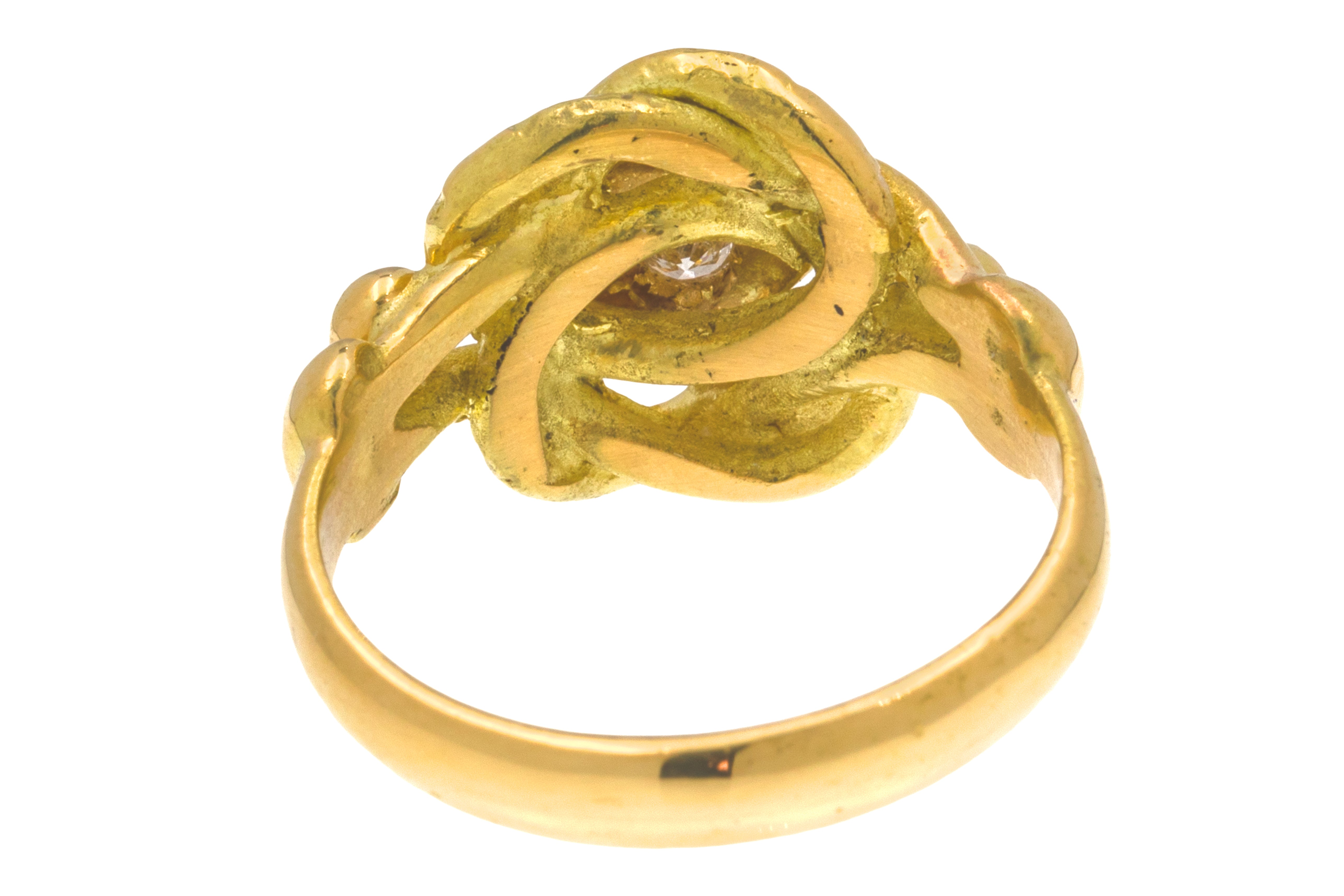 VERY GOOD. This heavy antique 18ct Gold Diamond lover's knot ring is in very good condition. The Gold is glossy throughout, retaining the buttery, richly saturated hue that we know and love! The dazzling Diamond is securely set and the knot design remains intact. There is only minor wear on this exceptional Diamond early 20th century ring, despite its great age this ring has lasted incredibly well! All in all, this lover's knot ring is a sublime find!