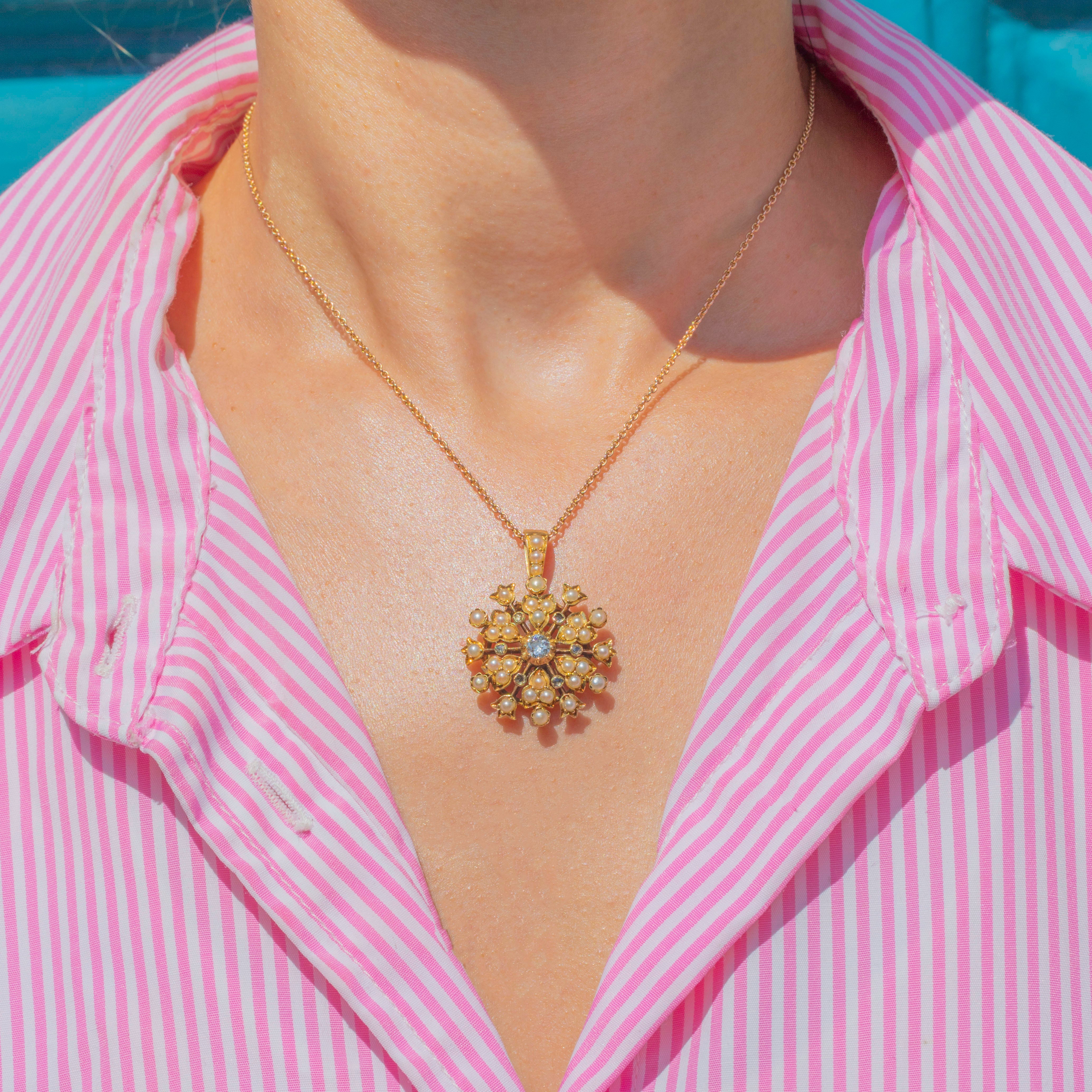 Formed from saturated 18ct Gold and bursting with 0.35cts of shimmering Diamonds and iridescent Pearls, this antique flower cluster pendant is a fine example of the intricate designs and exquisite craftsmanship of the Victorian era!