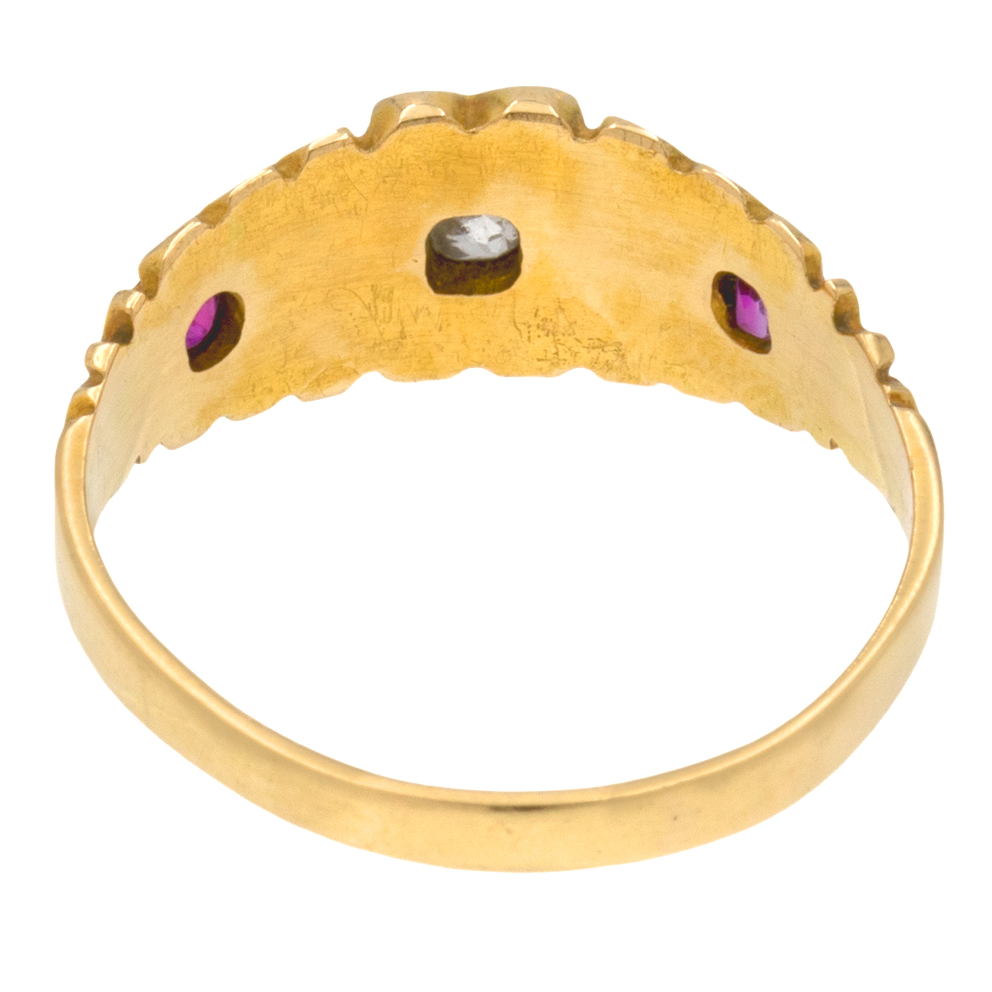 EXCELLENT. This antique 18ct Gold Diamond Ruby Gypsy ring is in wonderful condition. All of her gemstones are securely set, with no chips or damage to note. The Gold is saturated and all of the details have remained crisp, the band has retained its form well. This fantastic Gypsy ring will delight you for decades to come!