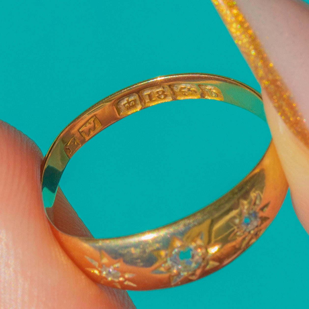 VERY GOOD: The Diamonds are bright and secure in their star settings, with light antique wear under magnification only. The 18ct Gold band retains a lovely shine; the back has thinned very slightly from long-term wear but remains sound, with no evidence of resizing. Overall, a well-cared-for antique ring, ready to enjoy.