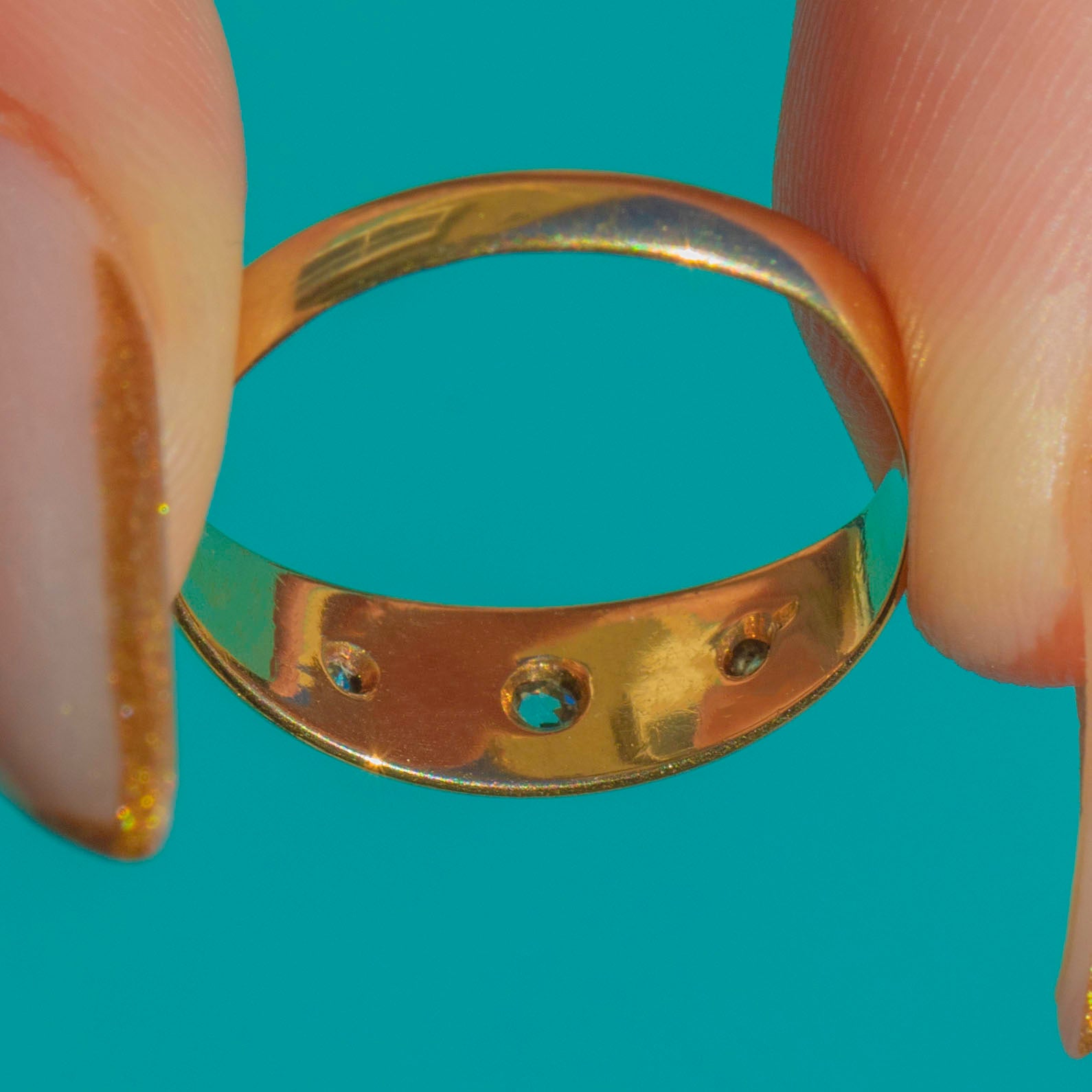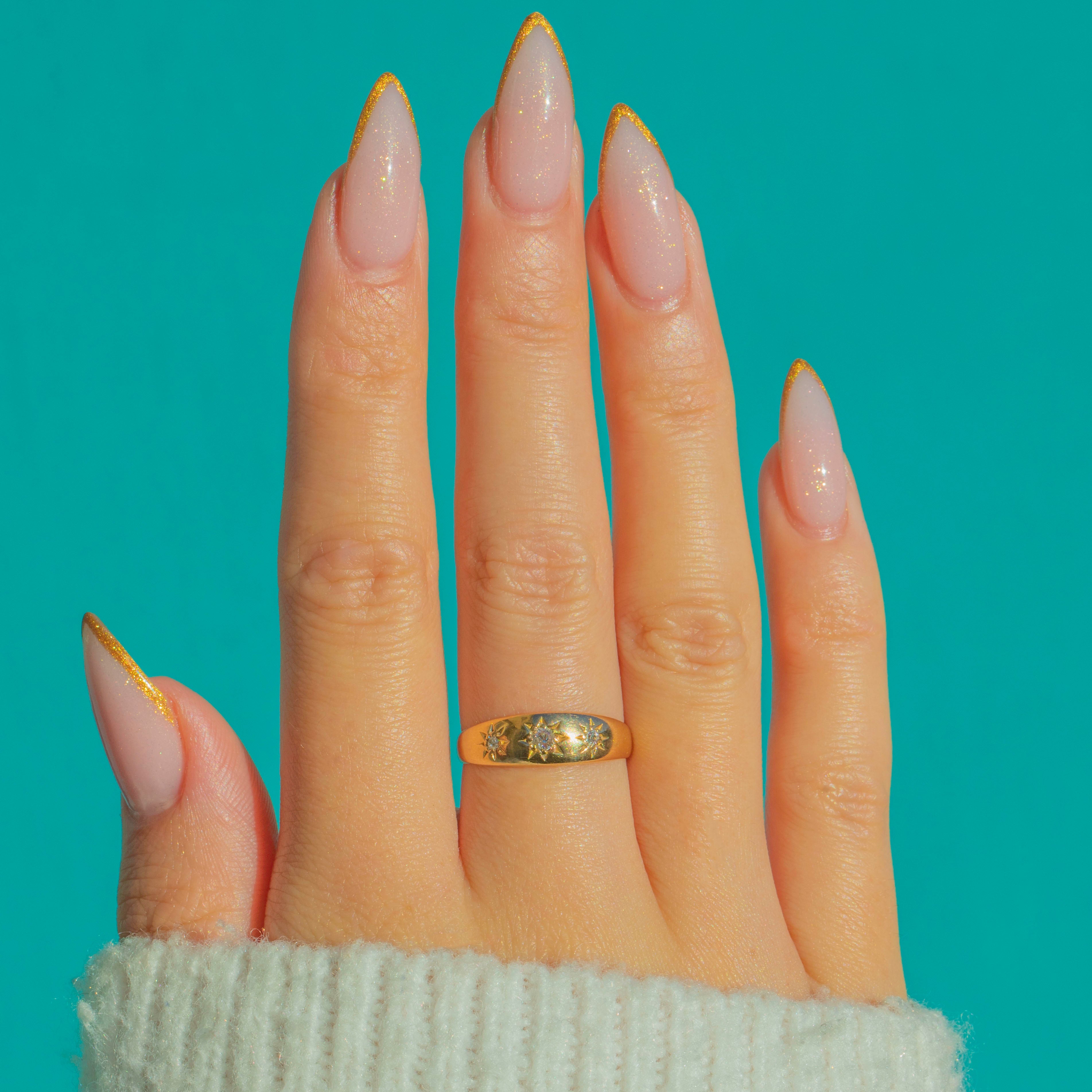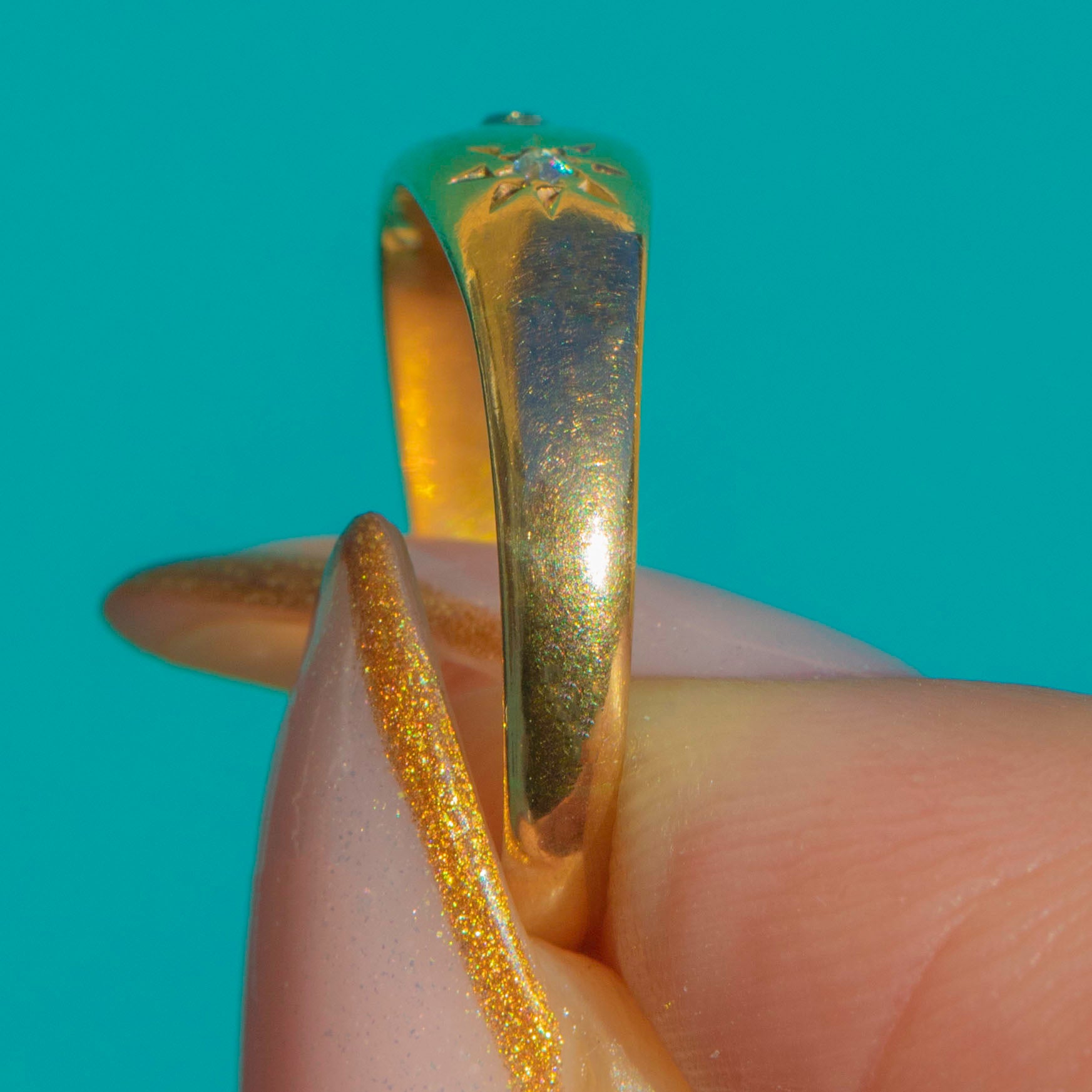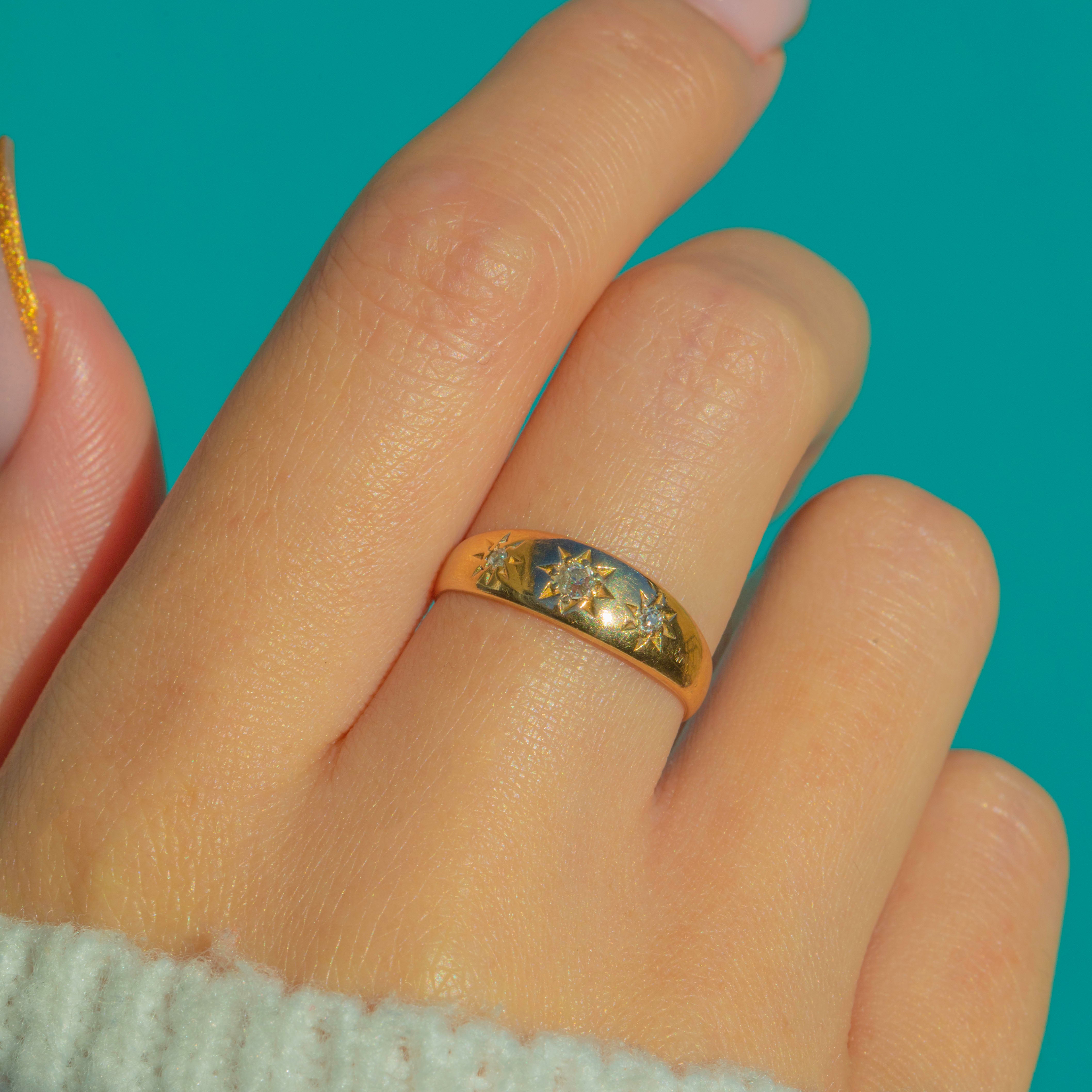 This antique 18ct Gold gypsy ring is a little band of Edwardian starlight. Three twinkling antique Diamonds are neatly set in star-shaped settings across the front, the central stone an old mine cut flanked by charming rose-cut accents. The Gold has that lovely bright, buttery hue only high-carat antique Gold can give, with a soft patina that speaks to over a century of love.