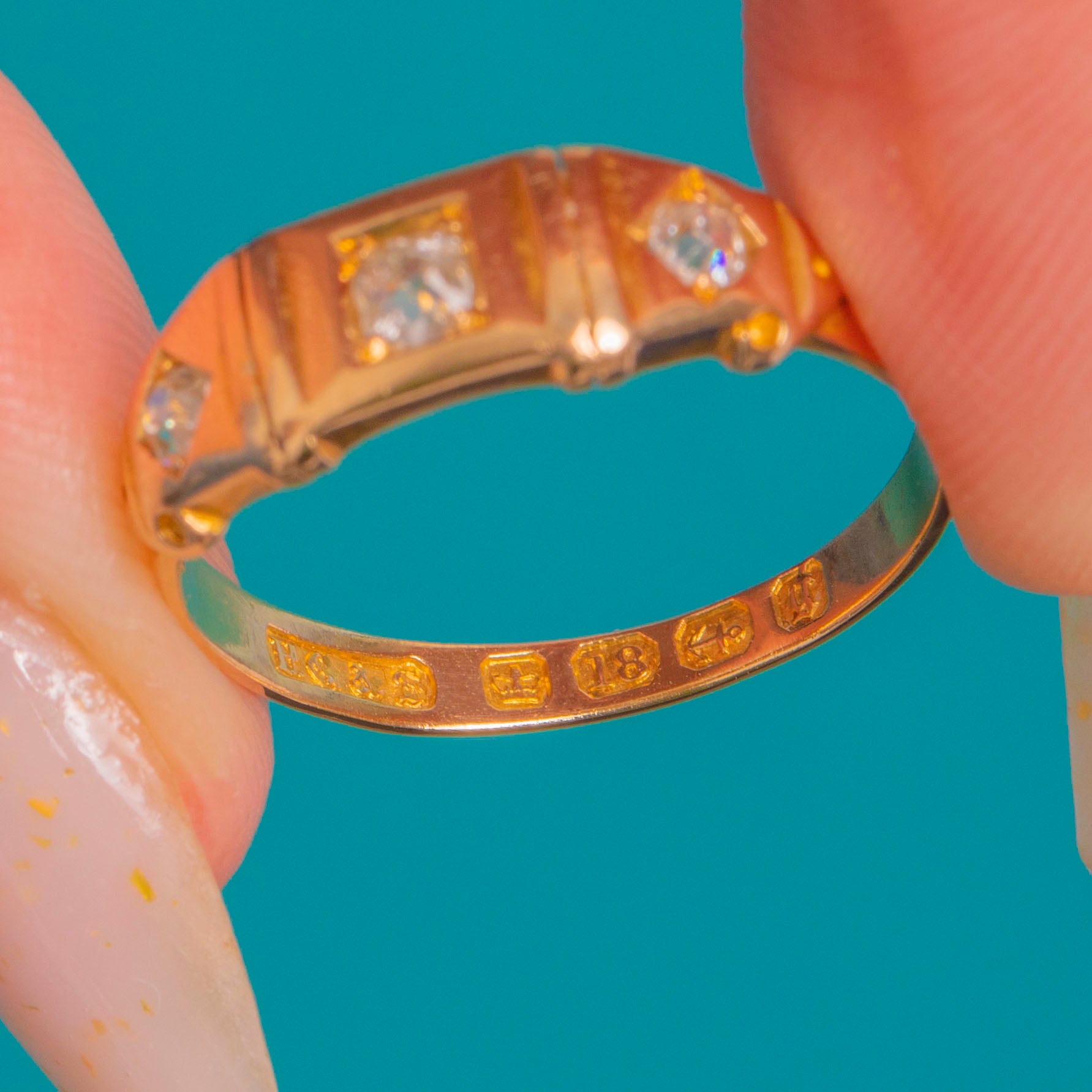 A refined Victorian 18ct Gold buckle ring set with a crisp trio of gypsy-set Diamonds. The low-profile band and sleek, geometric head give this antique classic a streamlined, architectural presence, while the flush settings lend a smooth, comfortable fit and understated sparkle.