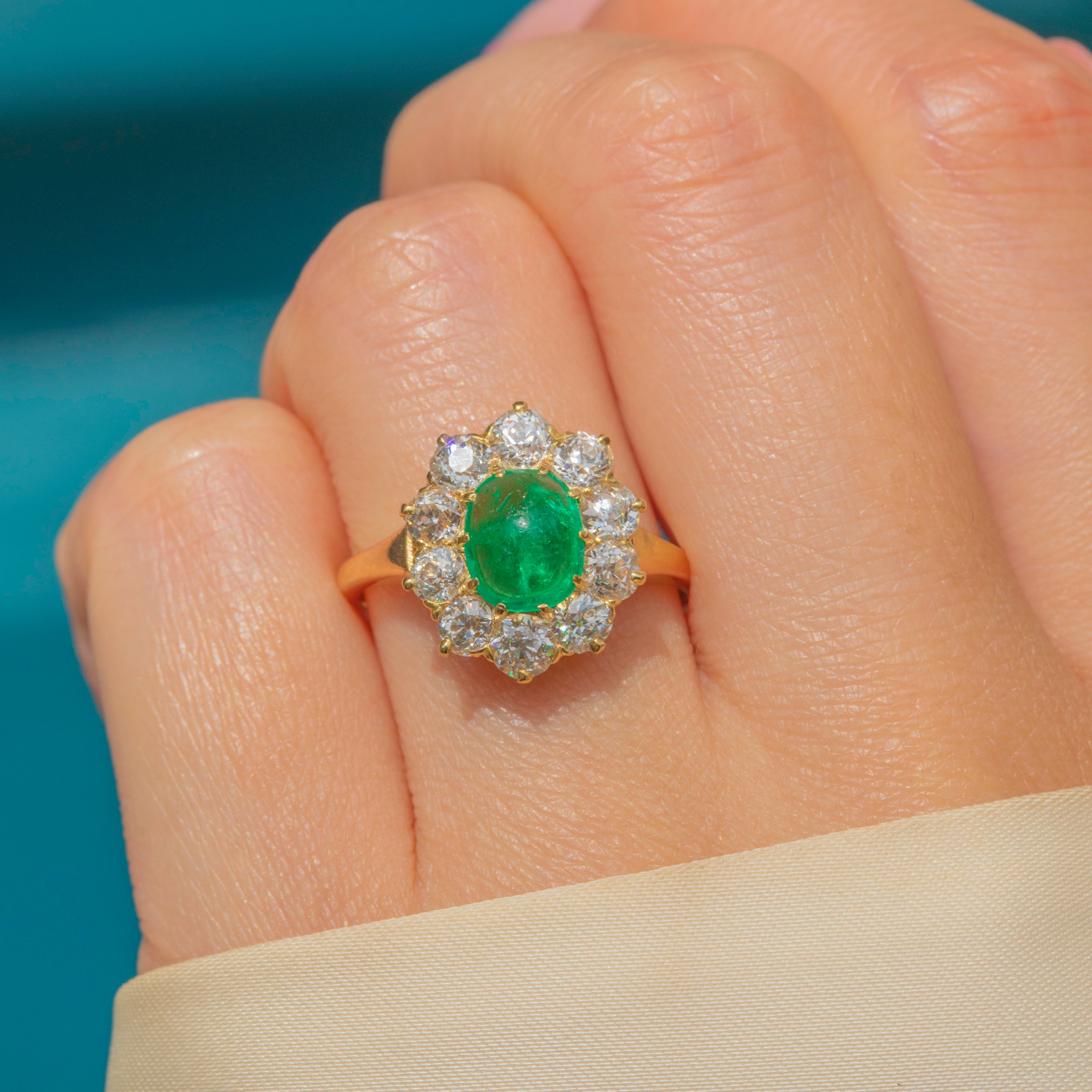 Antique 18ct Gold Emerald Cabochon Diamond Cluster Ring 0.90ct Emerald Item added