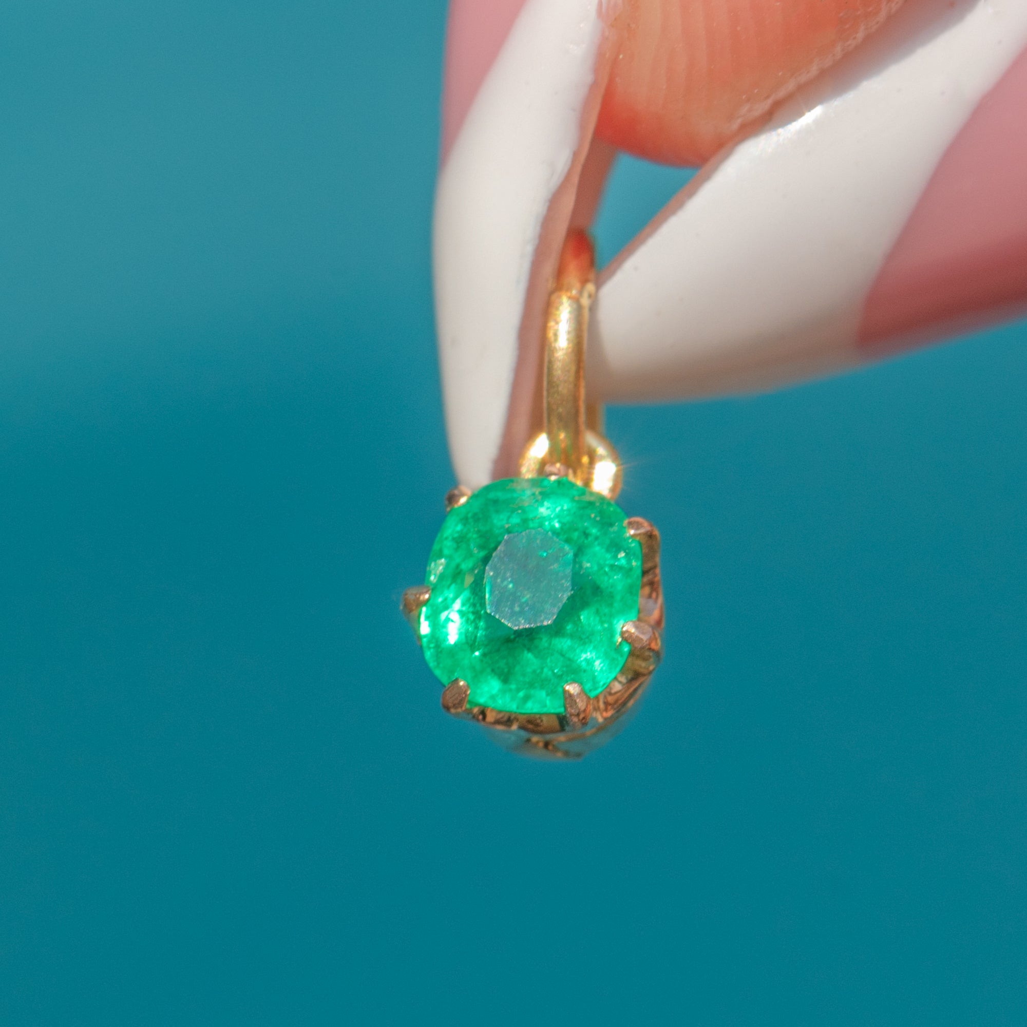 A Victorian charm crafted in 18ct Gold, set with a lively green Emerald in a classic claw setting. The stone’s natural hue and clarity are beautifully showcased.