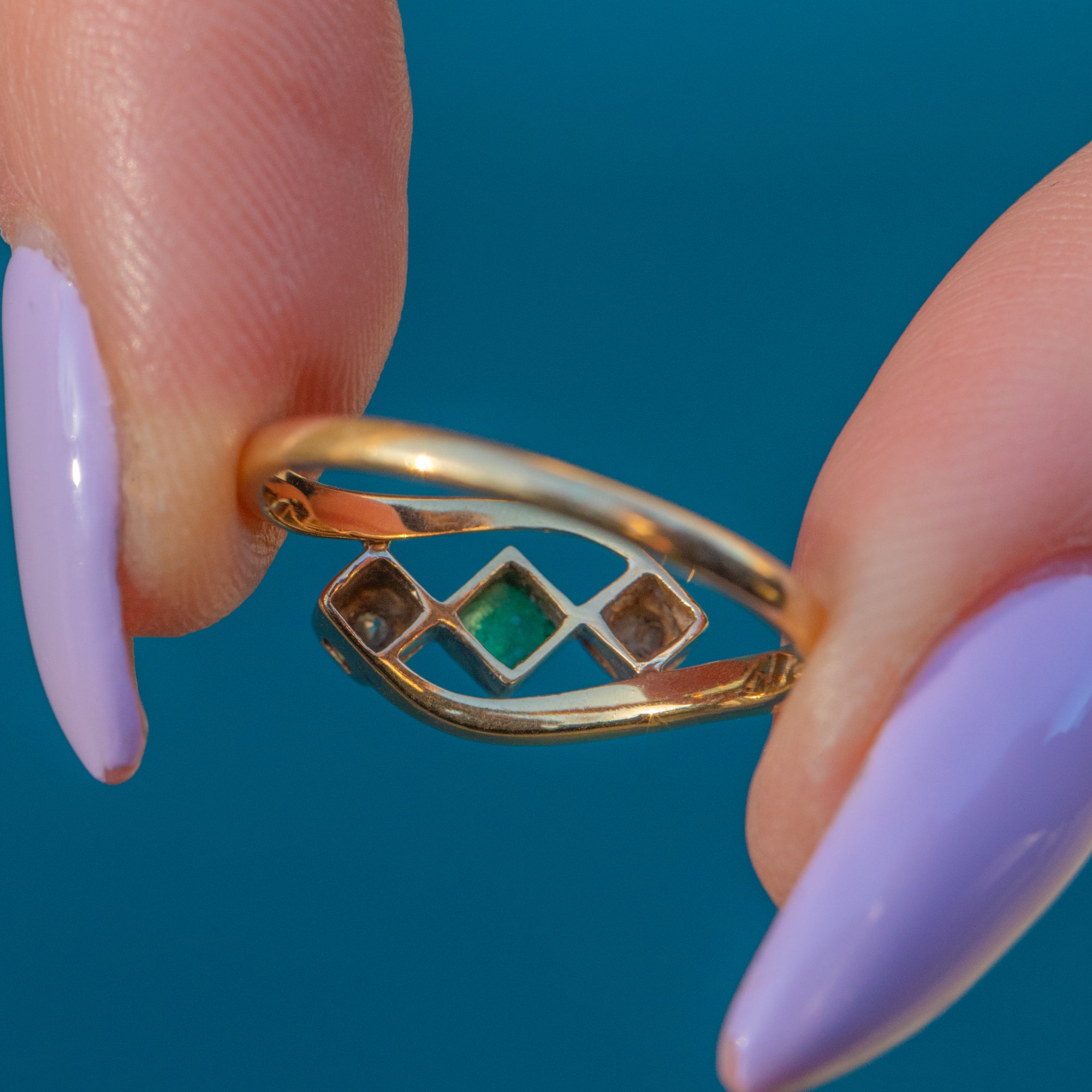 This antique 18ct Gold Emerald Diamond bypass ring would make an elegant choice for a unique engagement ring! The sumptuous 18ct Gold band wraps around the finger with undeniable luxury, curving around the gemstone trilogy in a classic bypass design.