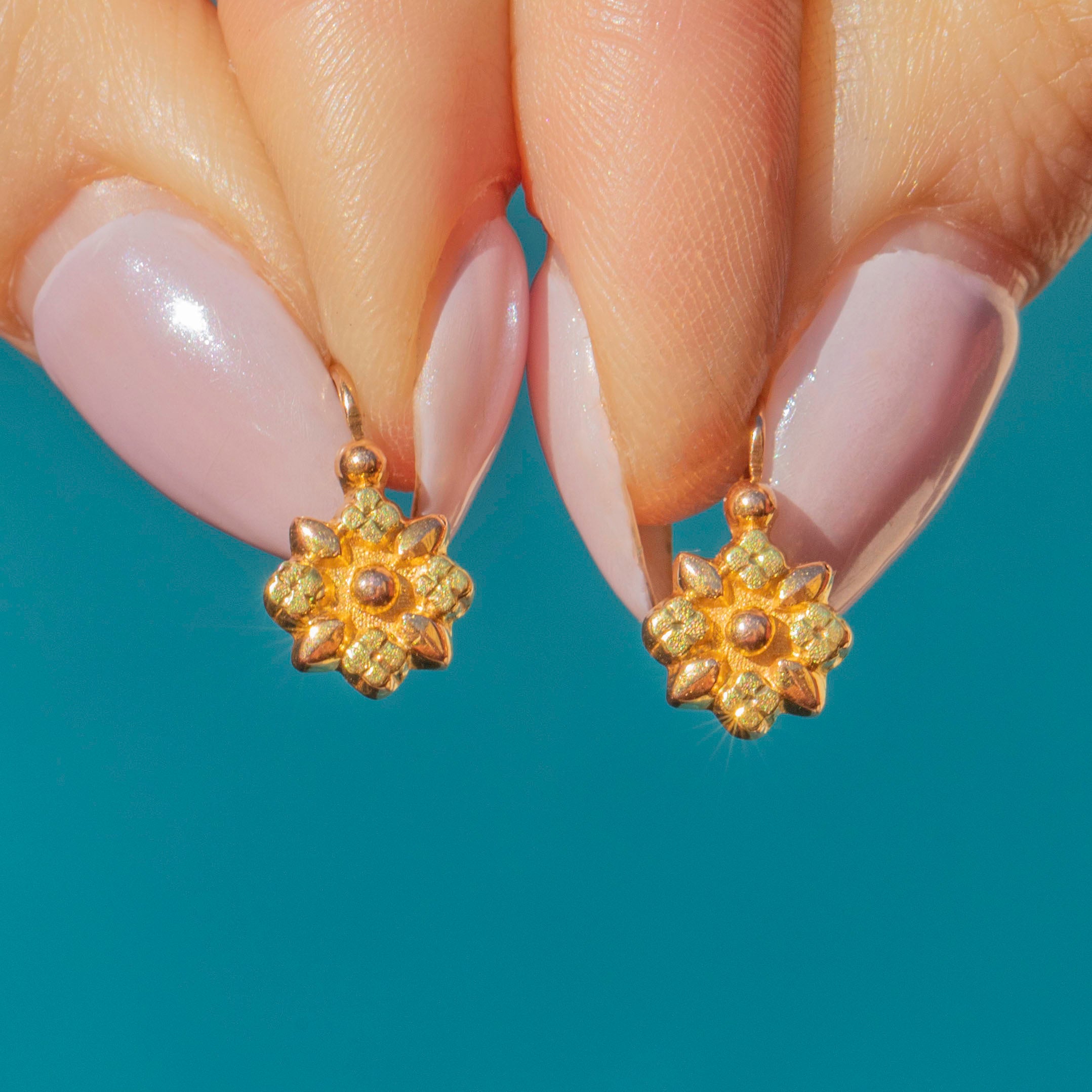 EXCELLENT-VERY GOOD. These antique 18ct Gold French floral dormeuse earrings are in wonderful condition. Crafted beautifully, these earrings suspend gracefully from your lobes, with their dormeuse style ensuring comfort and security. Both earrings have a minor pinprick hole, however this is virtually unnoticeable without a jeweller's loop. In such wonderful condition, these earrings are a treasure!