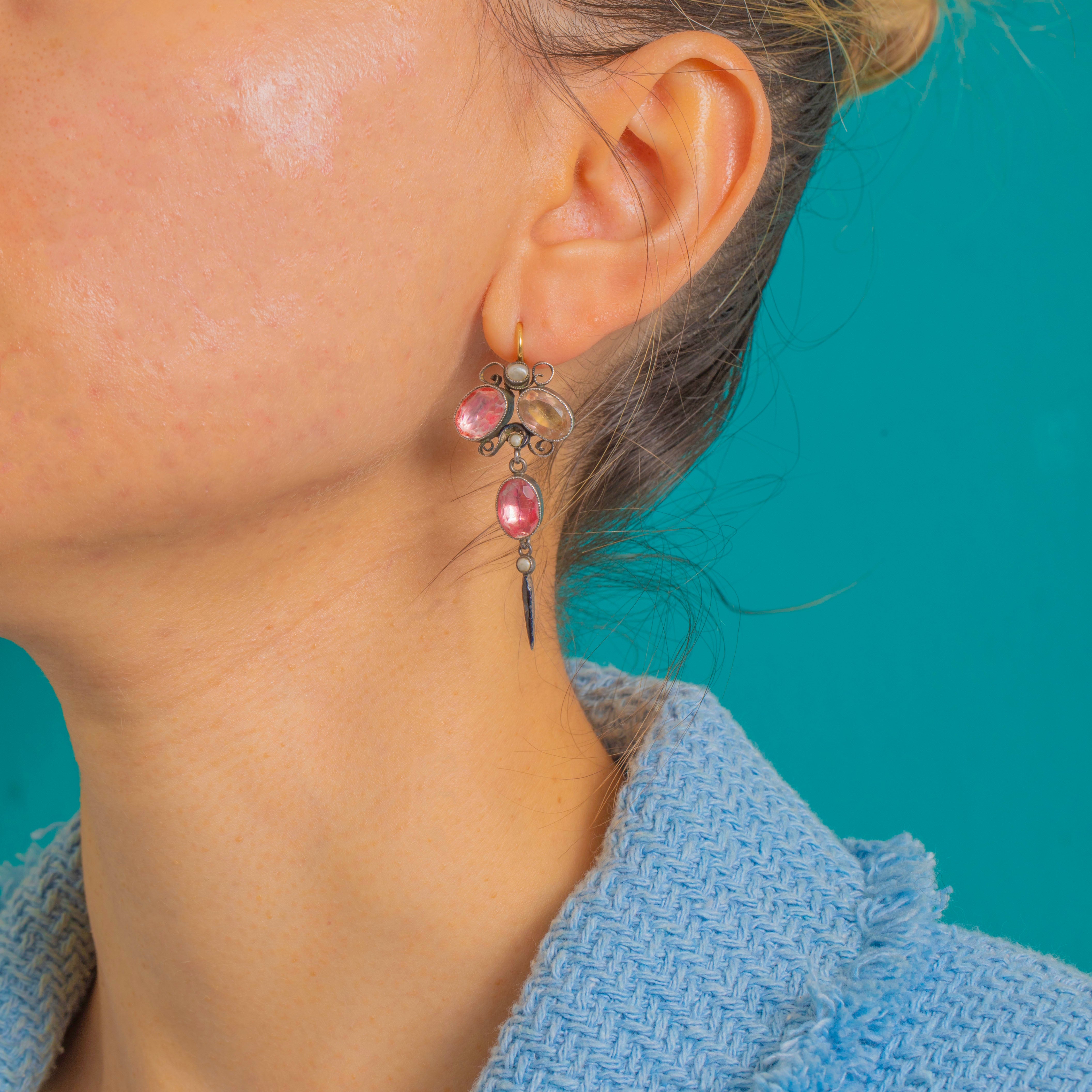 Antique 18ct Gold French Foiled Pink Paste, Pearl & Black Enamel Drop Earrings