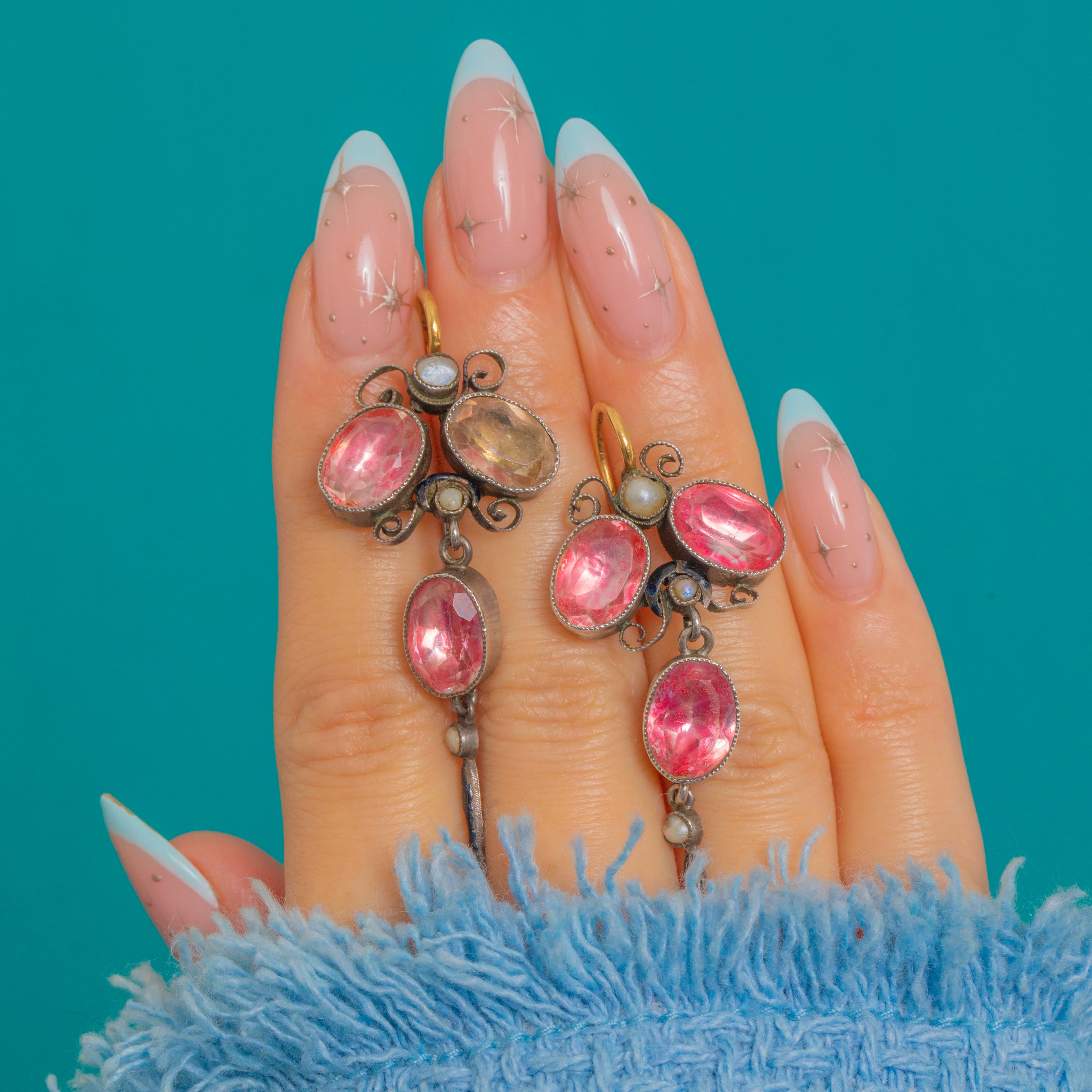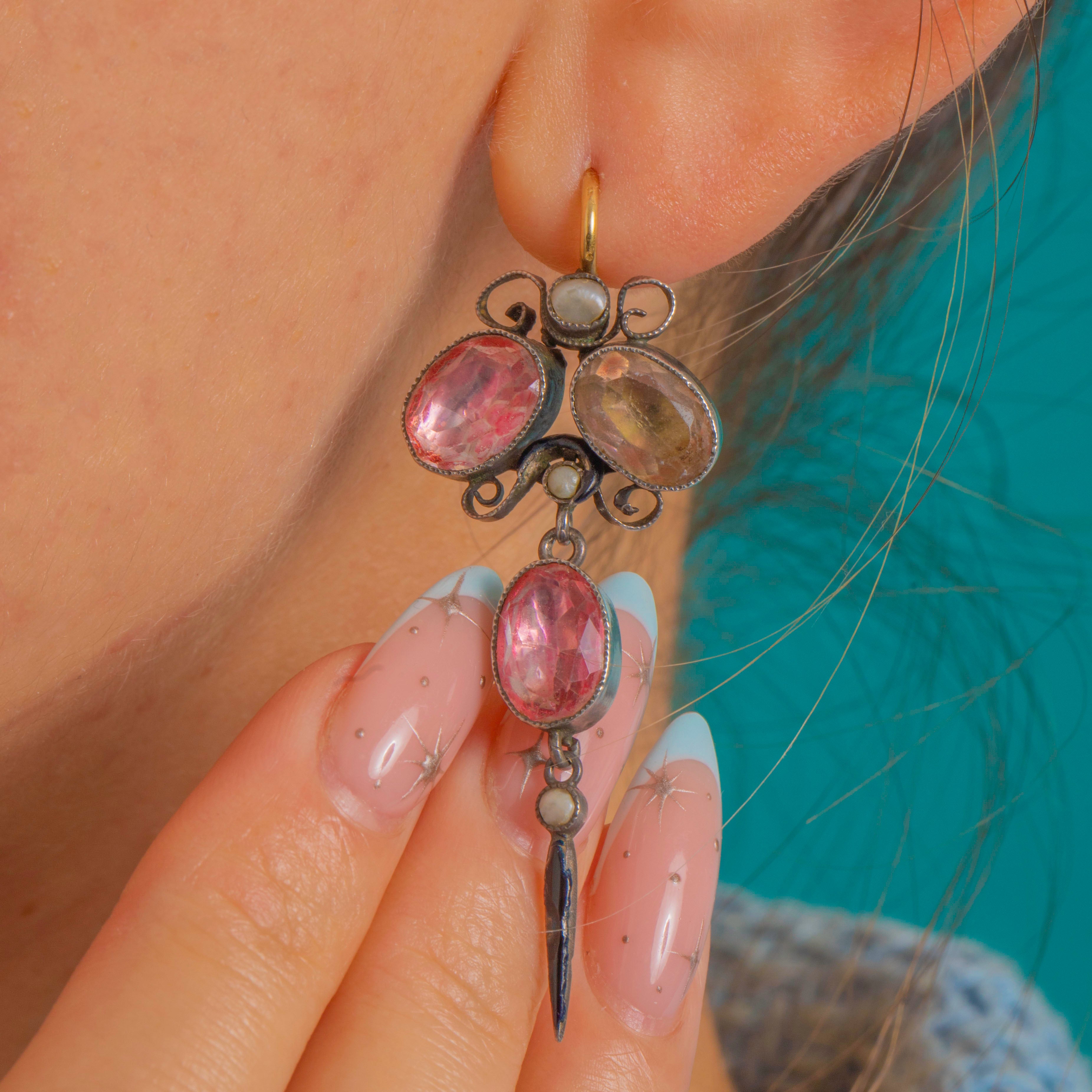 A wonderfully characterful pair of Georgian drop earrings, set with vibrant French foiled Pink Paste stones that catch the light with a romantic glow. Delicate Pearl accents and Black Enamel detailing give them that unmistakable antique finish, with all the charm you’d hope for from an early piece.