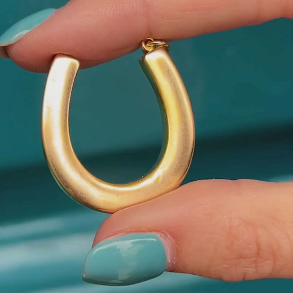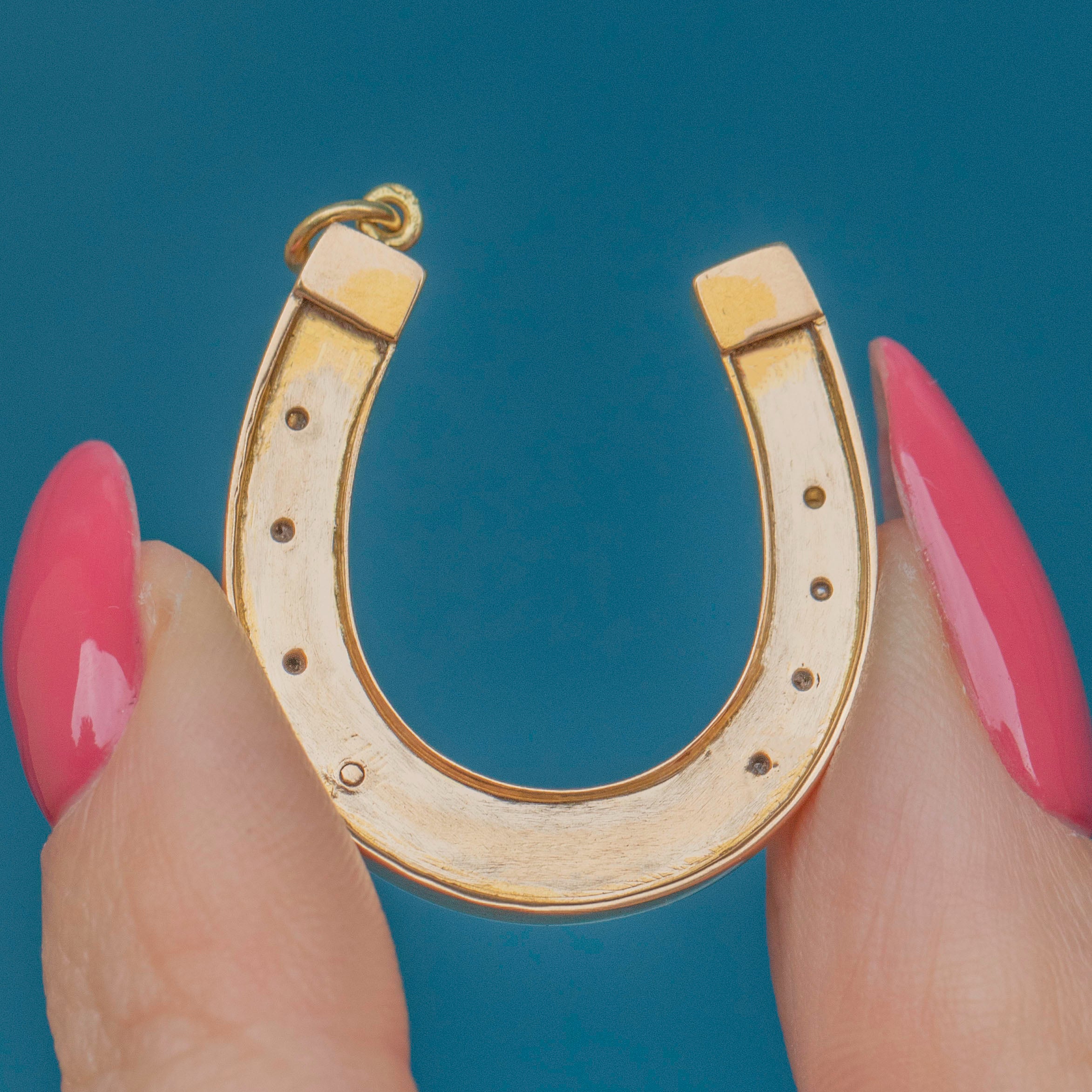 EXCELLENT. With very little to report, this antique 18ct Gold horseshoe pendant is in excellent condition. Her 18ct Gold has kept her glossy Gold gleam and is free from any dents or scuffs. Attached to a Gold jump ring, suspend her from a Gold chain and adorn her for years to come.