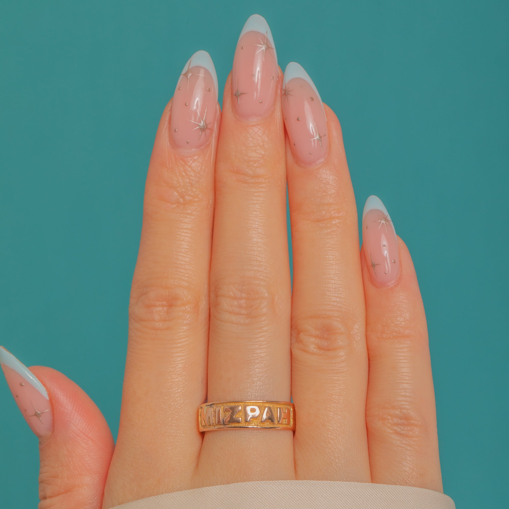 A classic Victorian “MIZPAH” ring in rich 18ct Gold, the word picked out in bold raised letters against a recessed, textured panel. The shoulders taper to a smooth, comfortable shank, creating a clean, graphic silhouette that feels both sentimental and striking.