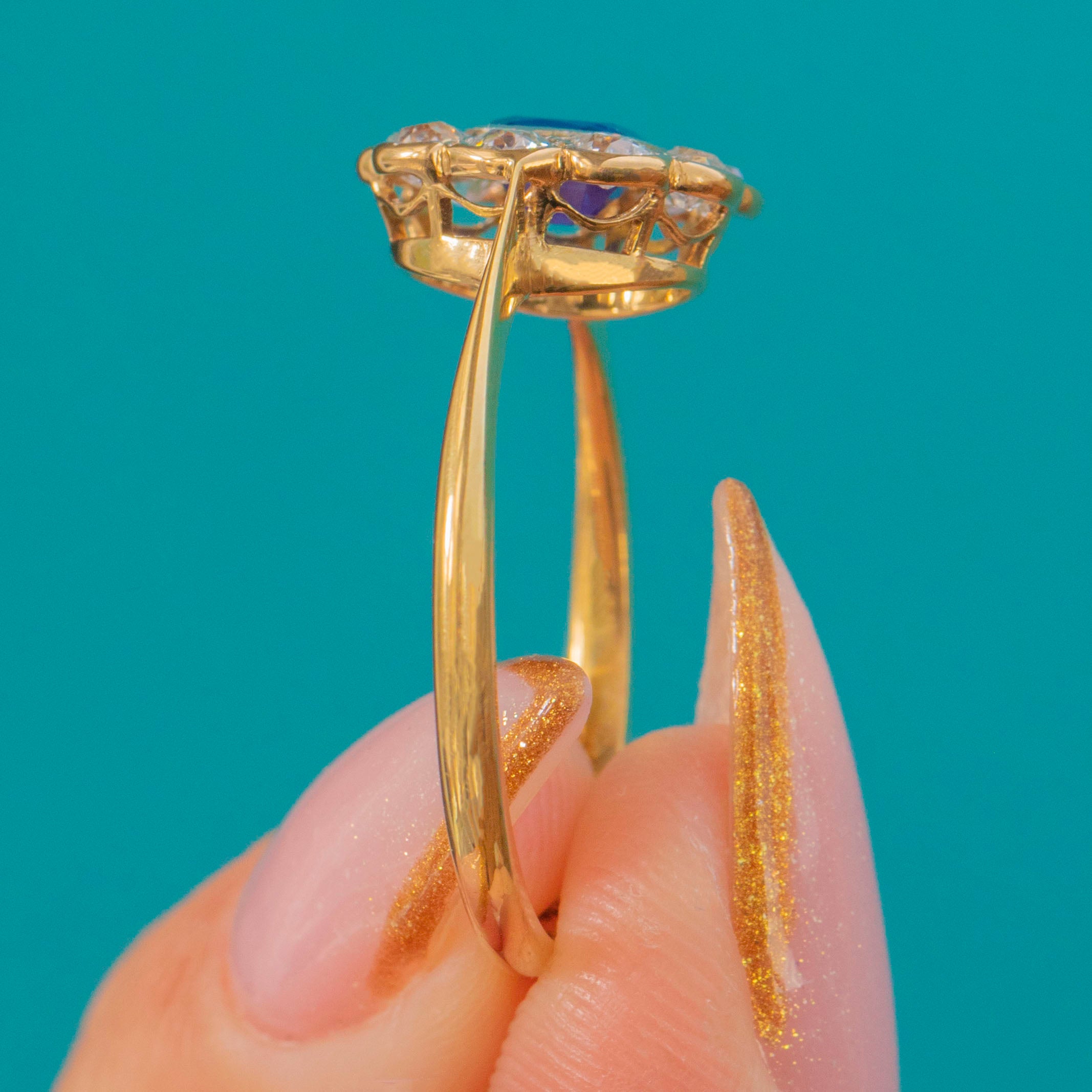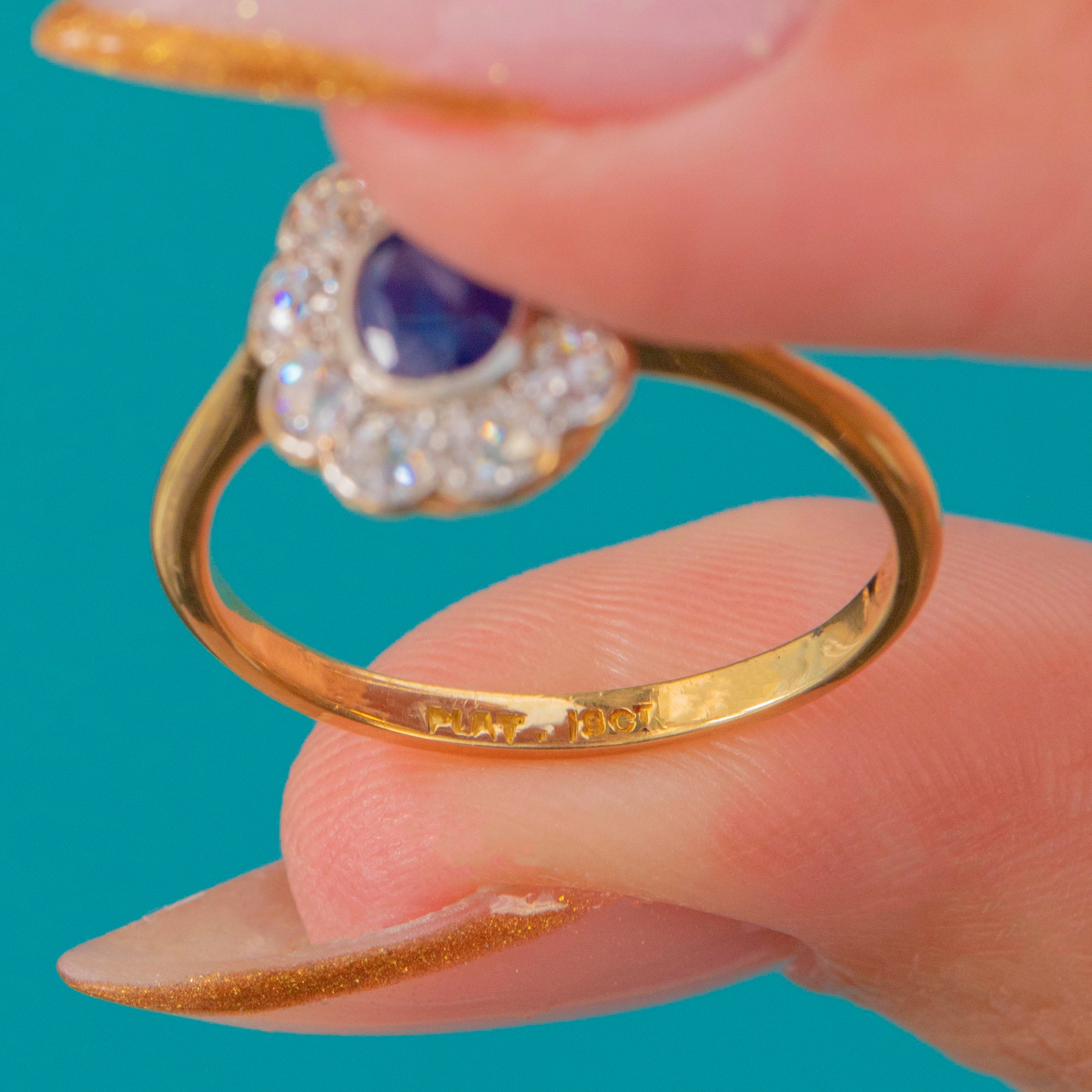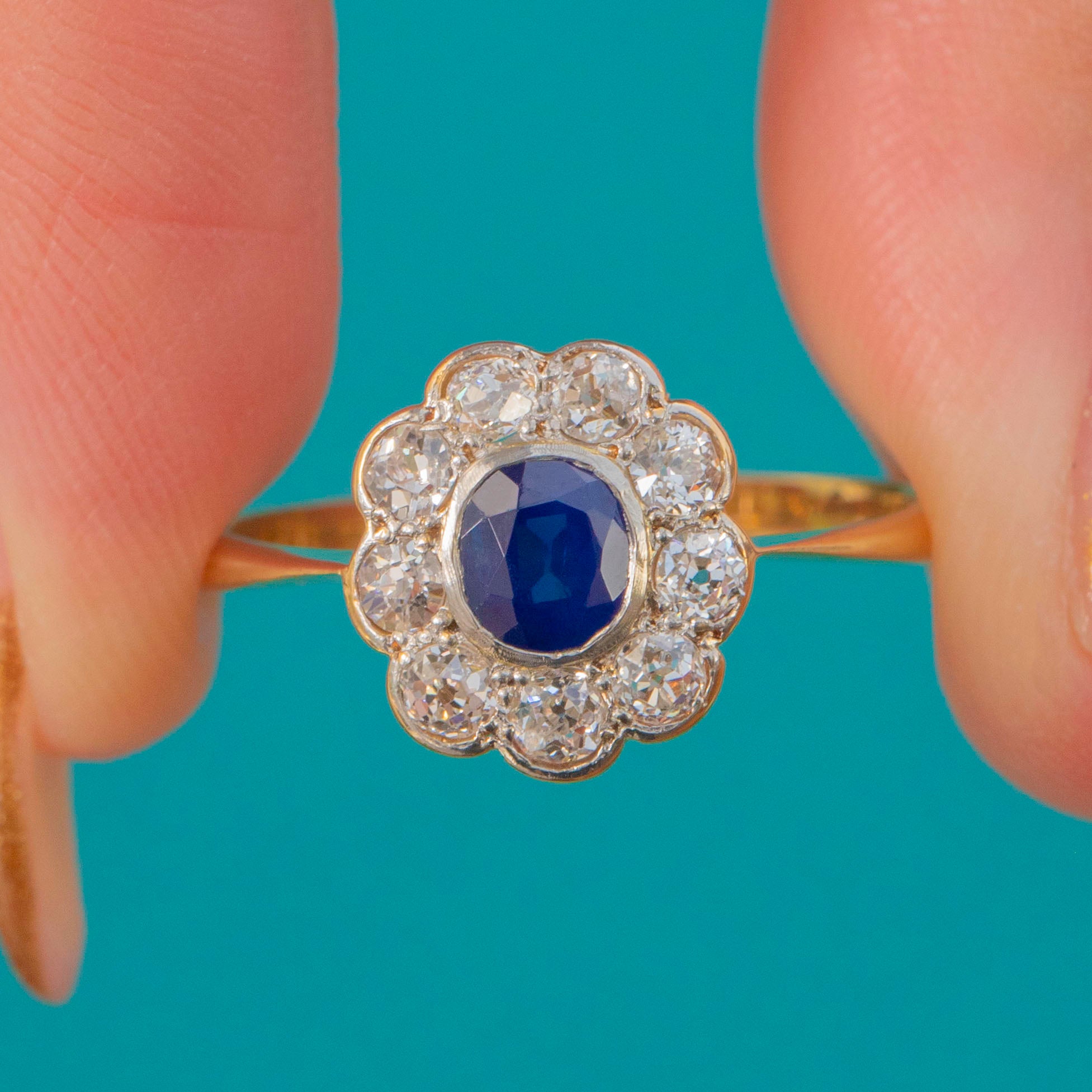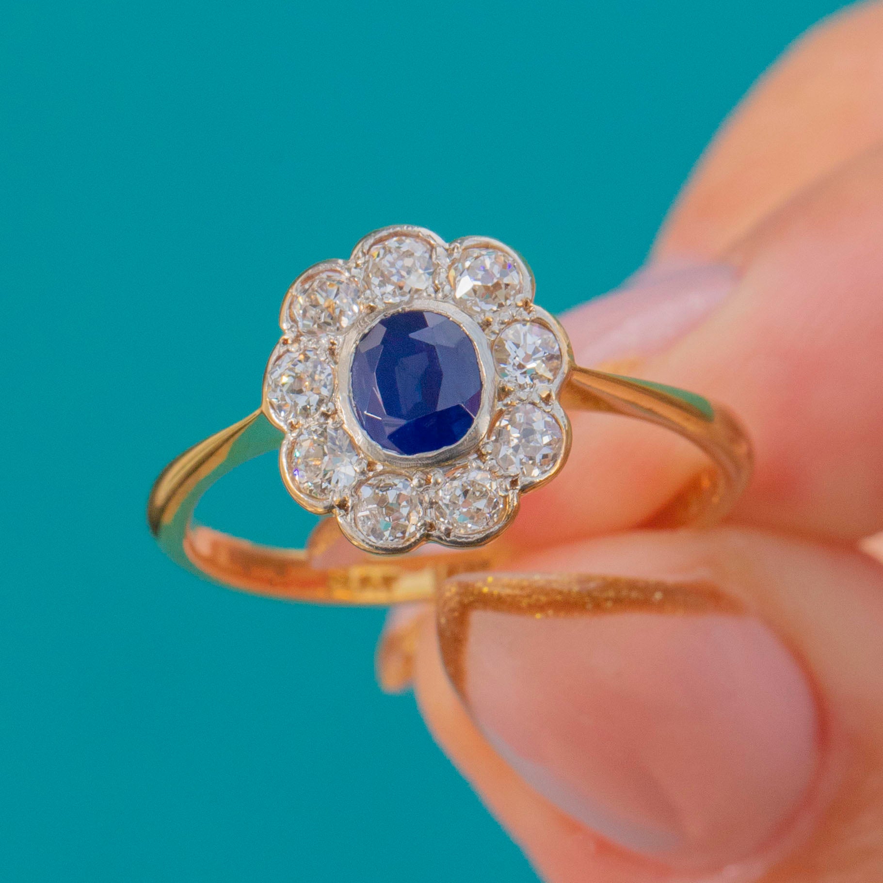 A timeless Edwardian beauty, this natural Sapphire and Diamond cluster ring radiates elegance from every angle. The vivid royal blue Sapphire sits proudly at the centre, surrounded by a halo of ten scintillating old mine cut Diamonds, all set in delicate Platinum over rich 18ct Yellow Gold.
