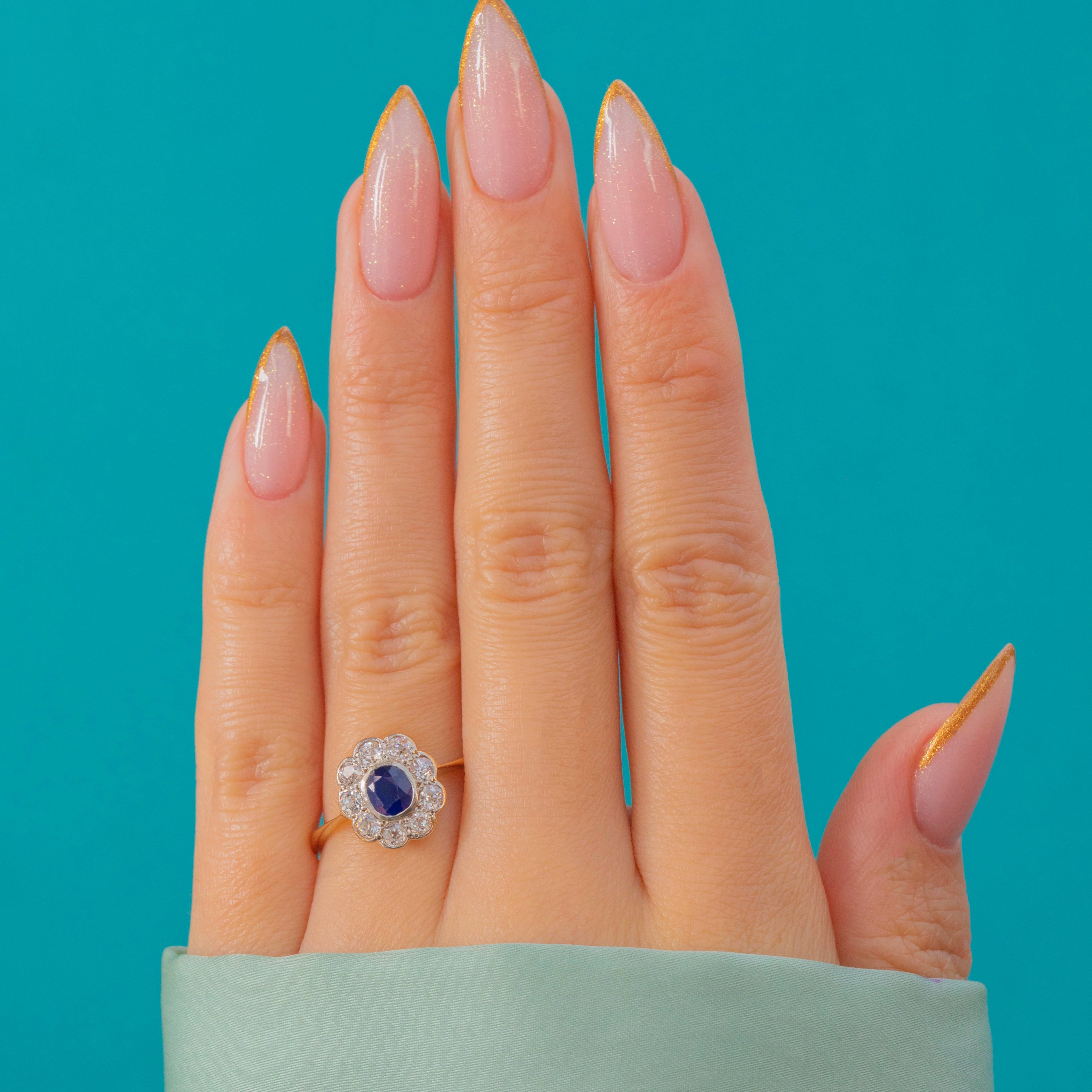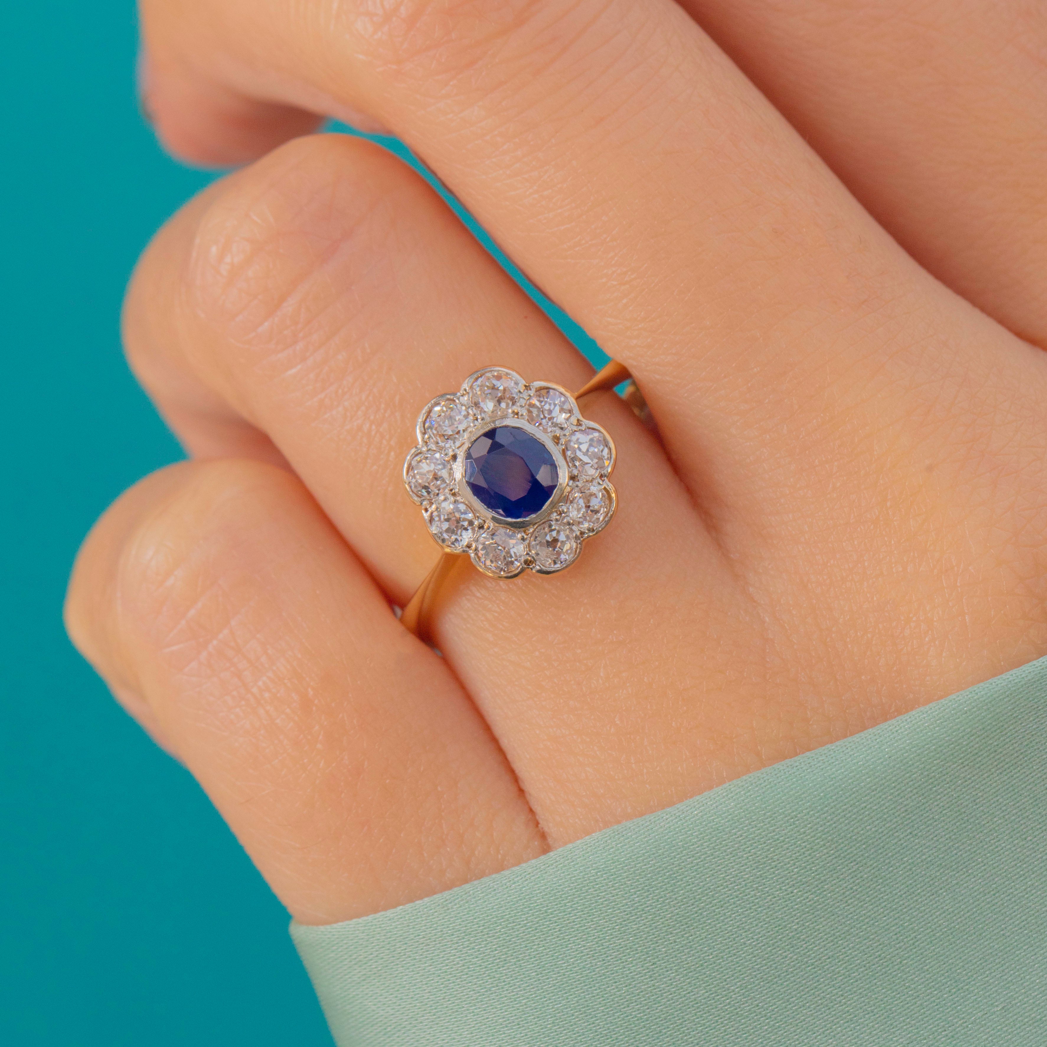 The central Sapphire weighs approximately 0.50ct and displays a deep, velvety tone, beautifully complemented by 0.60ct of bright antique Diamonds graded H–I in colour and VS–SI clarity. A classic gemstone combination and an enduring favourite for engagement rings and heirloom collectors alike.
