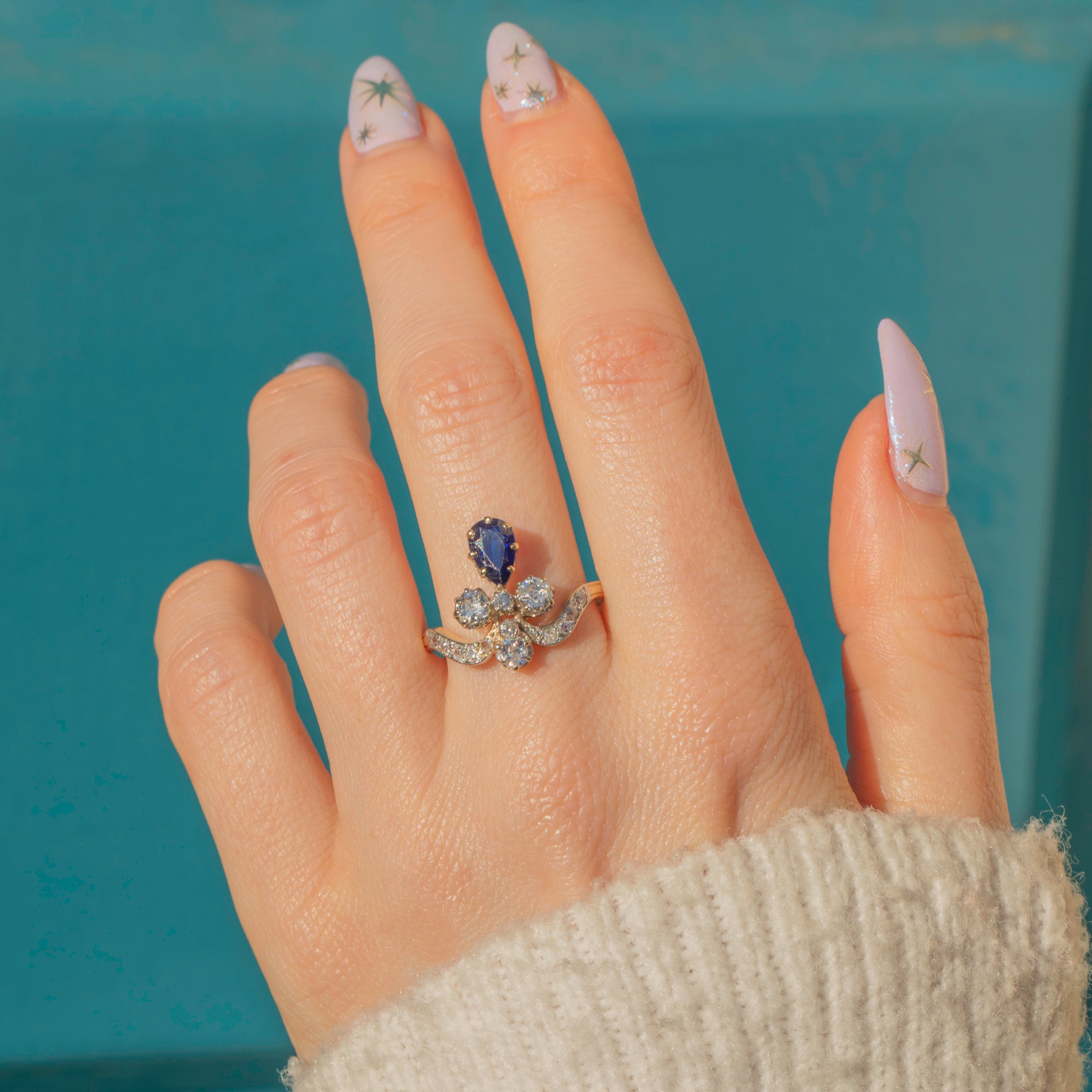 This exquisite antique 18ct Gold Sapphire & Diamond tiara ring is a true treasure, crafted in 18ct yellow Gold with elegant curves and intricate detailing. At her heart sits a stunning pear-cut 0.45ct Sapphire, her deep blue hue beautifully complemented by a sparkling array of Diamonds, totalling 0.75ct.