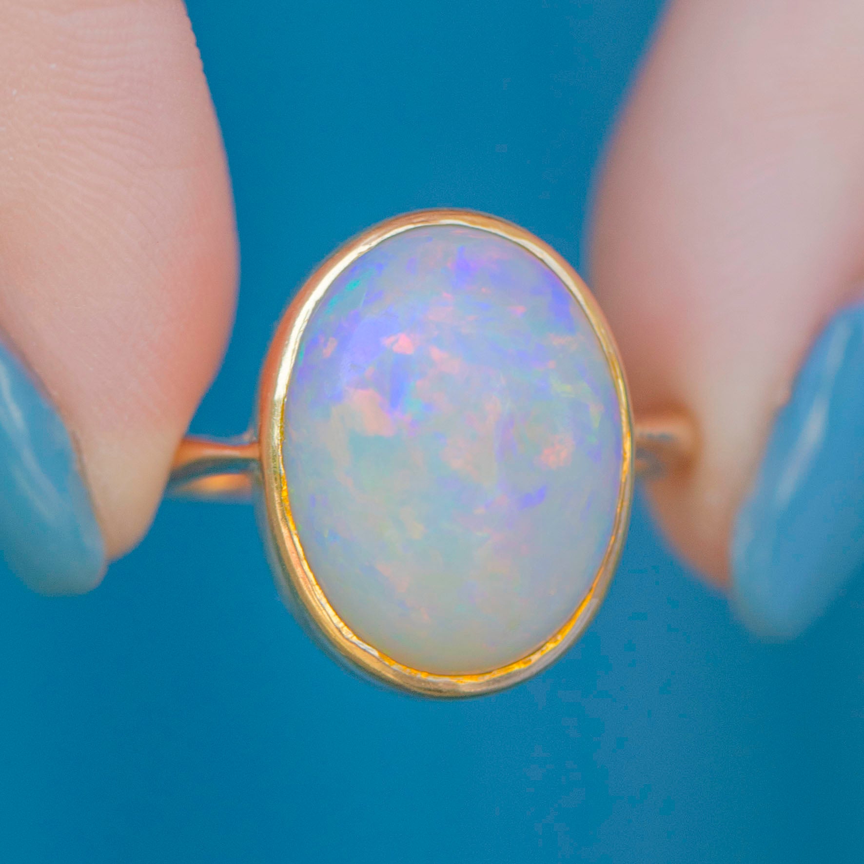 Prepare to be mesmerised by this antique 18ct Gold Opal cabochon ring! With her chunky iridescent 3.52ct Opal tones boasting hues of zingy pinks, shimmering blues, and hints of neon green, we think she is positively magical!