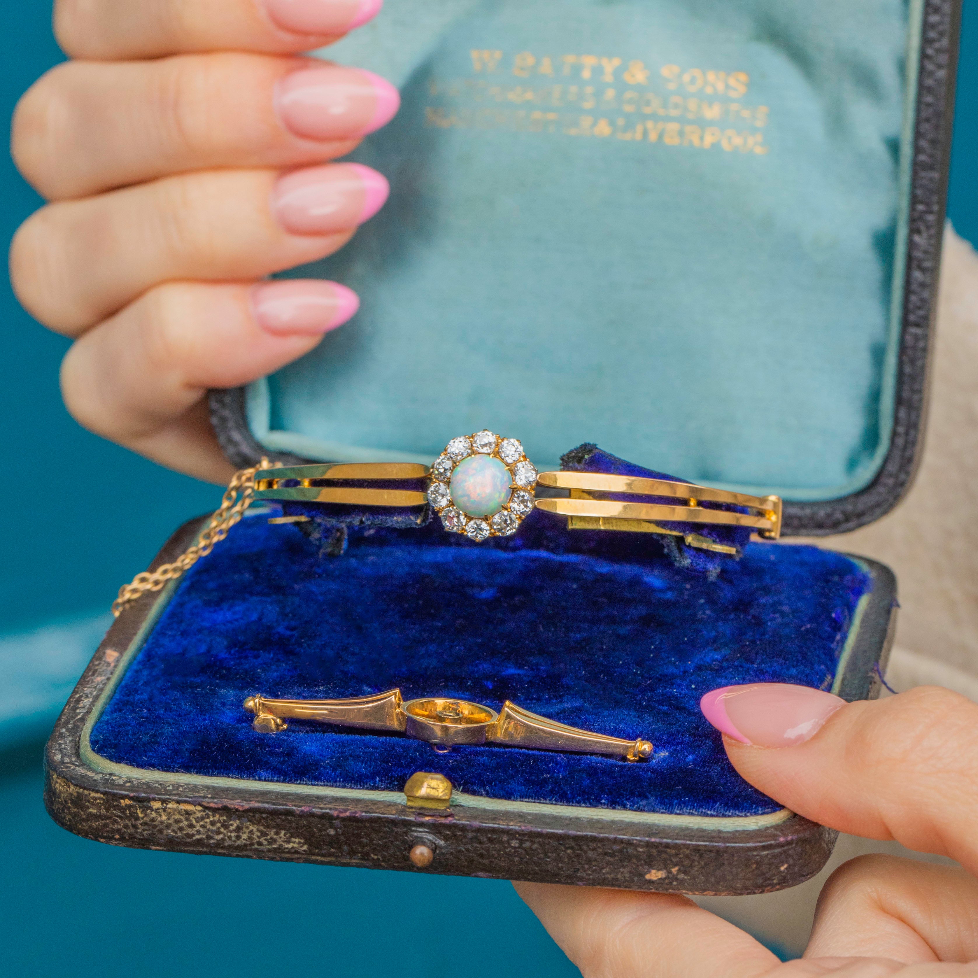 EXCELLENT. This antique 18ct Gold Opal Diamond bangle is offered in excellent condition. The Opal is secured within its setting and is free from nibbles or chips. The Diamonds are sparkly, securely set and free from fleabites. The 18ct & 15ct Gold is lustrously shiny and has remained unscathed over the years. The bangle features a subtle clasp providing you with a secure and comfortable closure, with added protection from the safety chain. The brooch fitting is in perfect working condition allowing you to wear this superb piece of Edwardian jewellery however you please!
