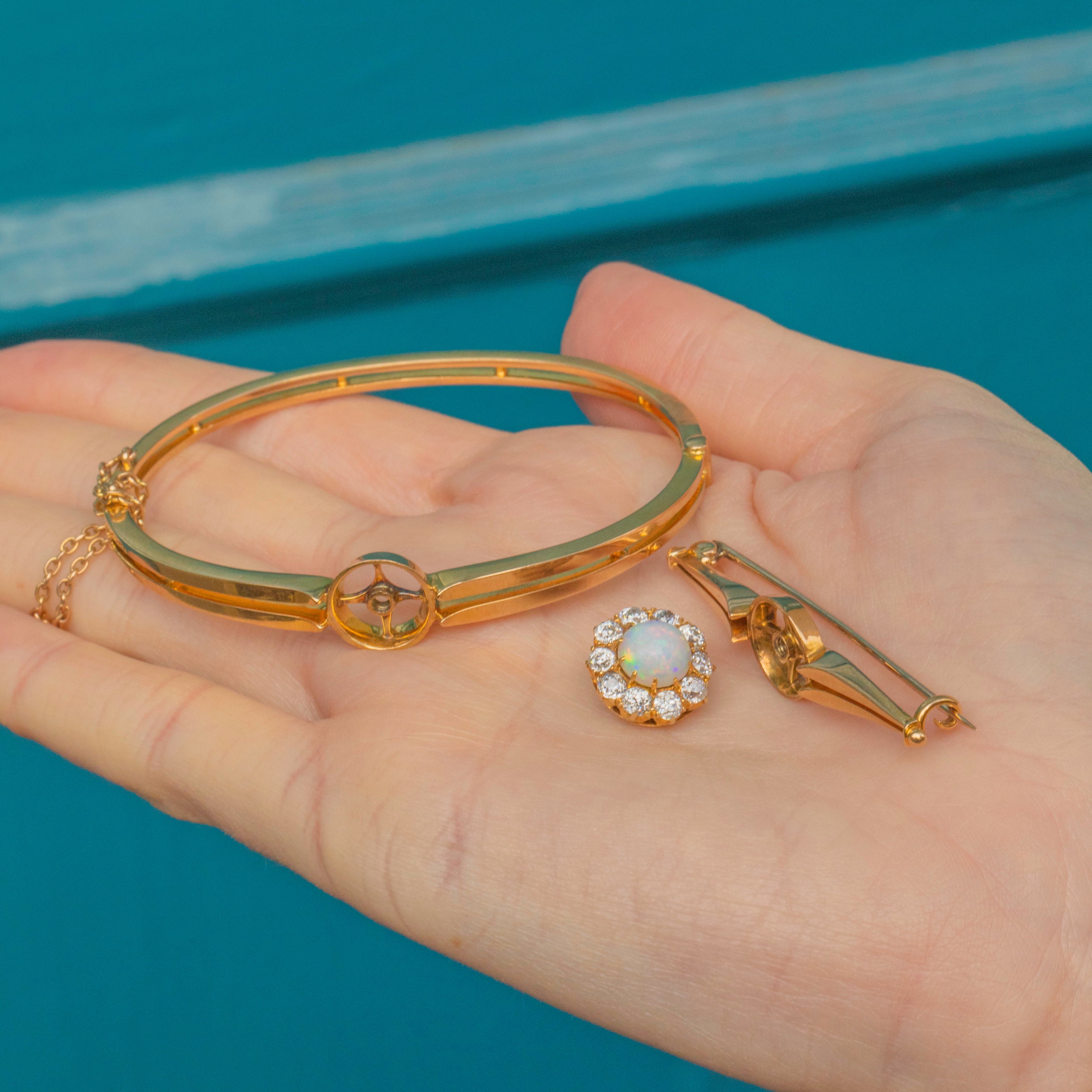 Antique 18ct Gold Opal Diamond Bangle in Fitted Box, with Brooch Attachment