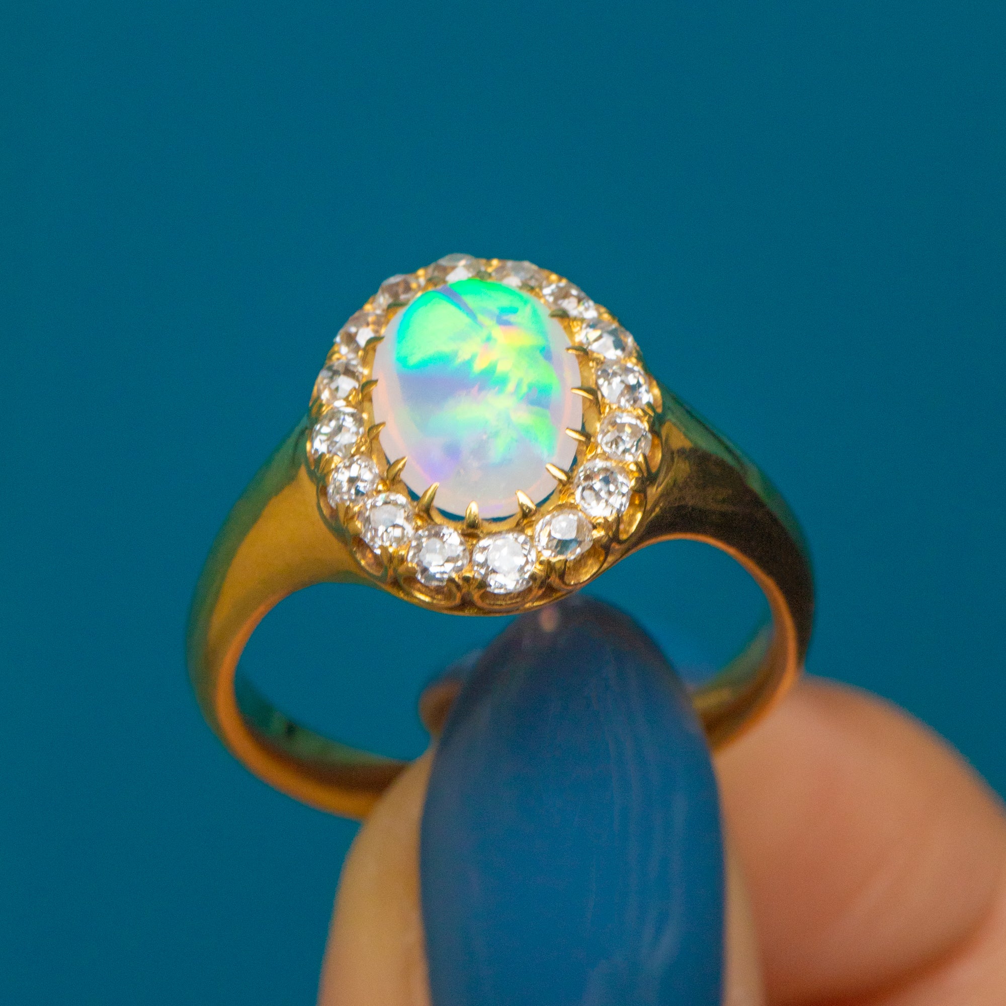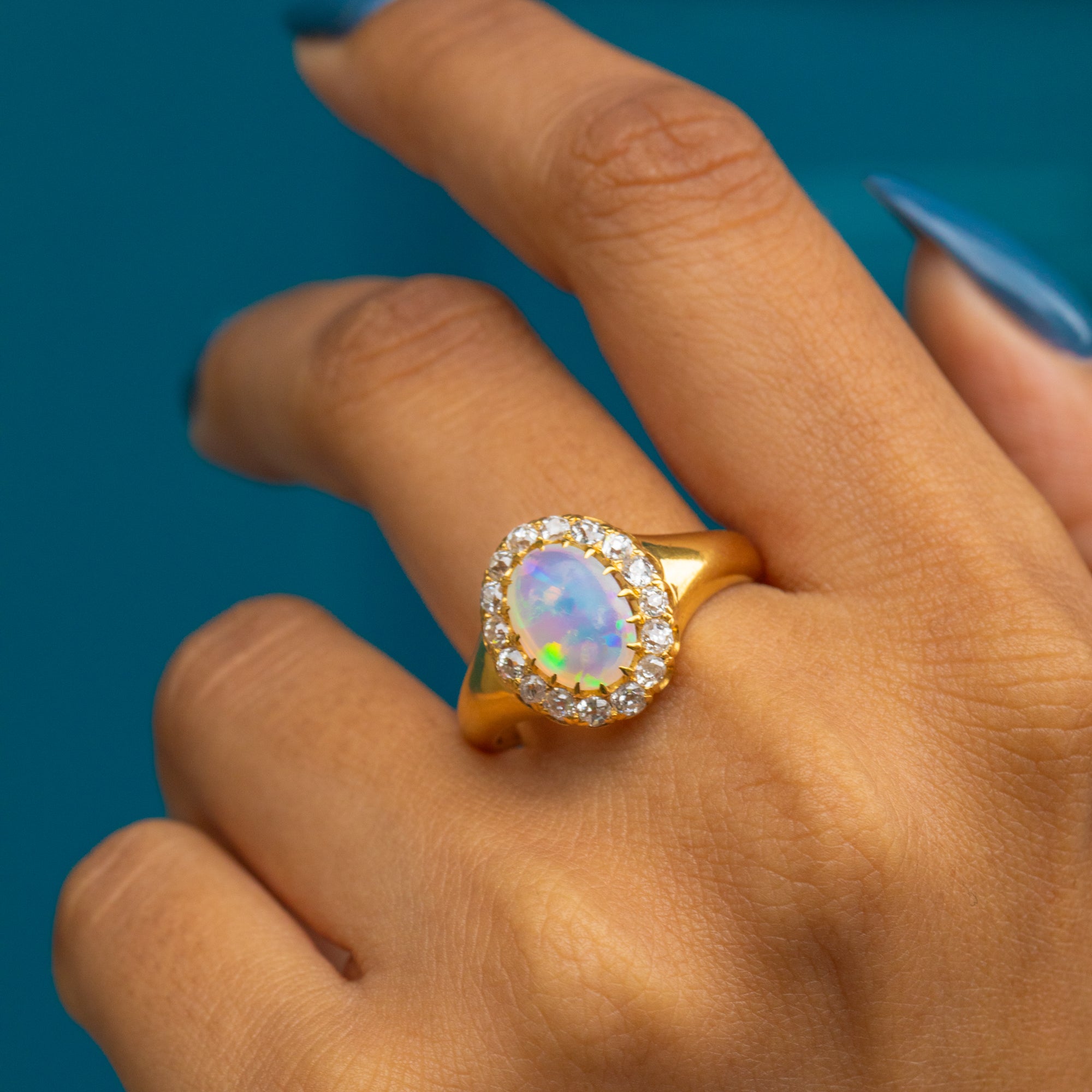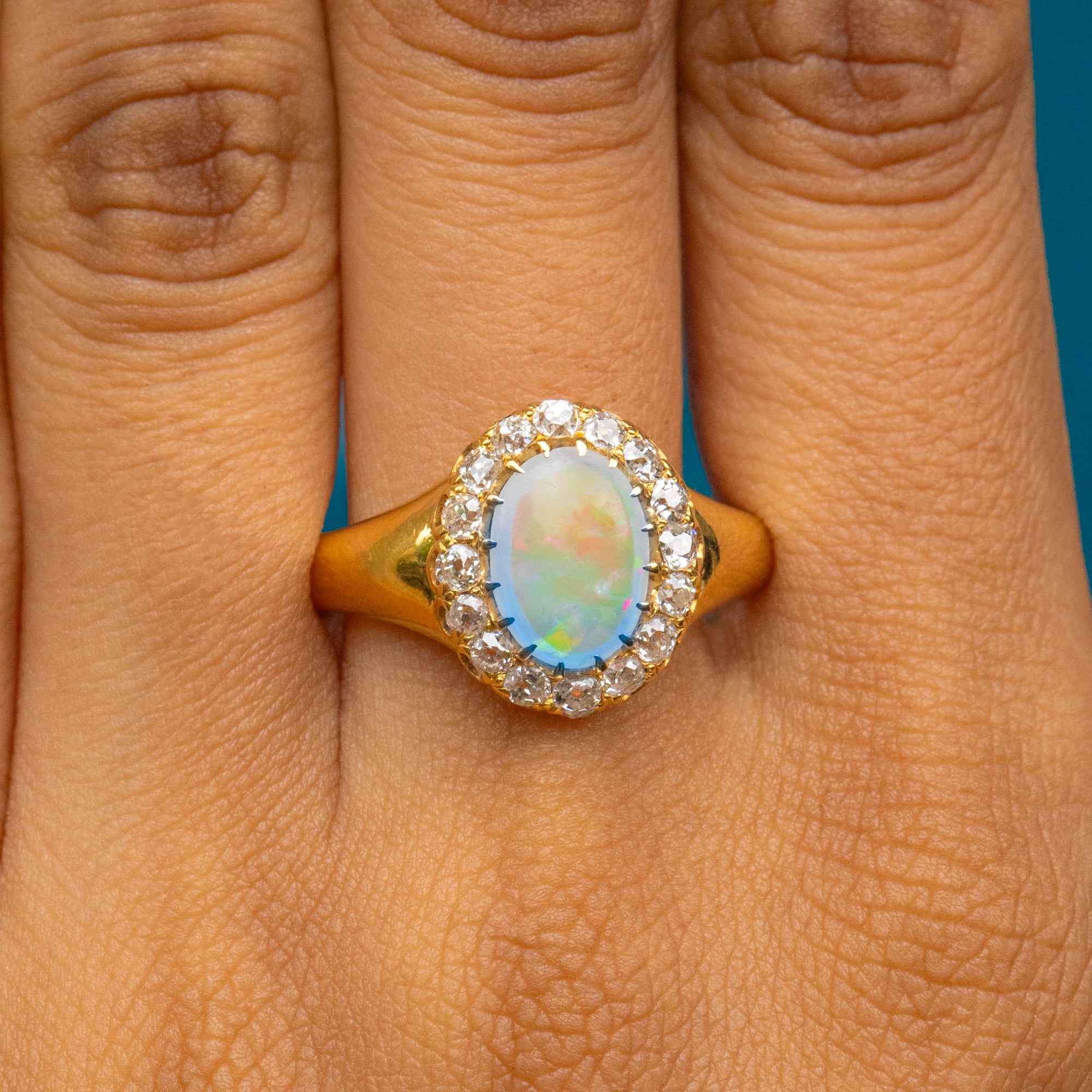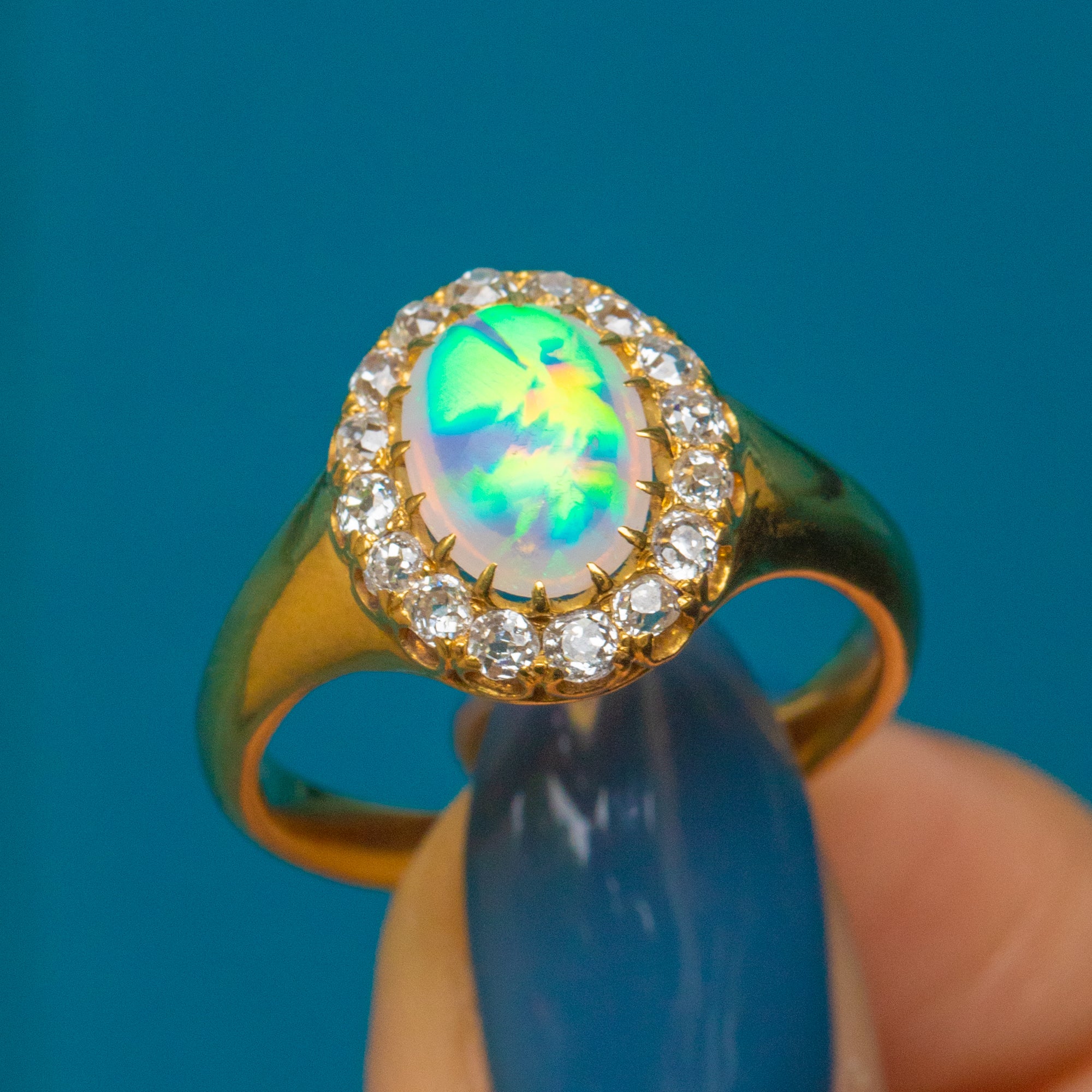 Prepare to be dazzled by this resplendent antique 18ct Gold Opal Diamond cluster ring! The mesmerising 2.50ct Opal cabochon radiates electric greens and bursts of orange; her joyful colours dance under the light. A halo of 16 dazzling old-mine cut Diamonds twinkle around the Opal, all set into 18ct Gold for a luxurious finish.