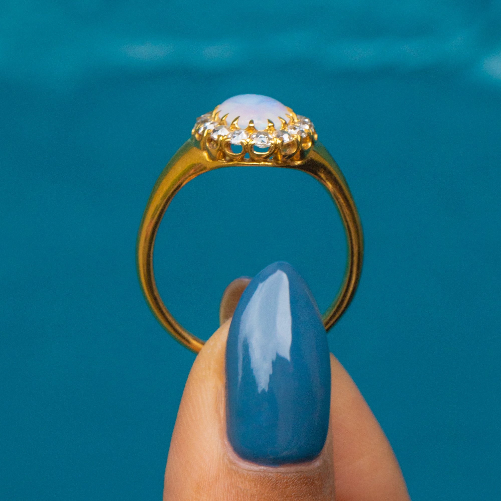 VERY GOOD TO EXCELLENT. This antique 18ct Gold Opal Diamond cluster ring is offered in excellent condition. The Opal cabochon is smooth to the touch and free from any wear, with each claw present holding the Opal secure within its setting. The Diamonds have been well maintained and have preserved their natural sparkle. There is a resize mark visible inside the band on the back, but with proper care and maintenance, this ring will last for generations to come. This ring is the perfect addition to your antique jewellery box!