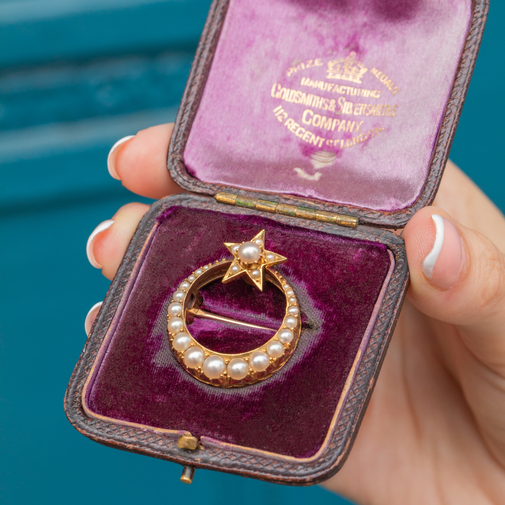Antique 18ct Gold Pearl Crescent Moon & Star Brooch, Original Fitted Box