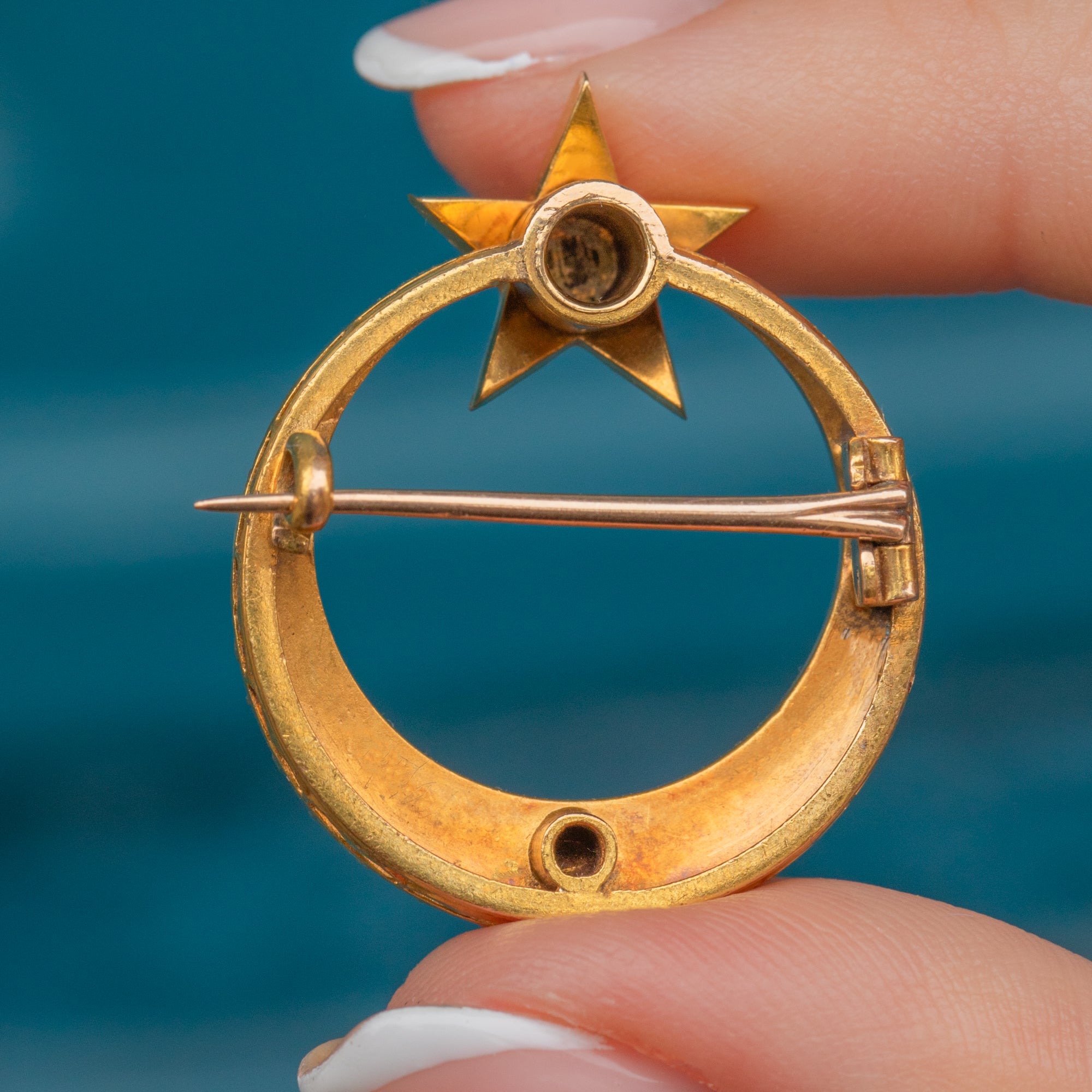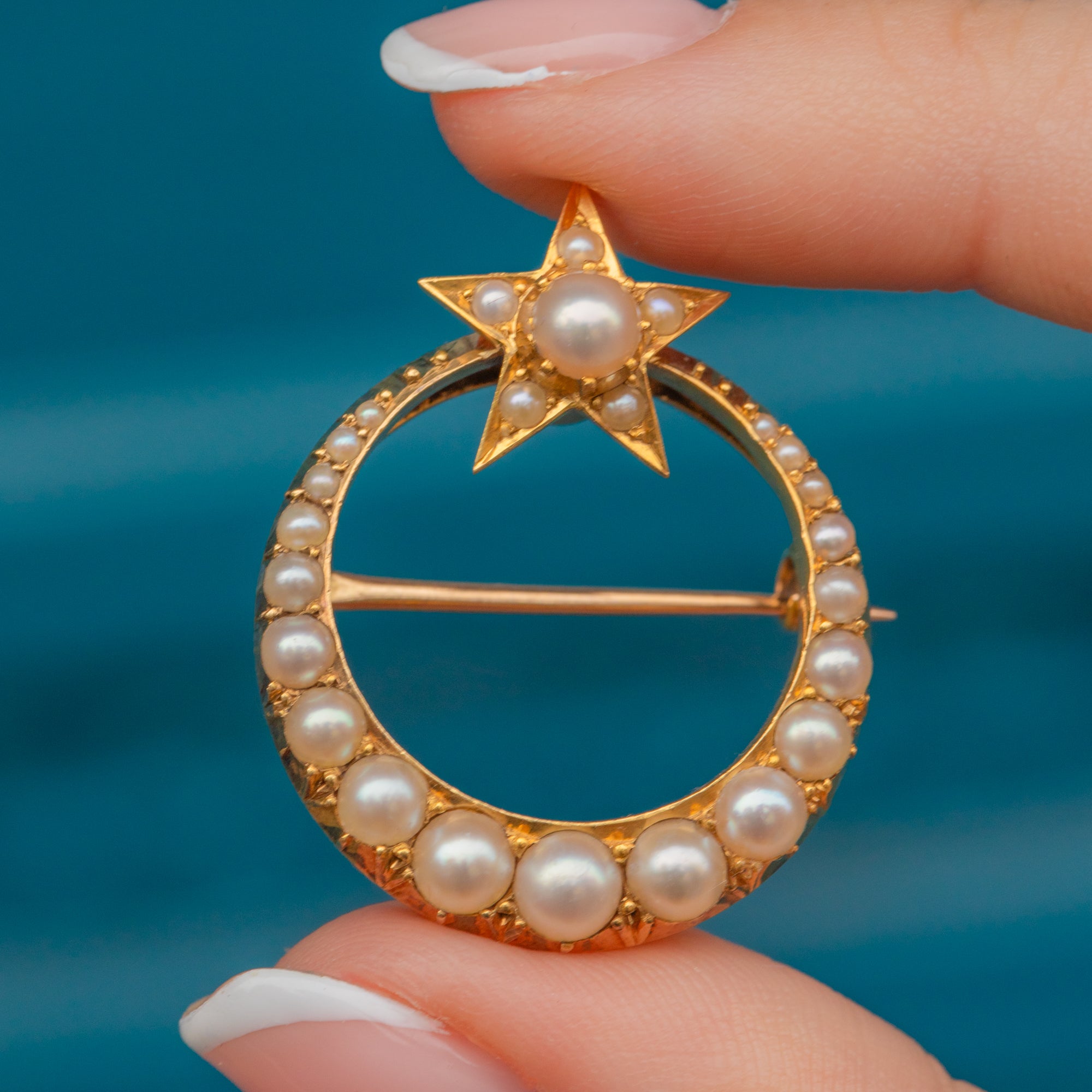 We have been left starstruck by this antique 18ct Gold Pearl crescent moon & star brooch. Sprinkled with a generous helping of lustrous Pearls, this luxurious treasure is also steeped in symbolism!