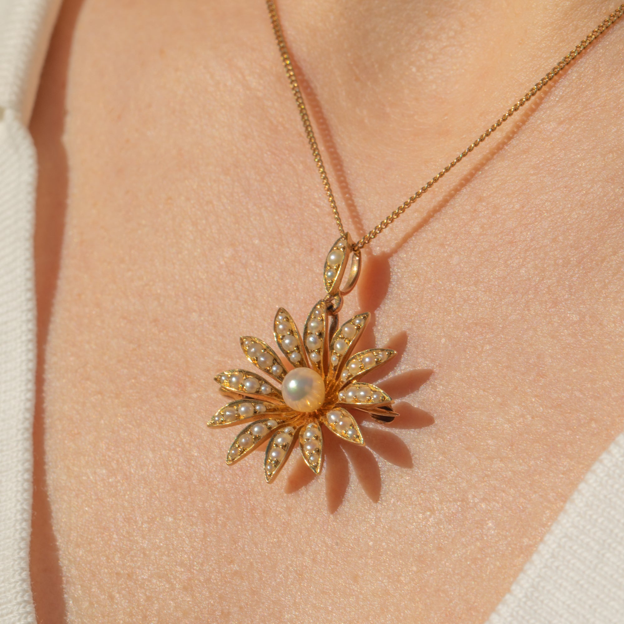 EXCELLENT. This antique 18ct Gold Pearl daisy flower pendant is in excellent condition. The lovely natural Pearl centre has a gorgeous ivory hue and pretty pink, lilac and gold overtones. Although the flower is 18ct Gold and the bale is 15ct, they do make for an incredible matching pair. The two purities of Gold in the pendant are unusual, but it appears original and well-matched. The pin is of lower purity, at 9ct Gold, which is quite typical of the era, and makes for a solid and robust pin. All the components are original and antique, with no damage.