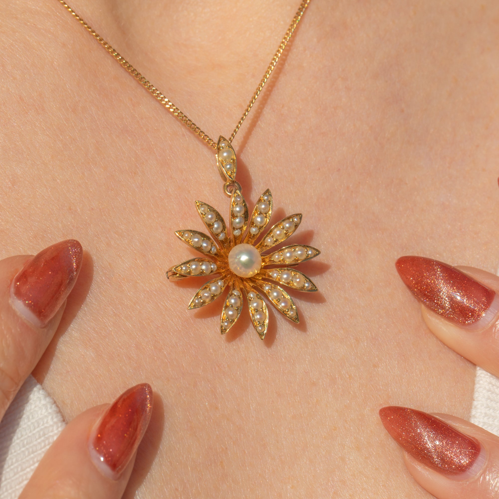 This antique 18ct Gold Pearl daisy flower pendant exudes femininity! The body of the flower is crafted from solid 18ct Gold with a decadent, saturated hue. The petals curve gently from the centre and are inlaid with split Seed Pearls, elegantly framing the whole, natural Pearl.