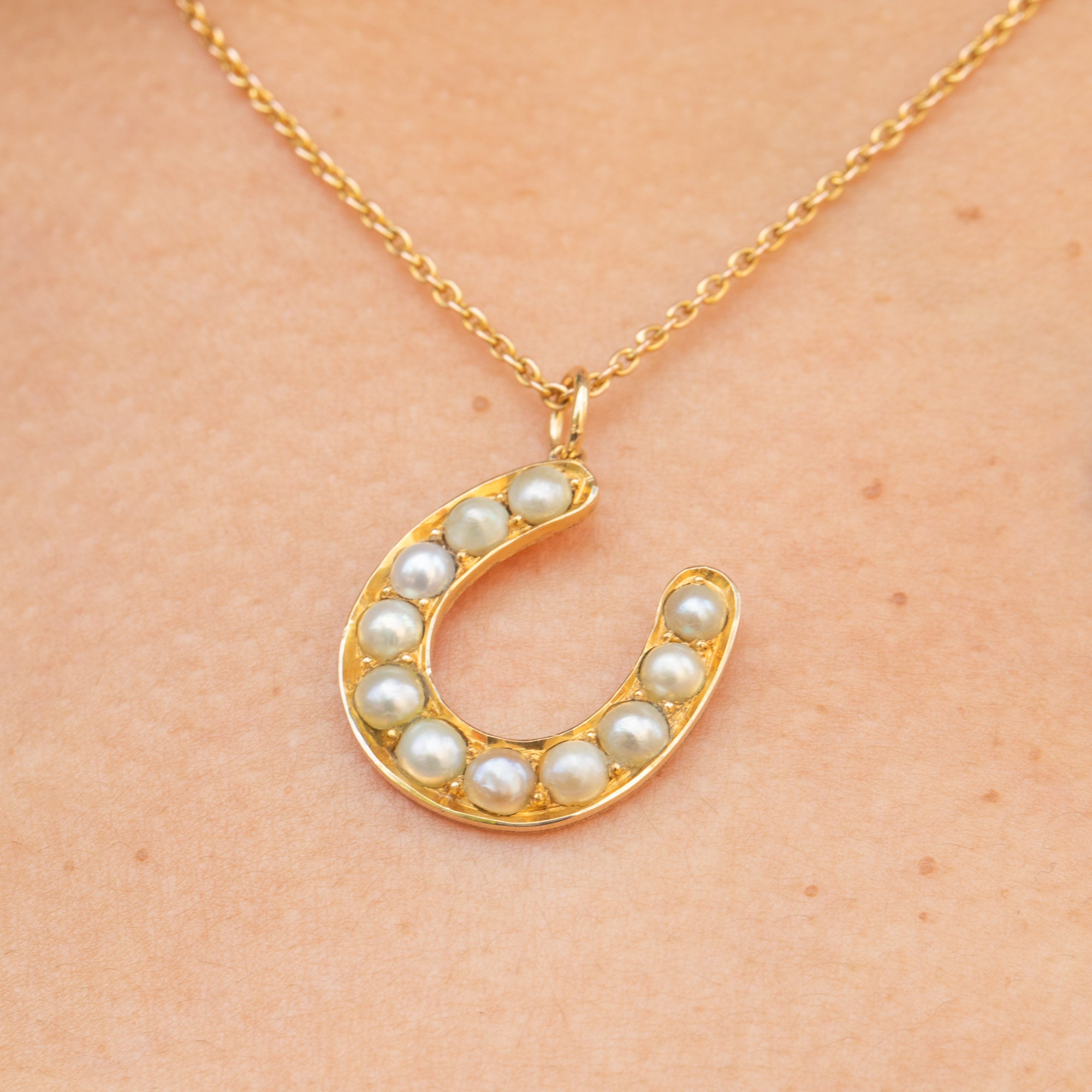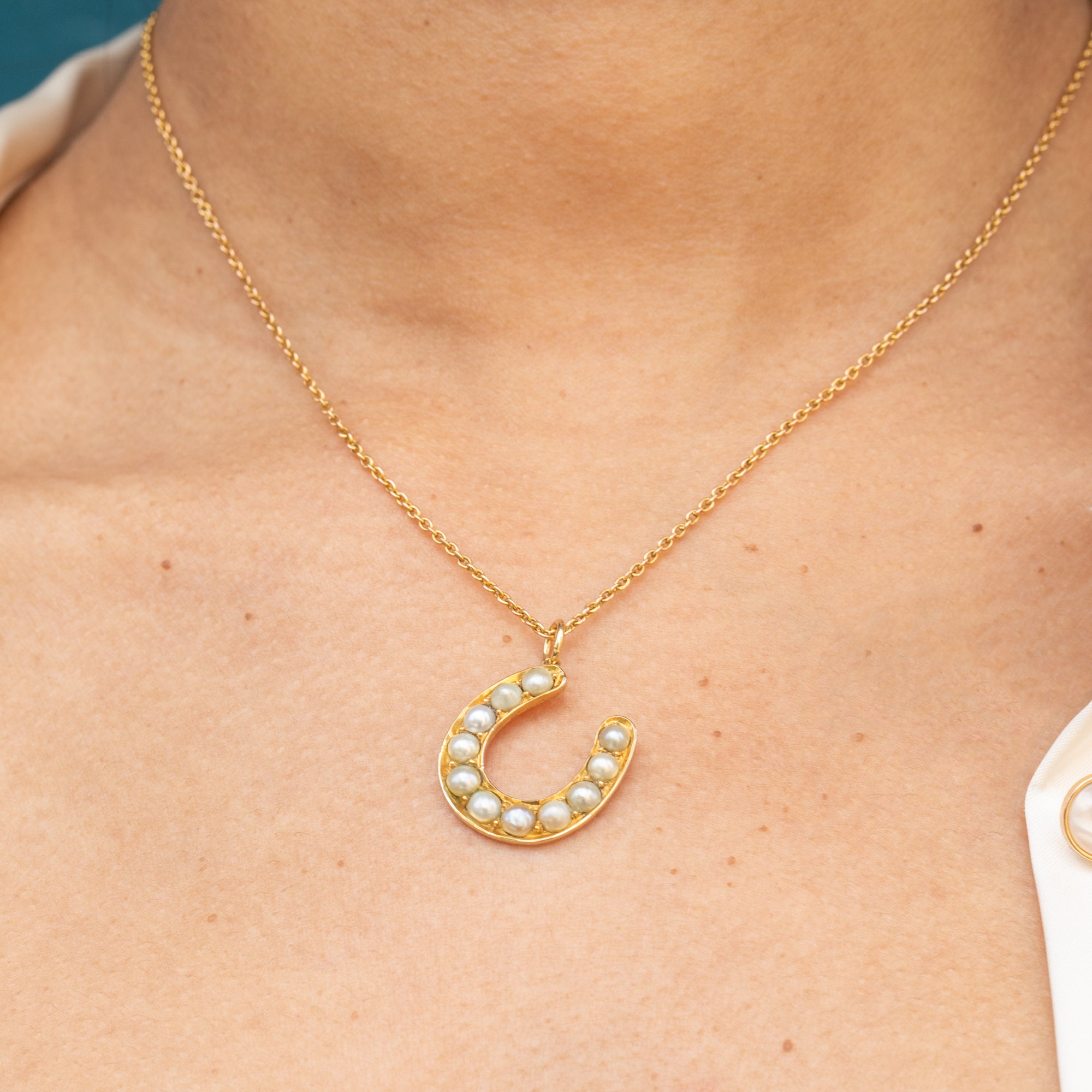 Bring some luck into your life with this endearing antique 18ct Gold Pearl horseshoe pendant! With a row of plump lustrous Pearls set into 18ct Gold, this pendant exudes Victorian charm.