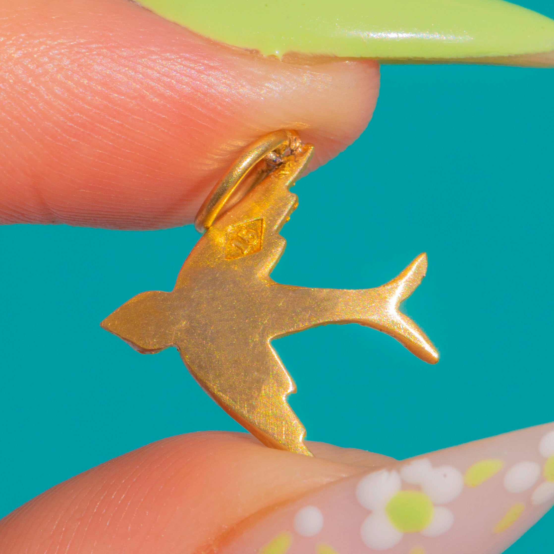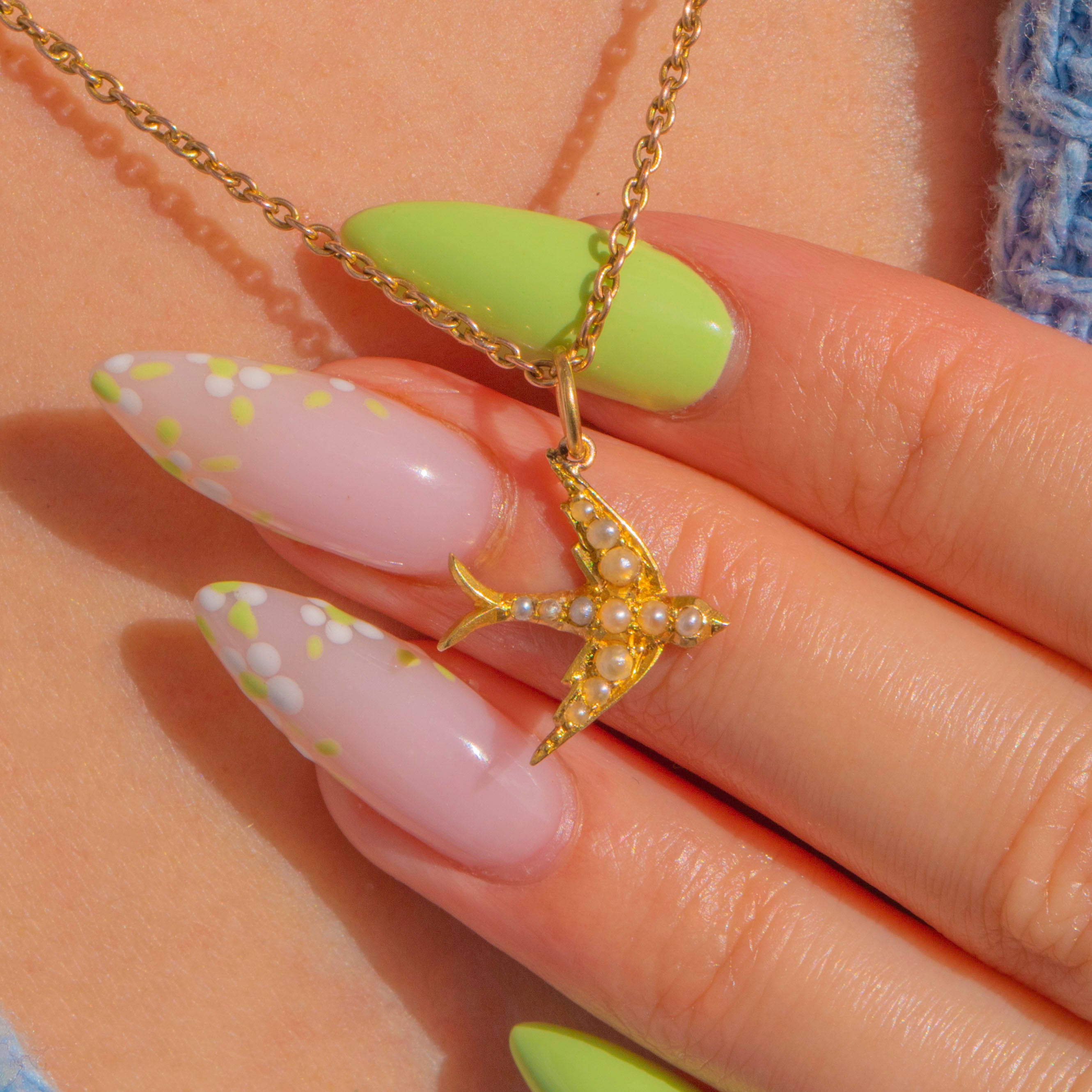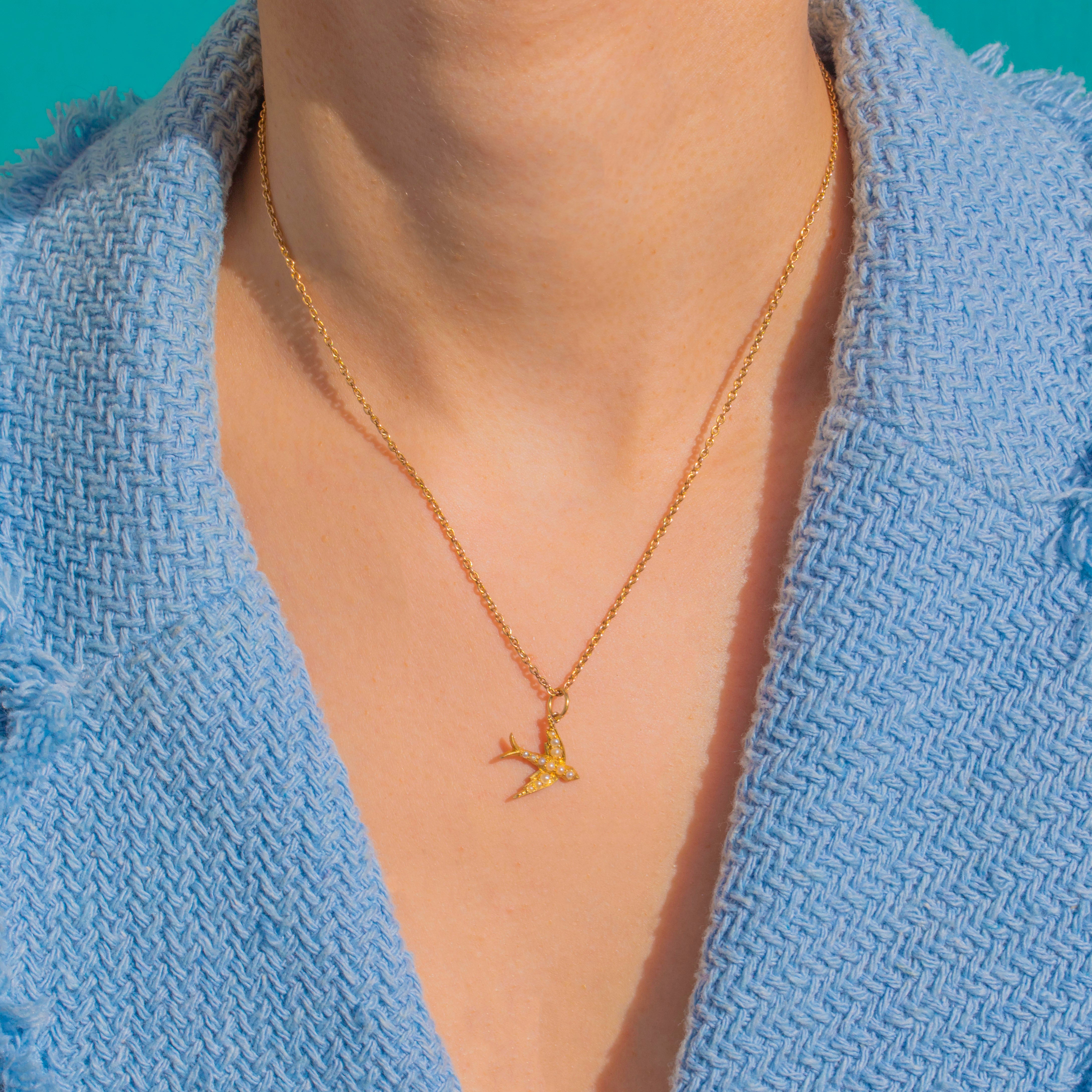 A petite Victorian swallow charm in rich 18ct Gold, glinting with delicate Pearls. The bird’s graceful silhouette is dotted with lustrous Seed Pearls across the wings and body, lending soft shimmer and a beautifully textured finish.