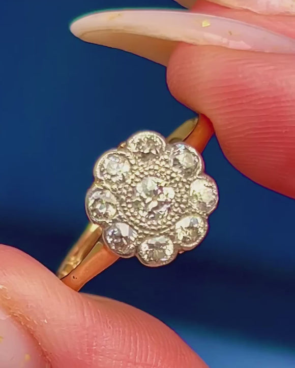 Charmingly refined and effortlessly wearable, this Art Deco Diamond cluster ring marries a cool Platinum-topped head with a warm 18ct Gold band. A radiant round Diamond sits at the centre, haloed by eight sparkling companions, each neatly framed with delicate millegrain for that quintessential period finish. The floral rosette silhouette, petite in scale yet wonderfully bright, feels timeless and elegant from every angle.