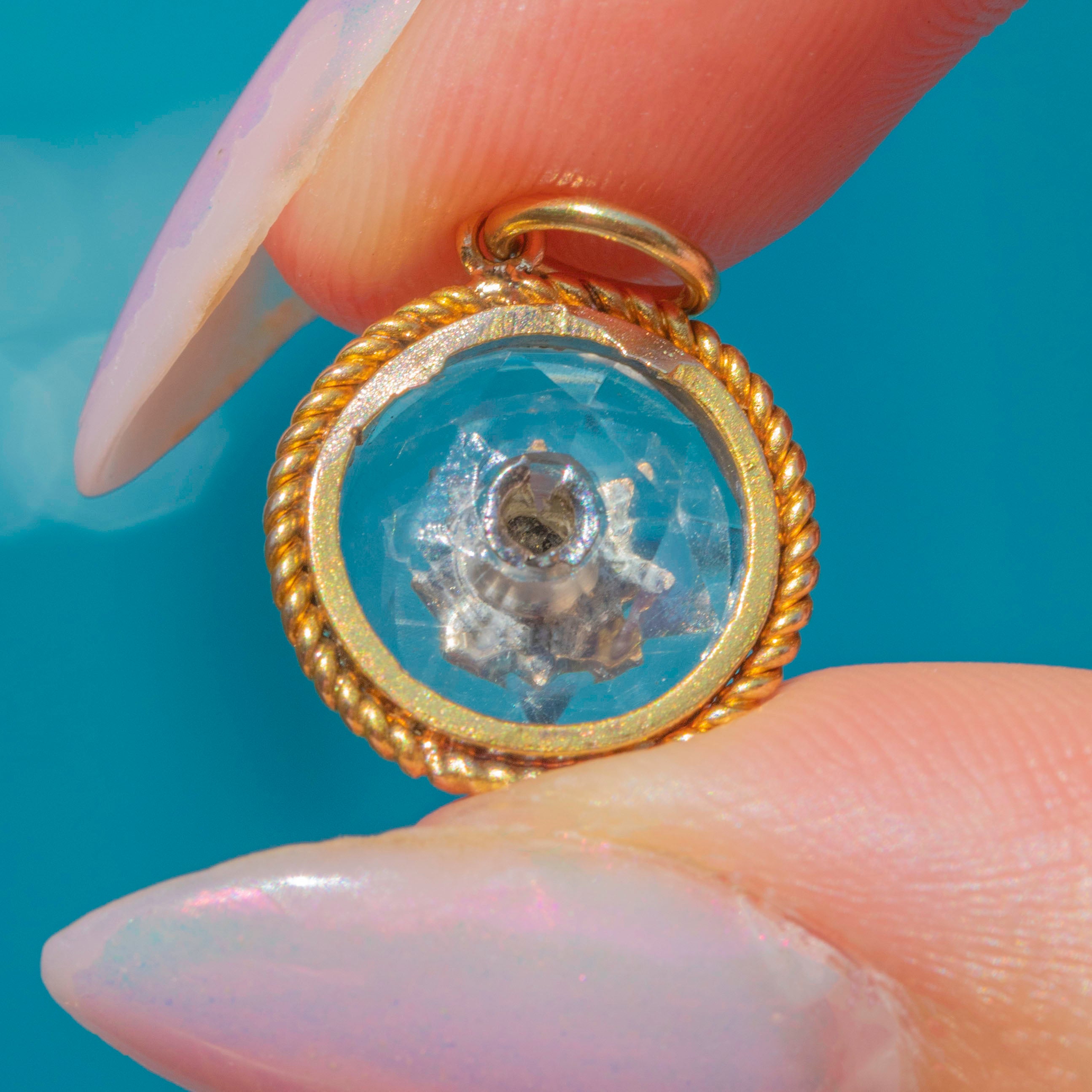 This antique Rock Crystal charm perfectly captures the unique jewellery designs to come from the Victorian era. The crisply faceted Rock Crystal has been skillfully set with a dainty Peridot cabochon within an intricate star motif, adding bundles of celestial charm!