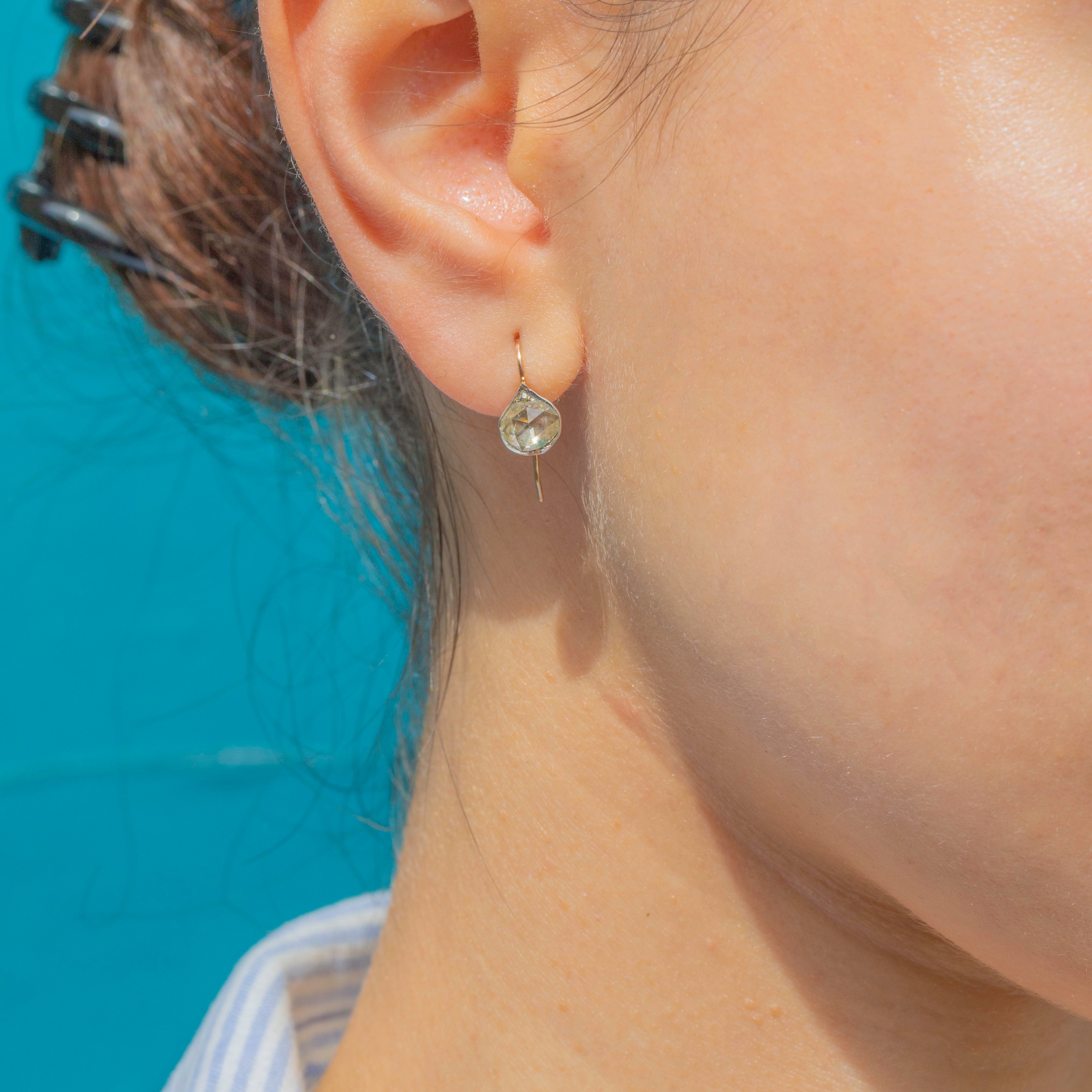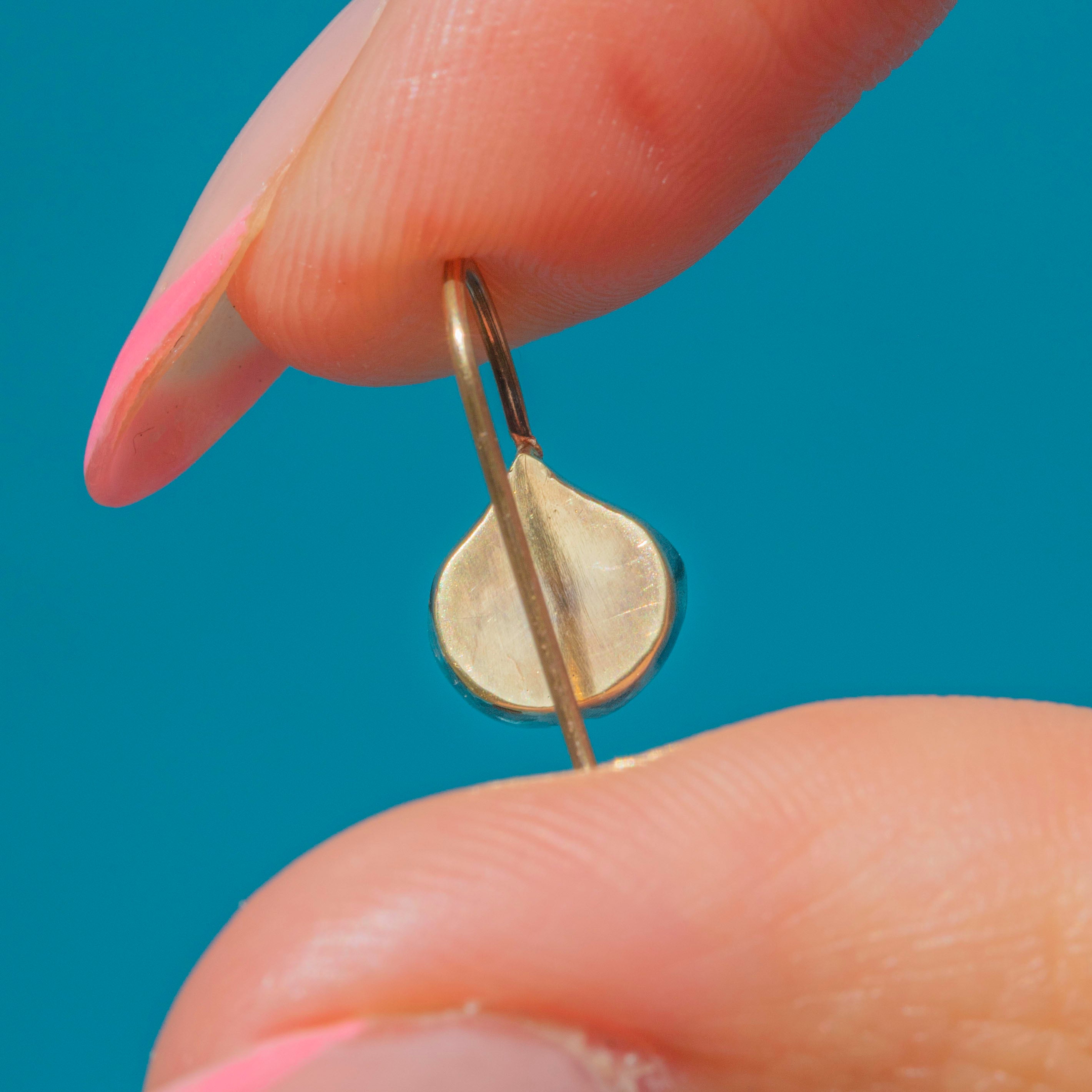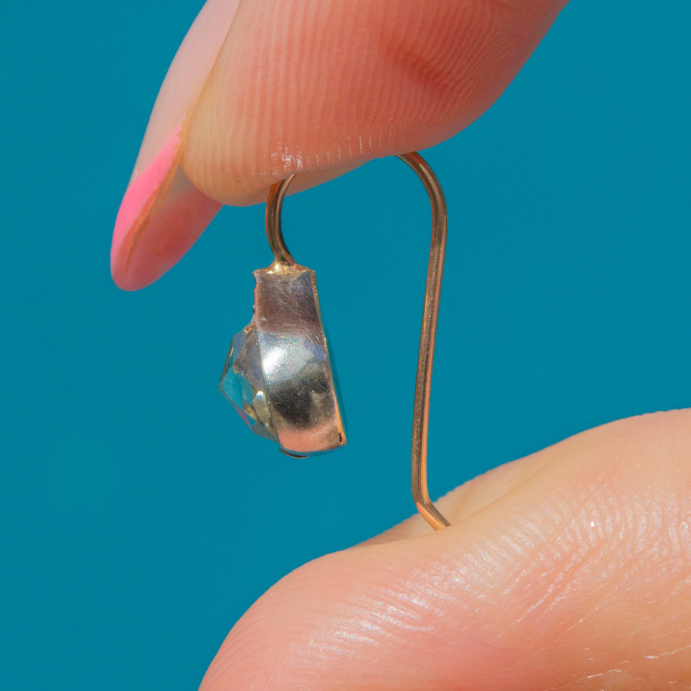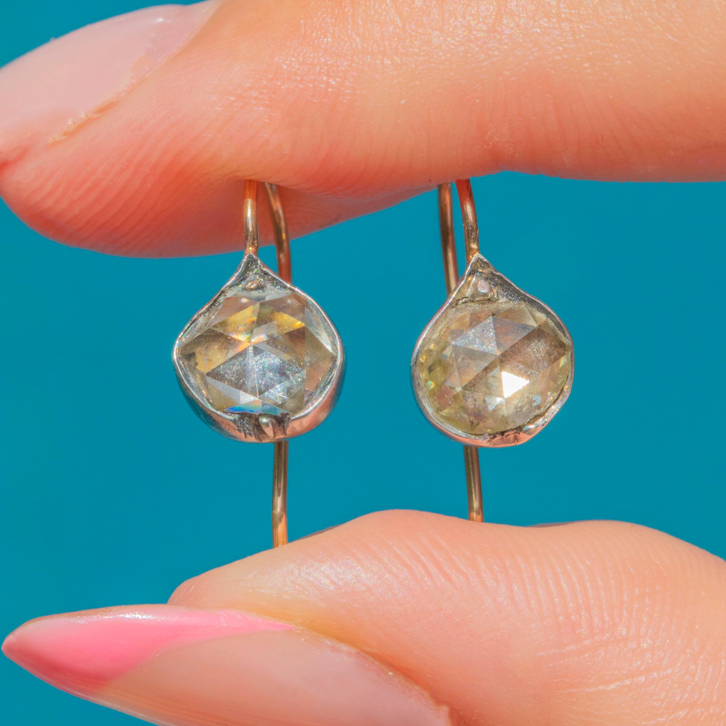 EXCELLENT: These antique 18ct Gold rose-cut Diamond earrings are in excellent condition, especially when considering their impressive age! The Diamonds are bright with crisp facets, with no fleabites or abrasions visible. The Silver bezels have accrued an admirable patina, adding to their antique charm, and hold the Diamonds securely in place. The 18ct Gold hooks are firmly soldered, with their slender form making these Victorian Diamond earrings comfortable to wear! As the Diamonds are set in closed-back settings, we would recommend avoiding getting them wet or exposing them to chemicals (perfume, etc.).