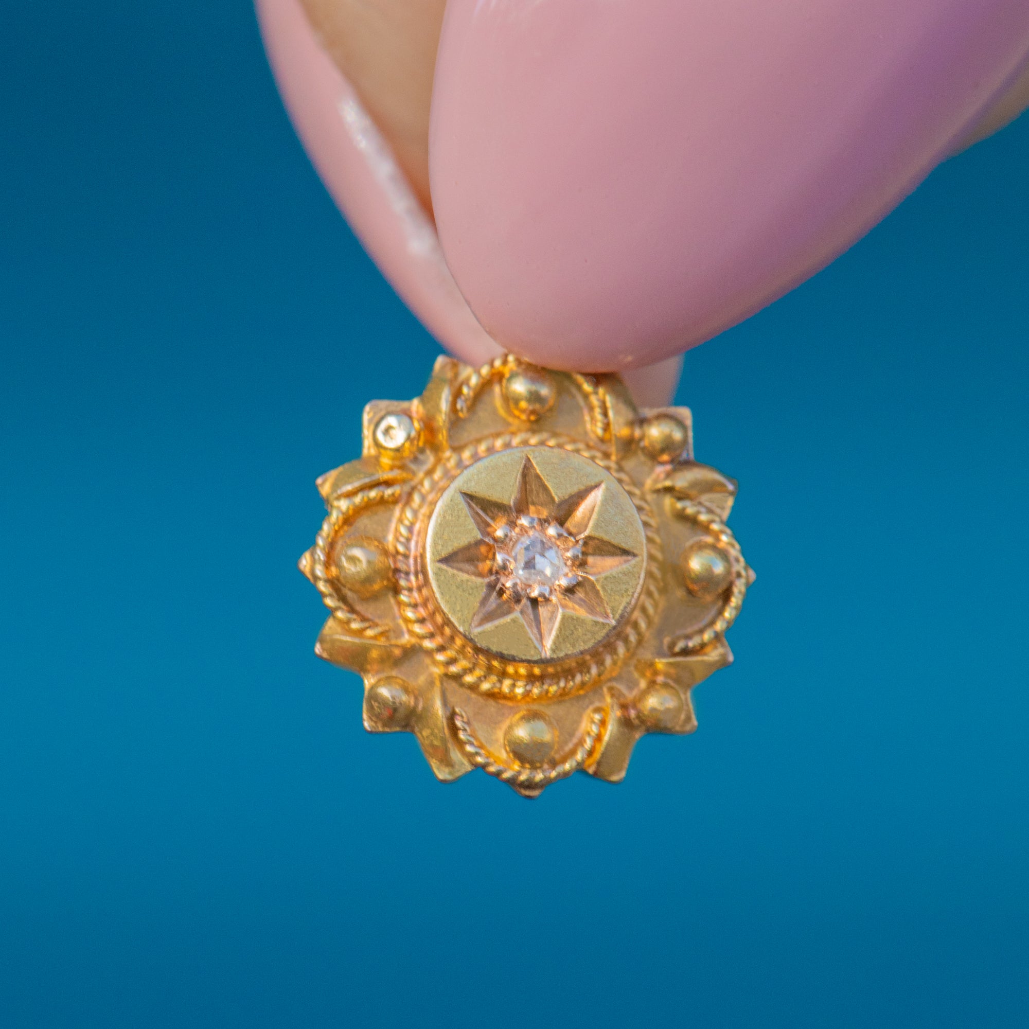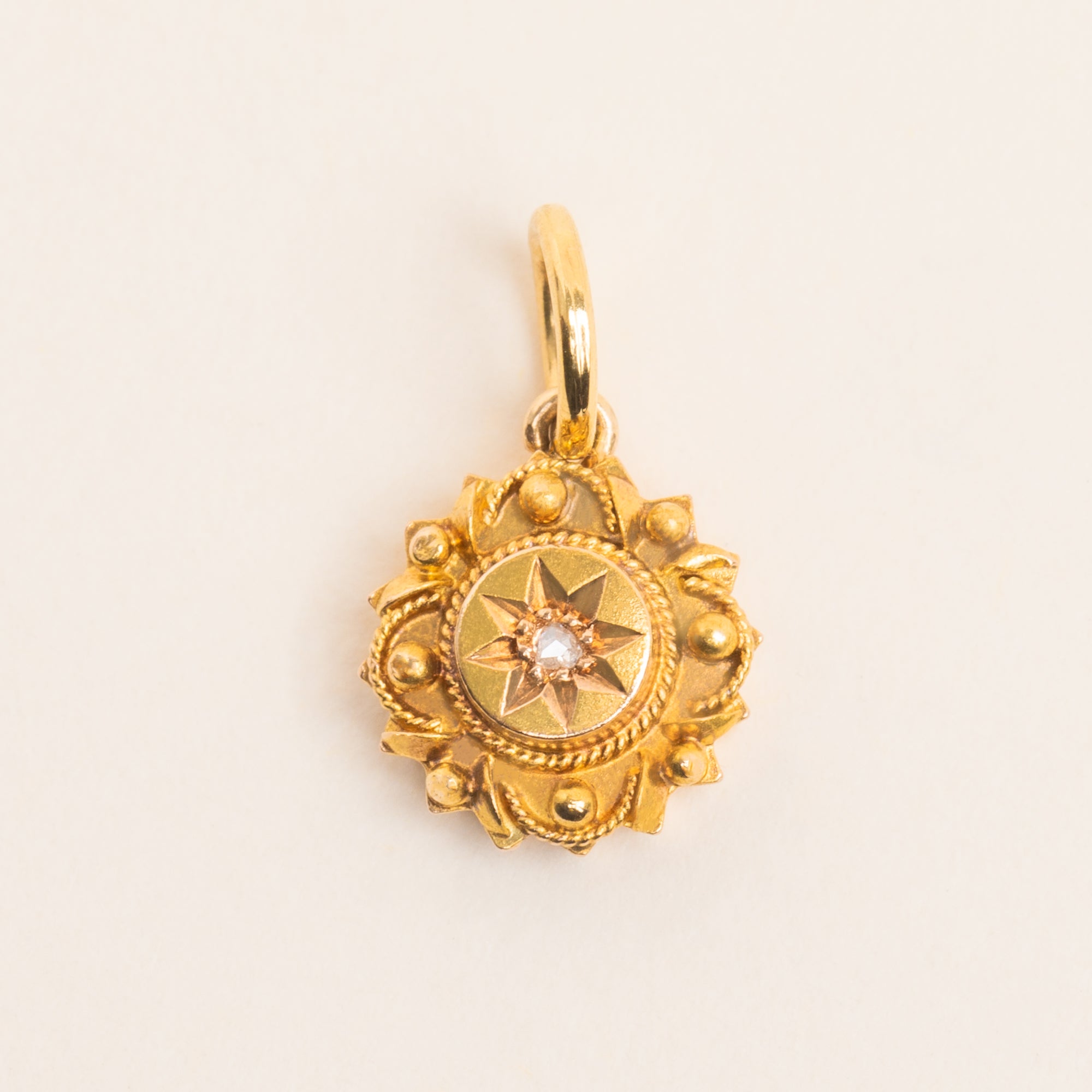 Add a touch of celestial charm to your outfit with this antique 18ct Gold rose-cut Diamond Etruscan charm!