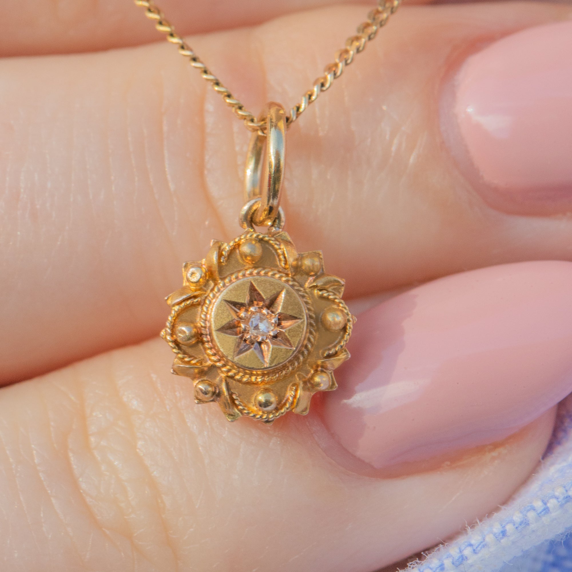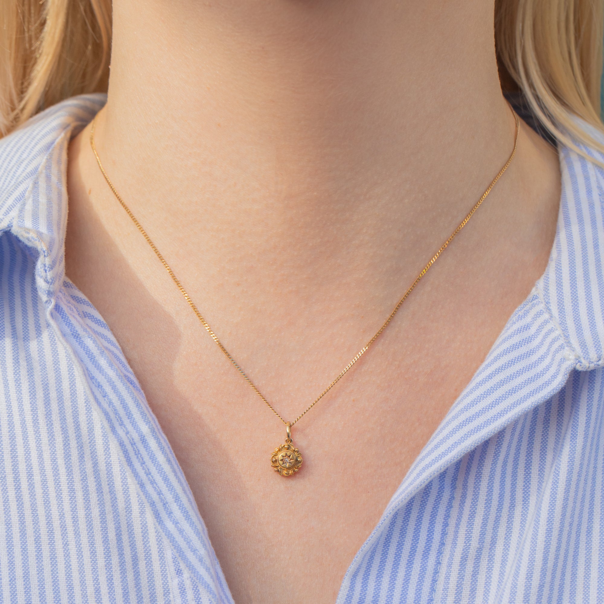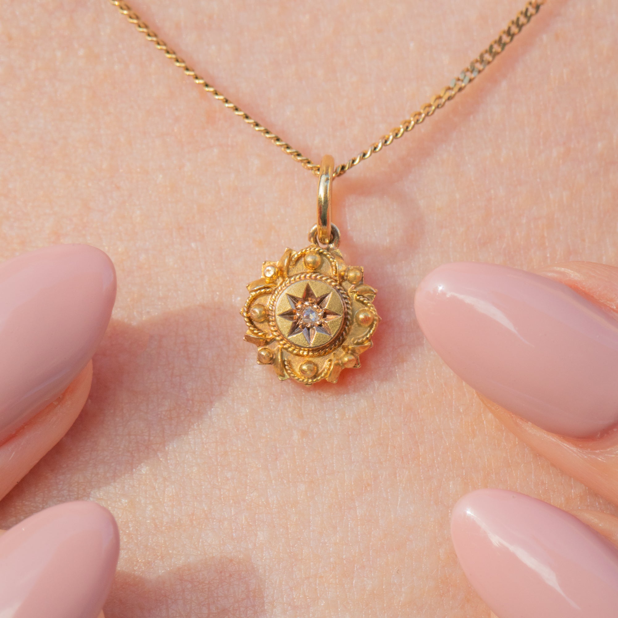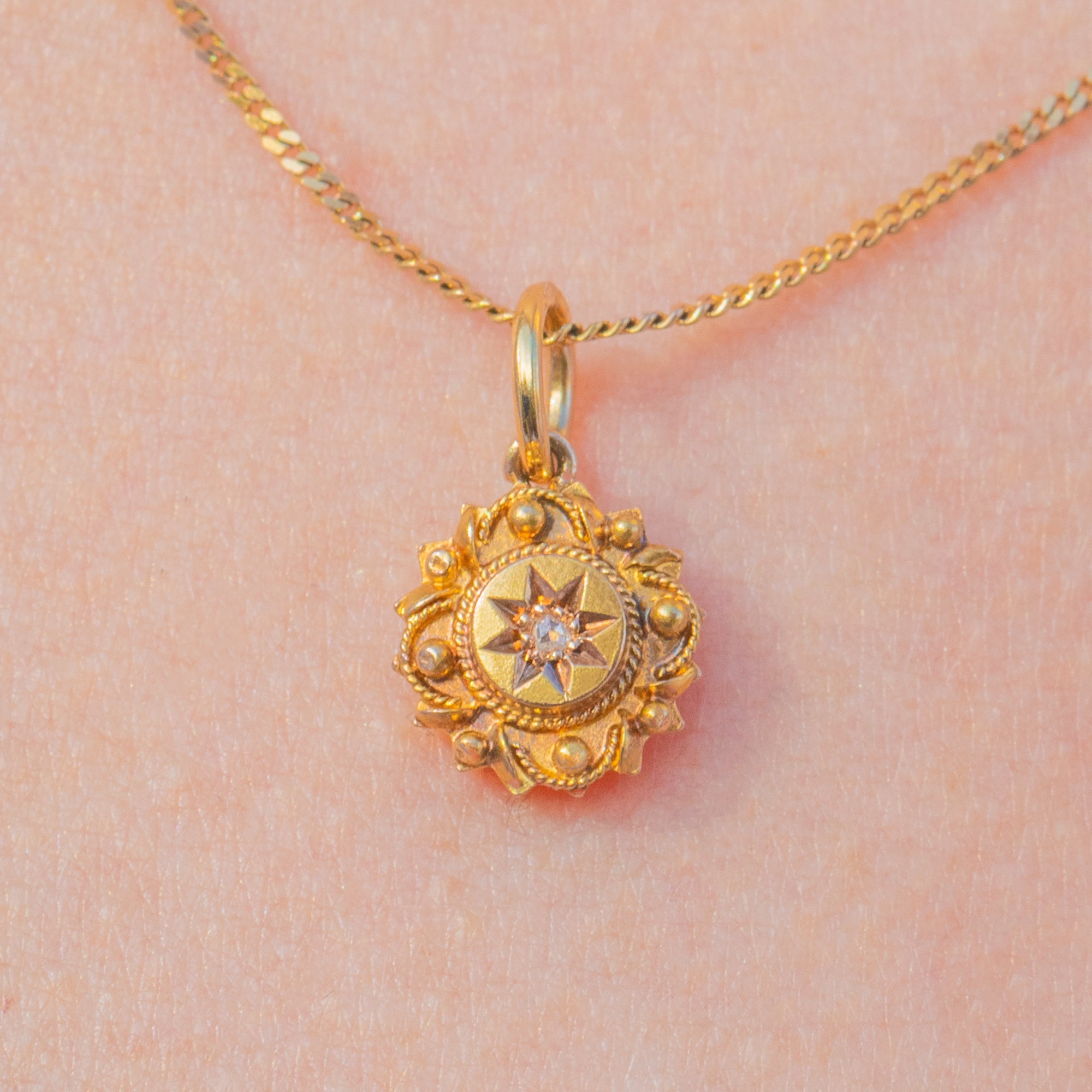 Crafted from buttery 18ct Gold, this Victorian pendant showcases a star-set twinkling rose-cut Diamond at her centre surrounded by intricate details for a refined finish; this Etruscan beauty will feel right at home in your jewellery box!