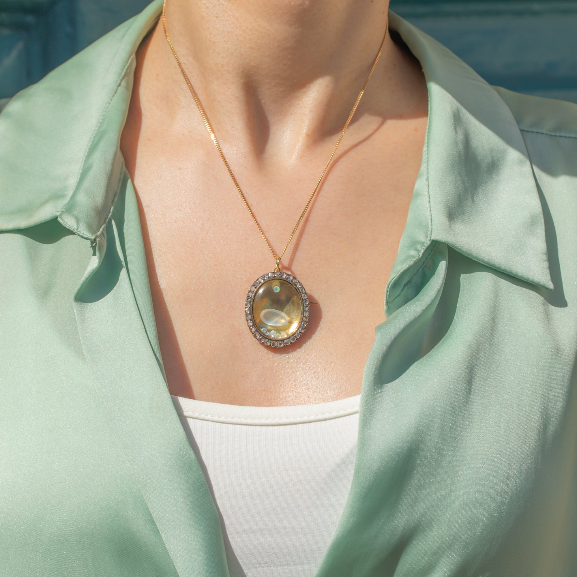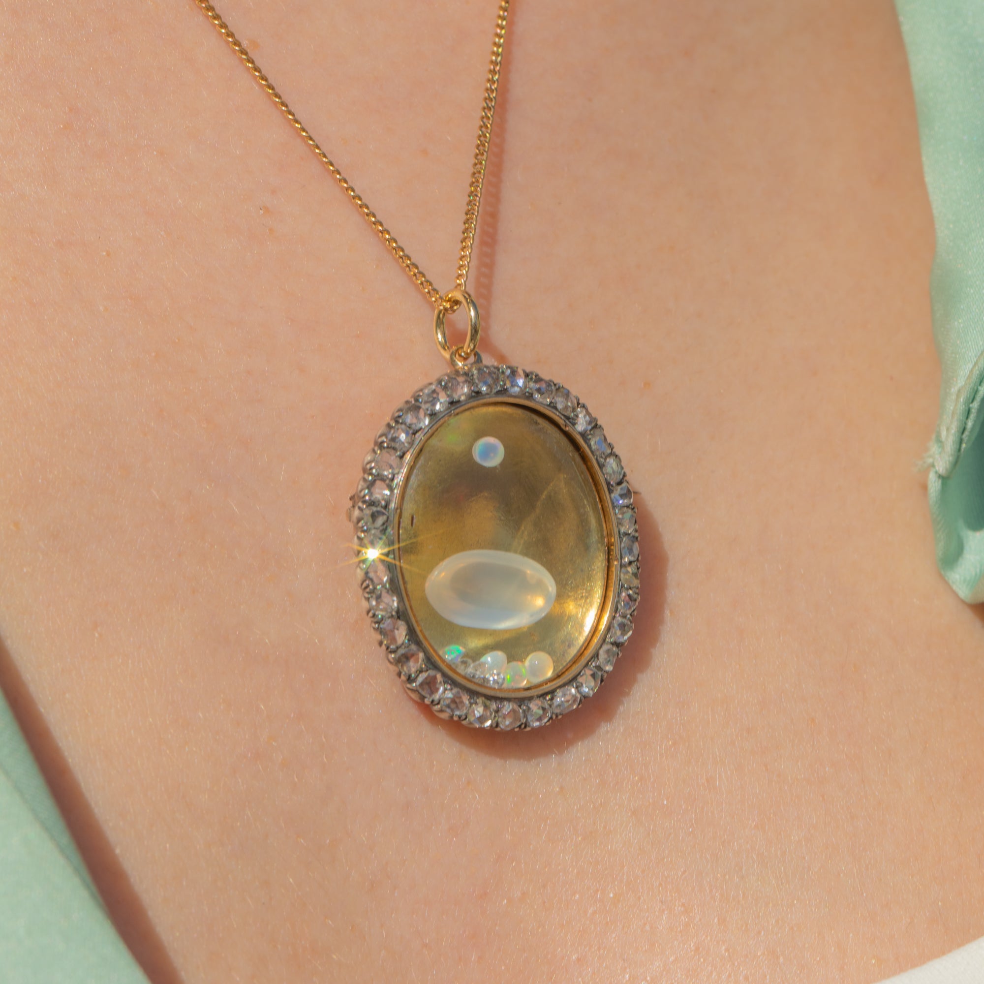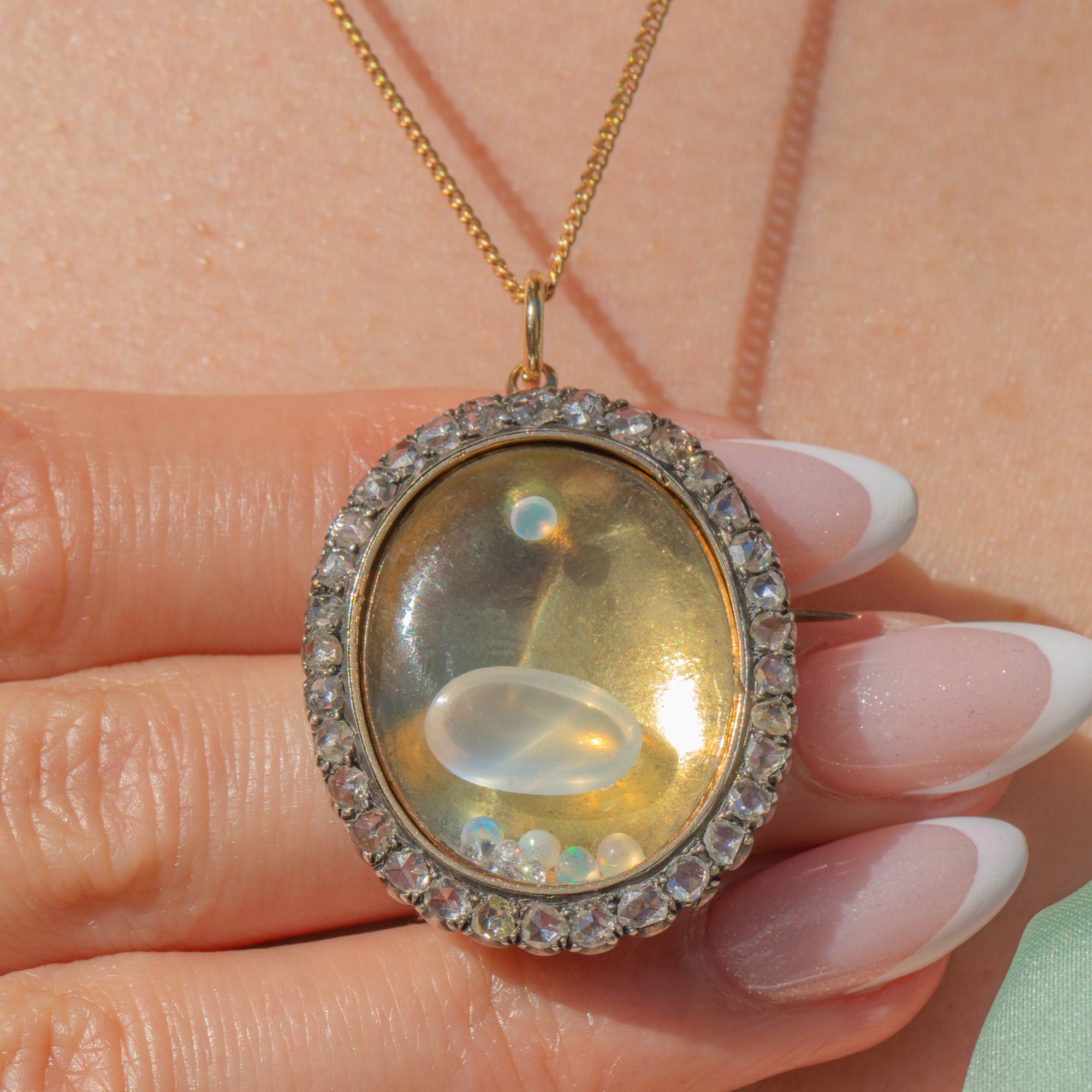 A generous sprinkling of rose-cut Diamonds wraps around the locket compartment, which is filled with loose Opals, Diamonds, and a large Moonstone cabochon, enhanced by the bright Golden backdrop. The locket can be opened and its contents added to or replaced, worn as either a pendant or a brooch- the styling possibilities are endless!